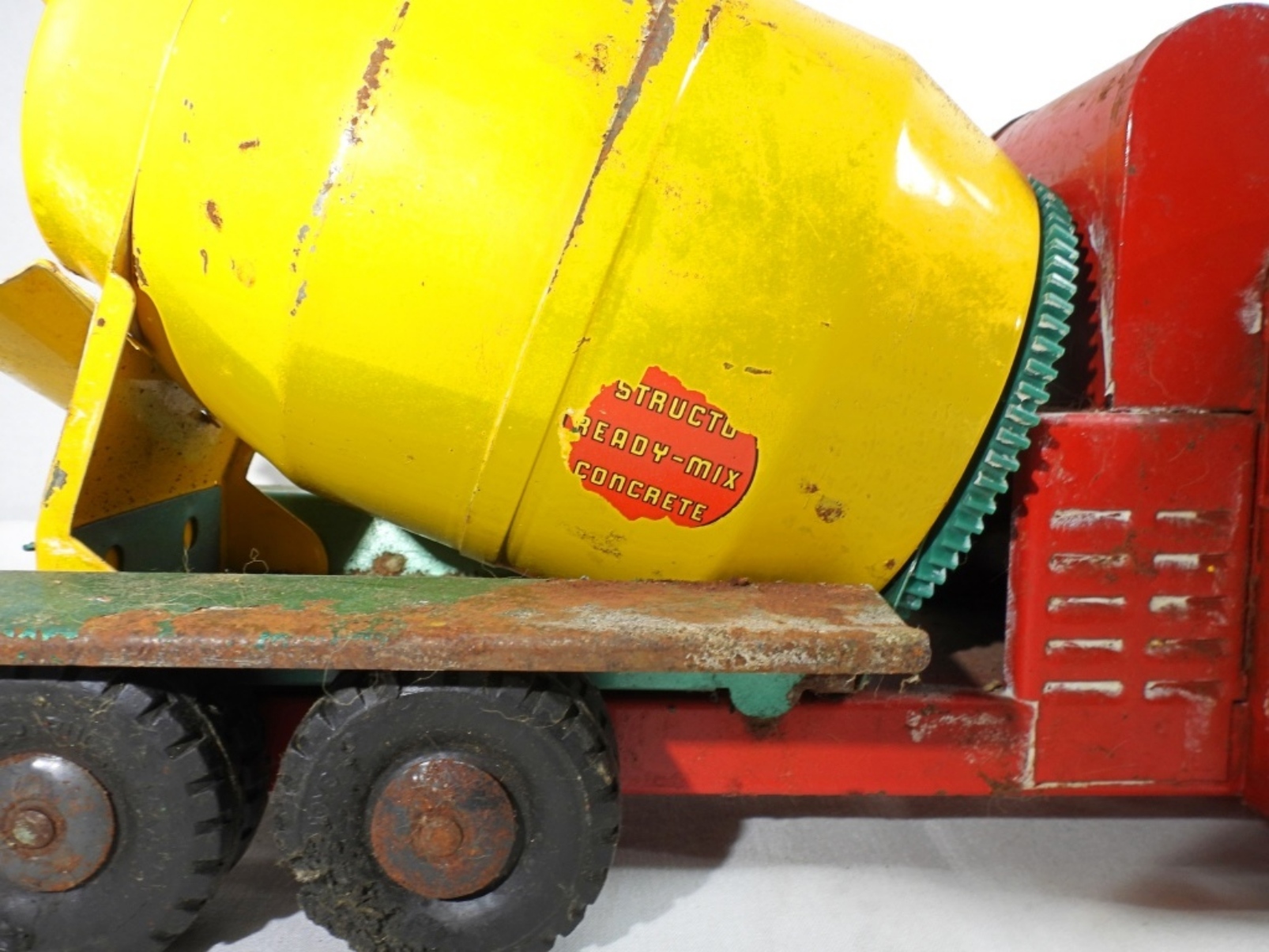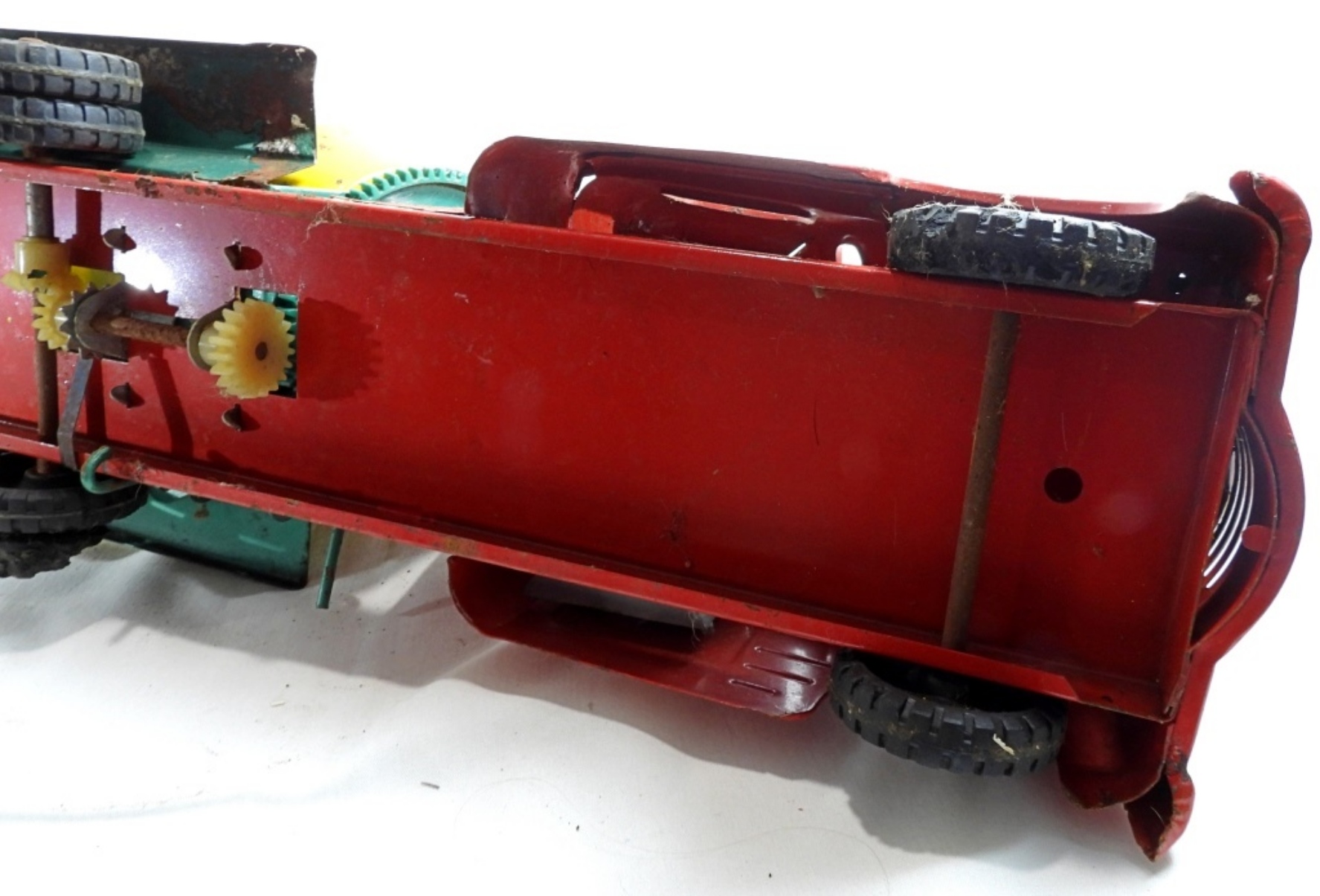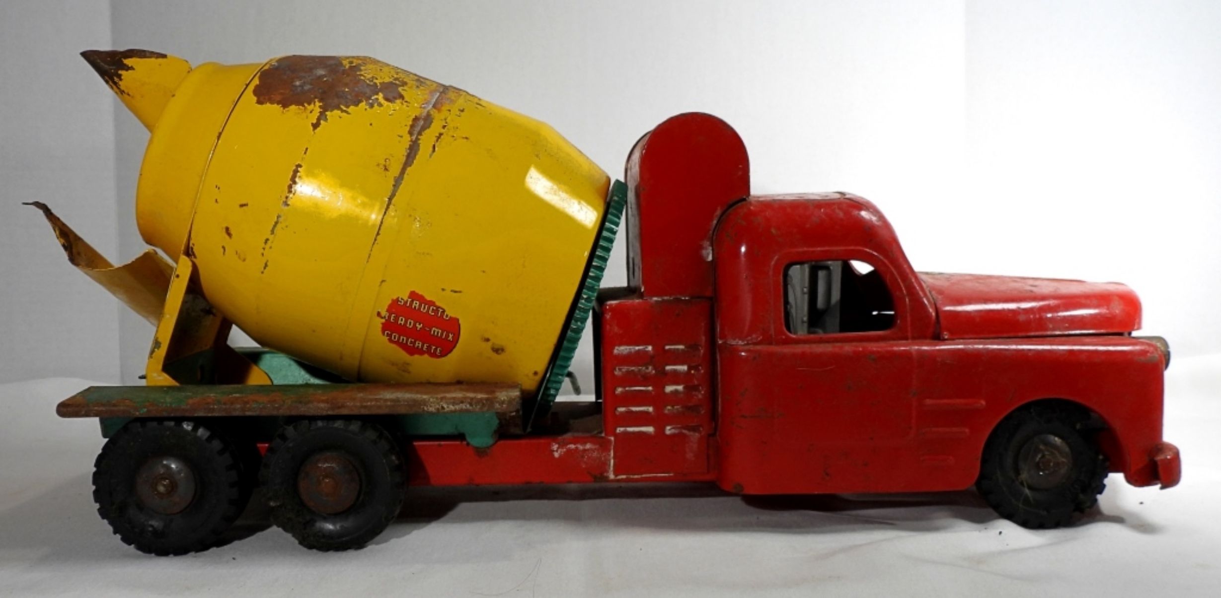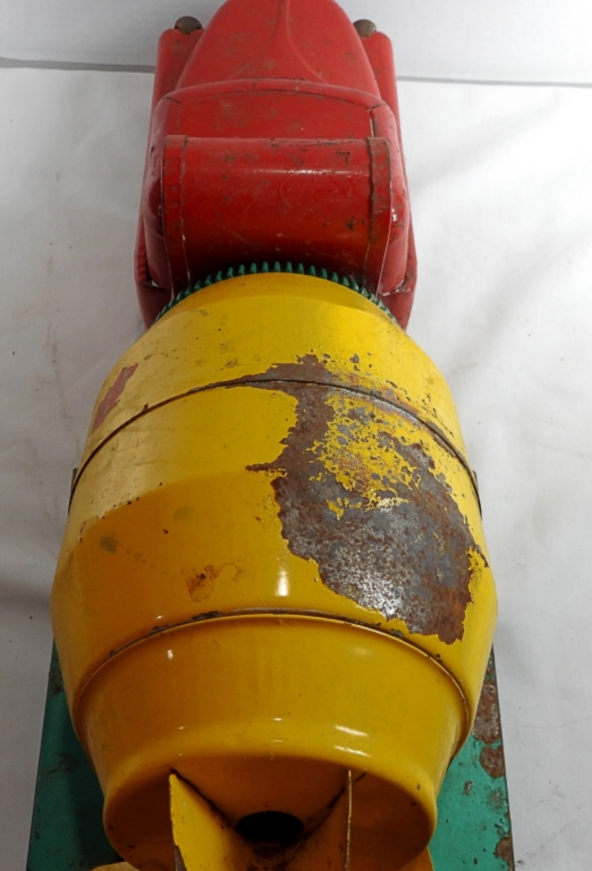 1950s-1960s, 21″ die cast, pressed steel metal, featuring a red, yellow, and green color scheme, there is missing paint and partially missing stickers, rust all over, all wheels are present but some are missing