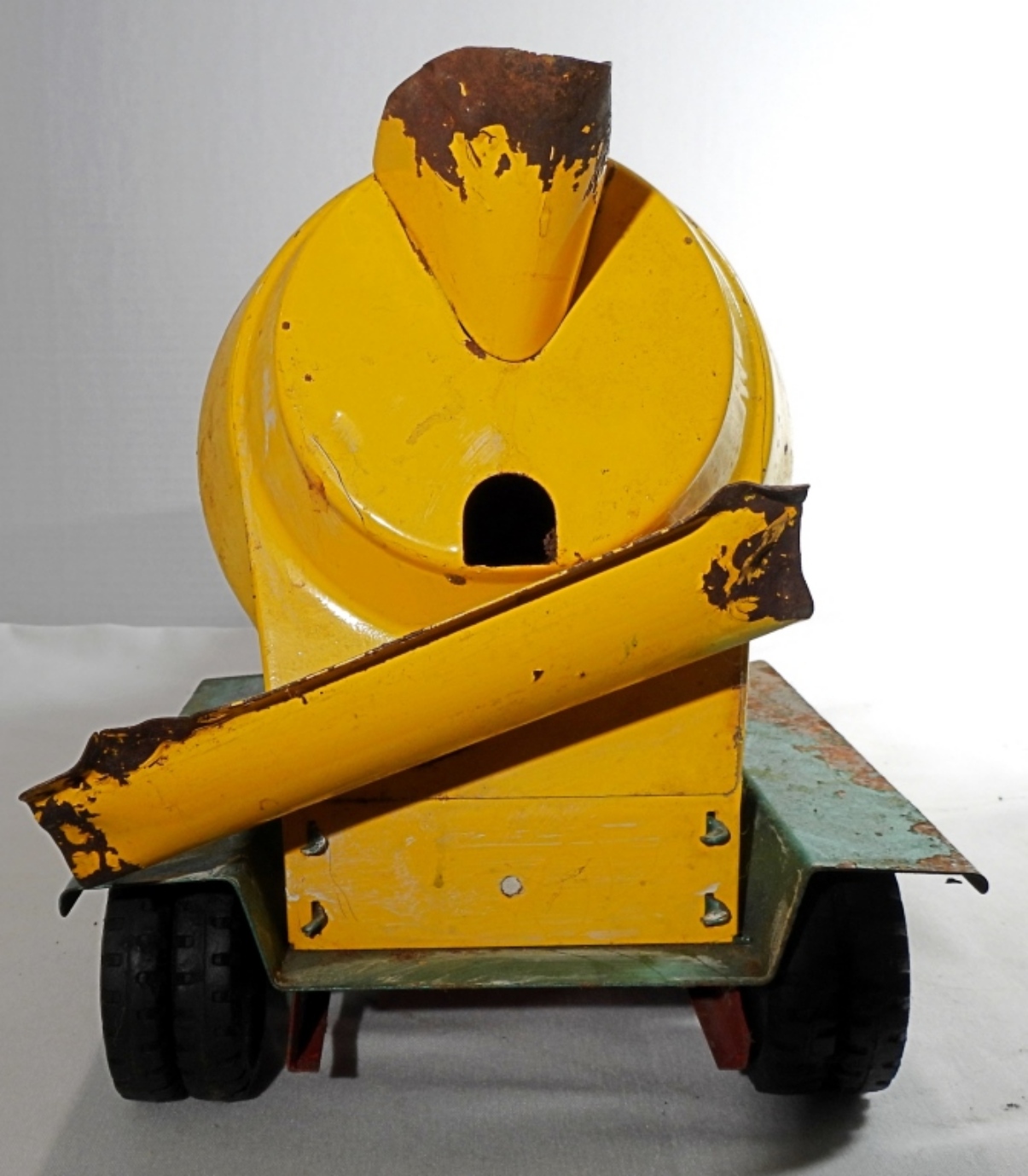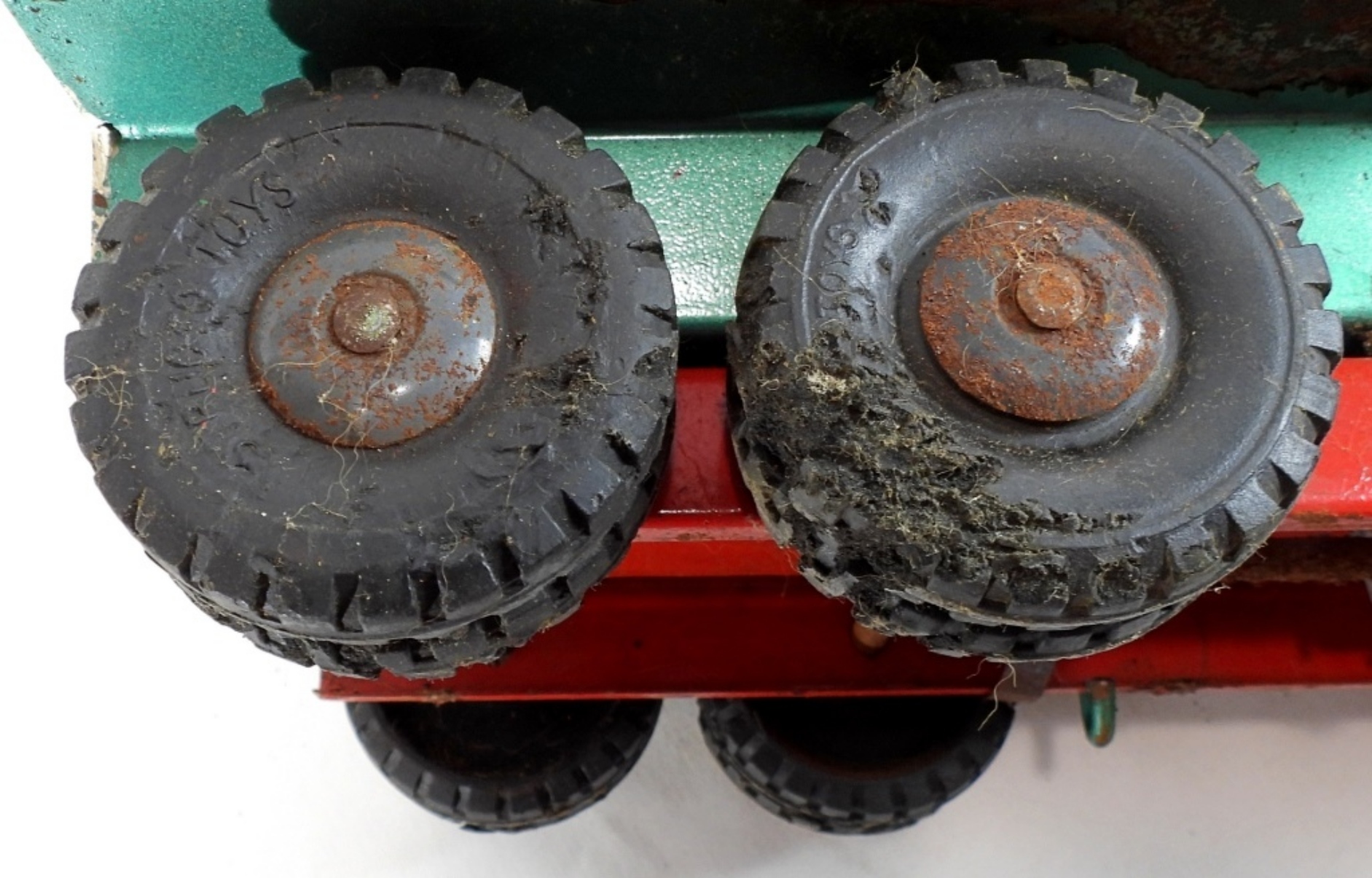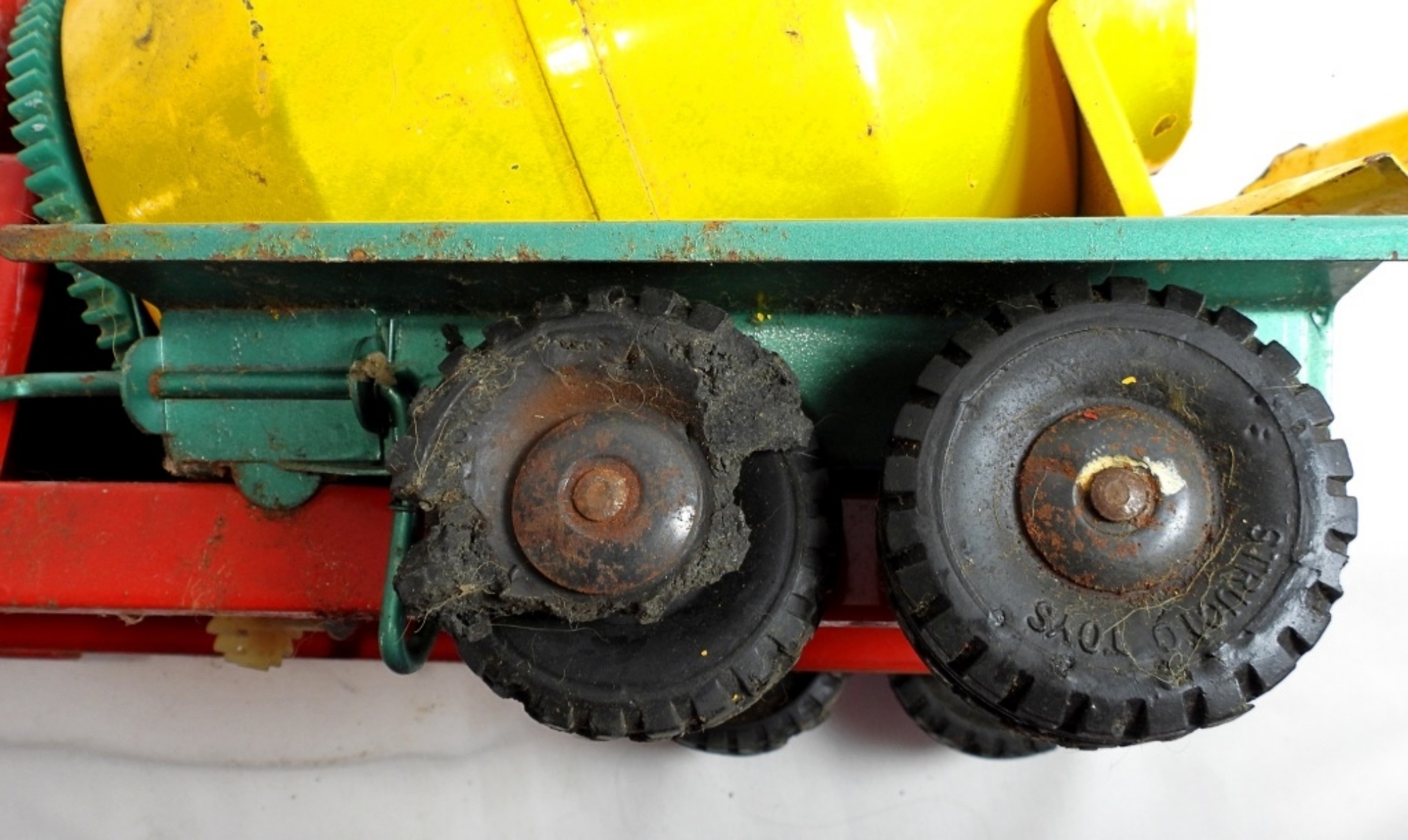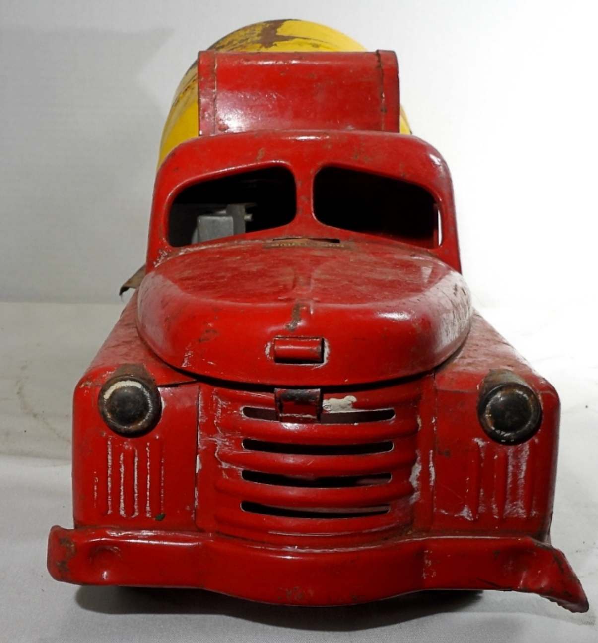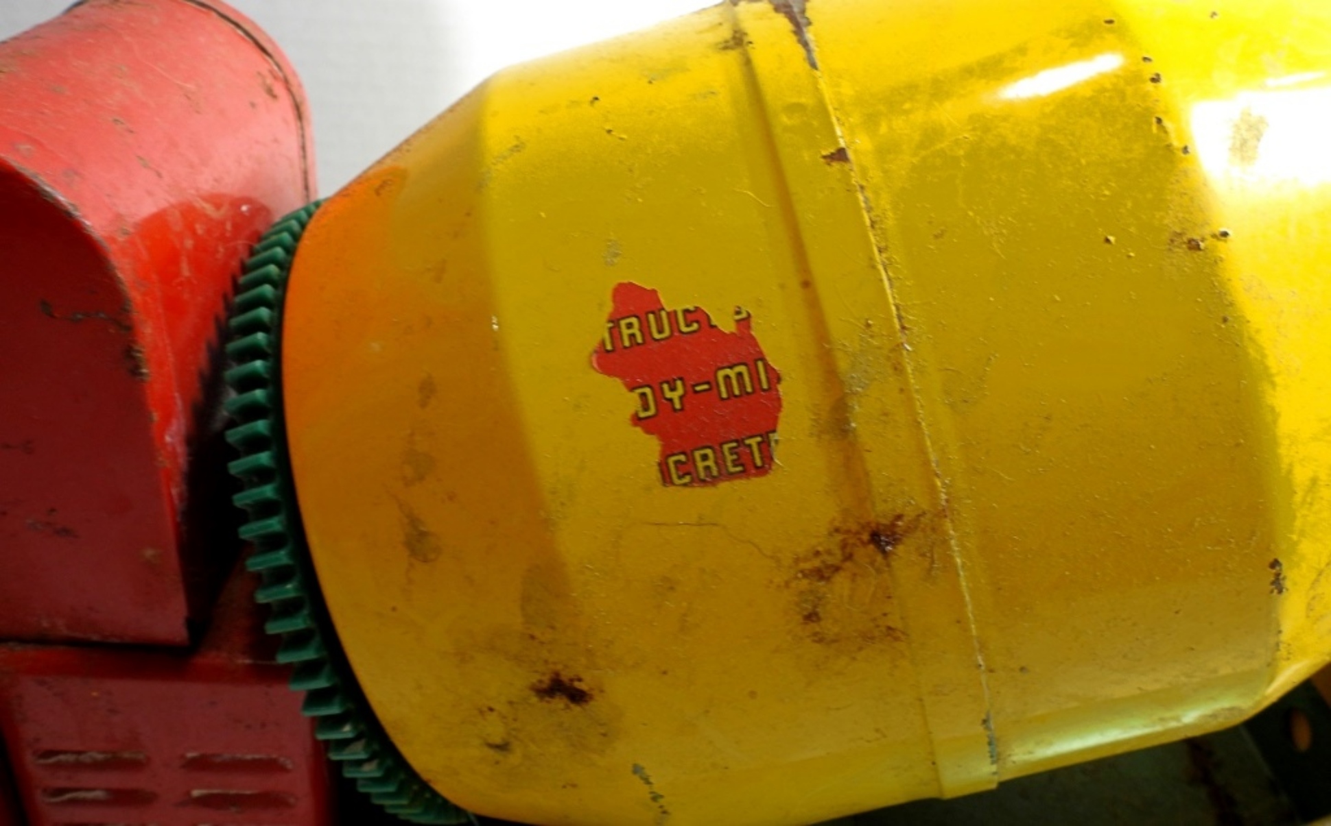 1950s-1960s, 21″ die cast, pressed steel metal, featuring a red, yellow, and green color scheme, there is missing paint and partially missing stickers, rust all over, all wheels are present but some are missing