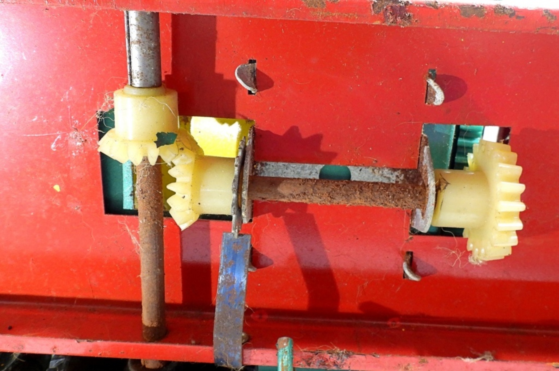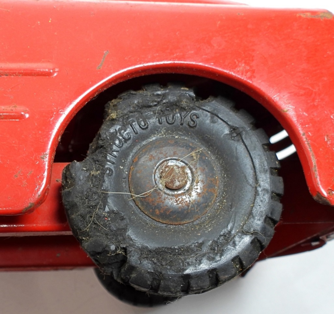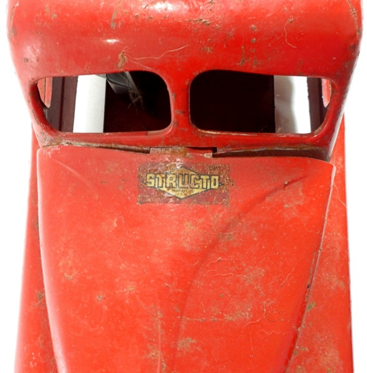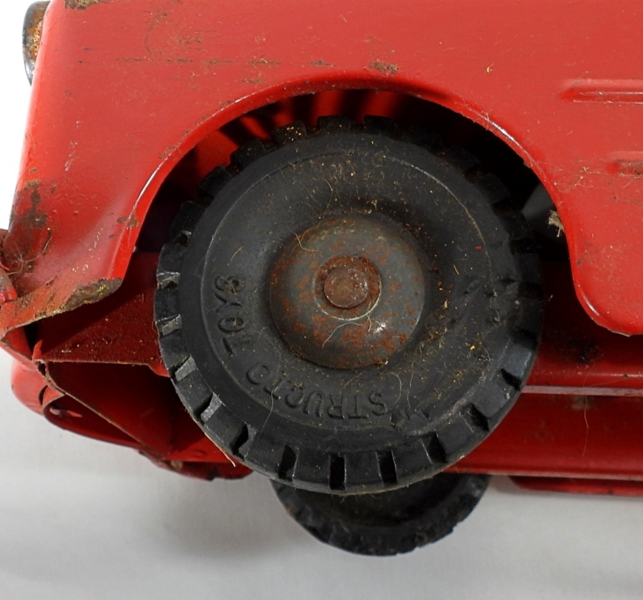 1950s-1960s, 21″ die cast, pressed steel metal, featuring a red, yellow, and green color scheme, there is missing paint and partially missing stickers, rust all over, all wheels are present but some are missing