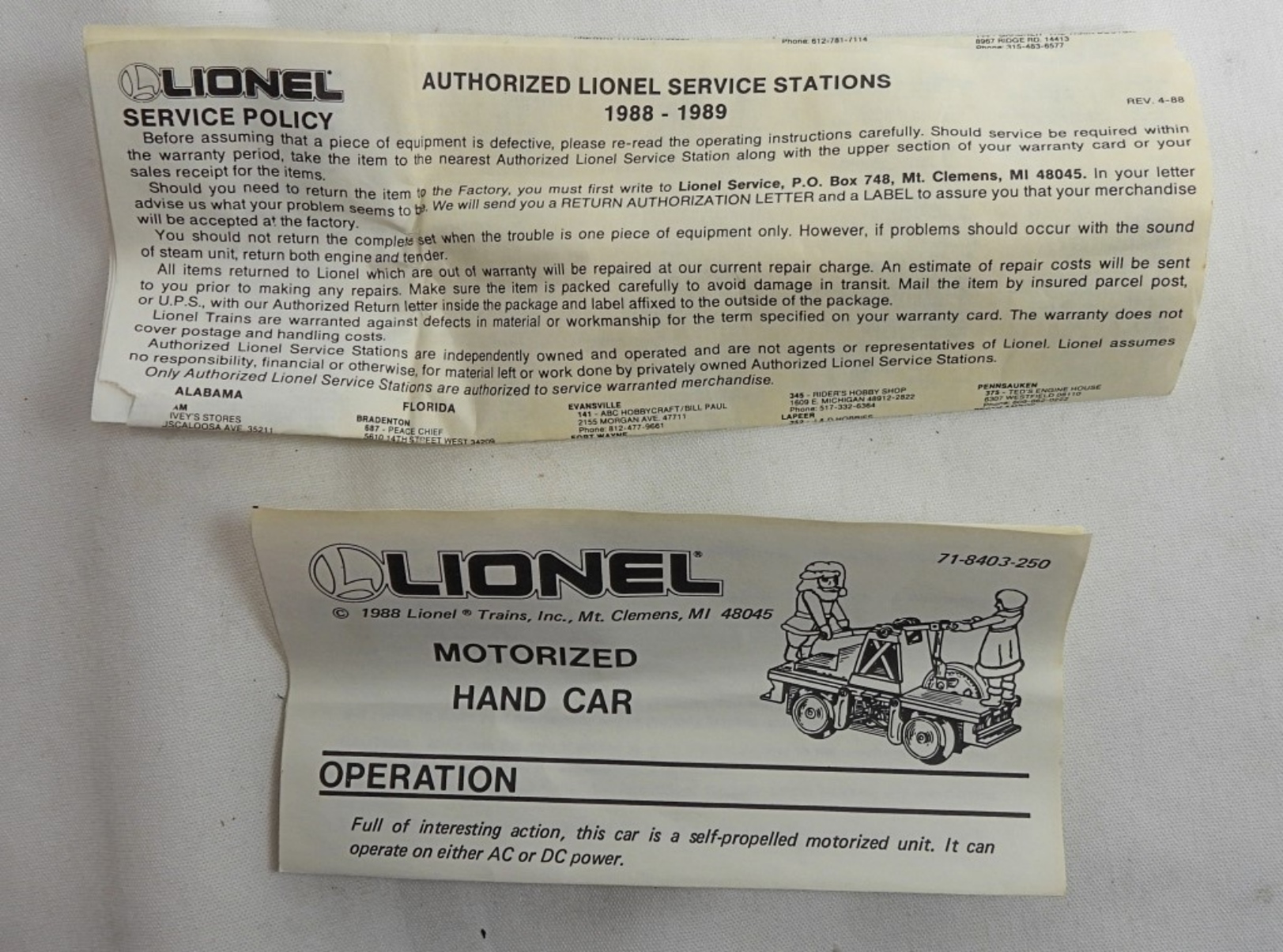 1988, Santa & Mrs. Claus operated hand car, box has some water damage, service policy & maintenance papers are included, untested needs lubricant