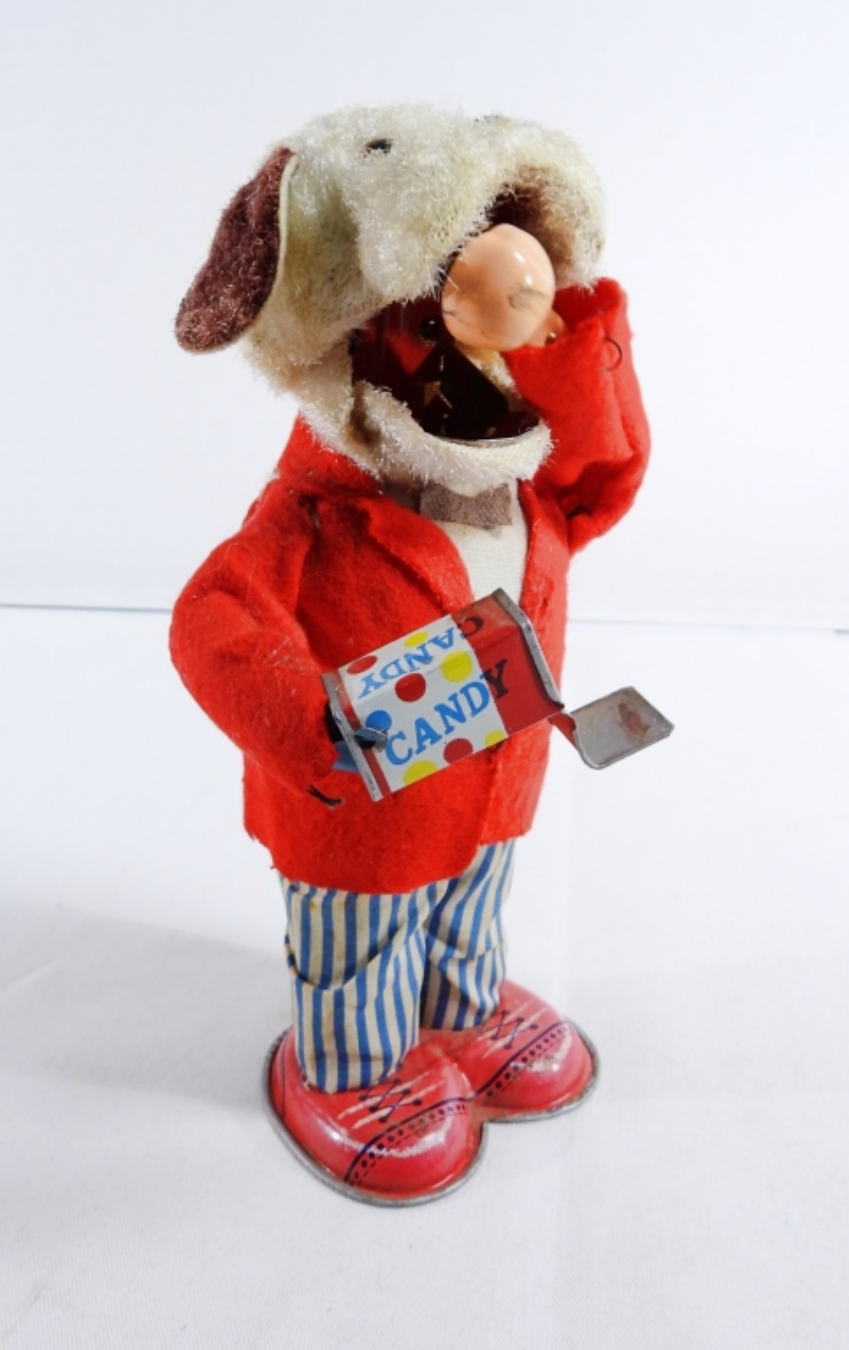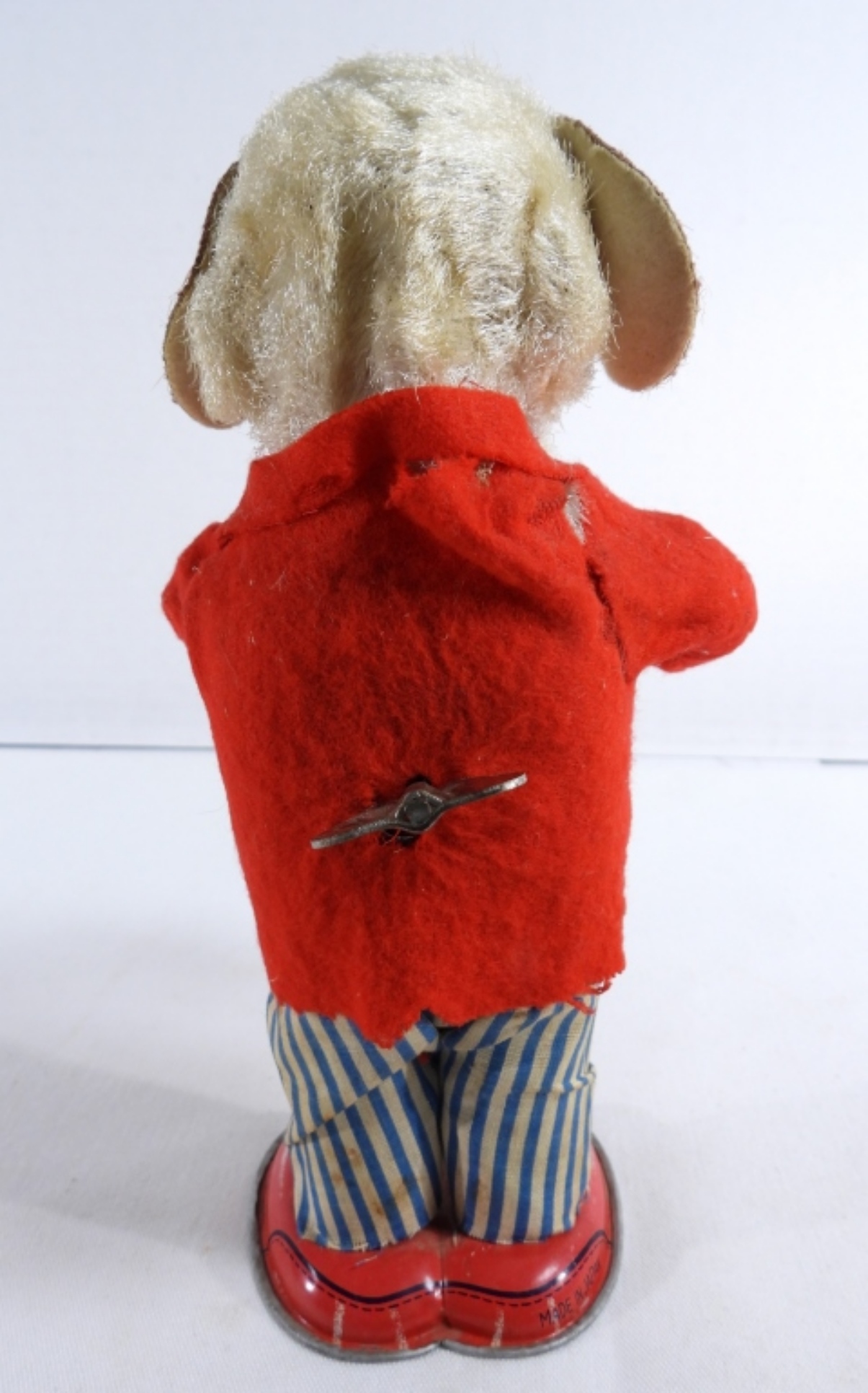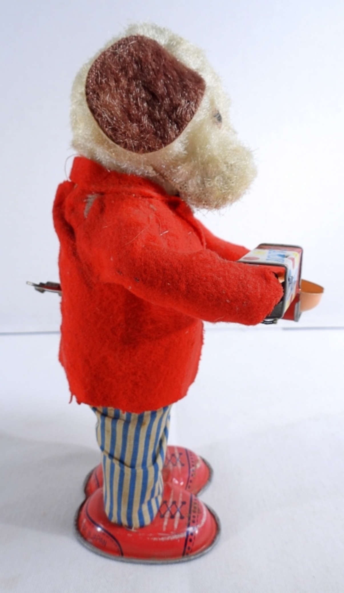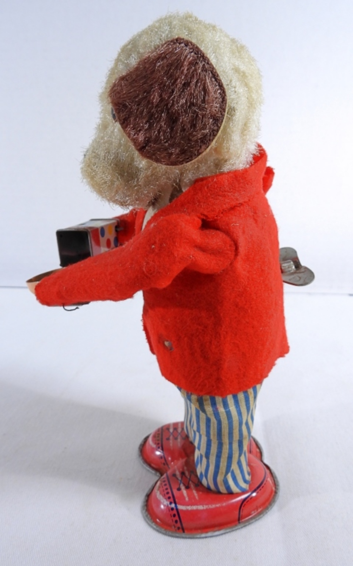 1950, Litho tin toy made in Japan. Still winds up and works. It does have burnt marks on the front of the coat, along with some rips on the back of the coat and stains on the pants