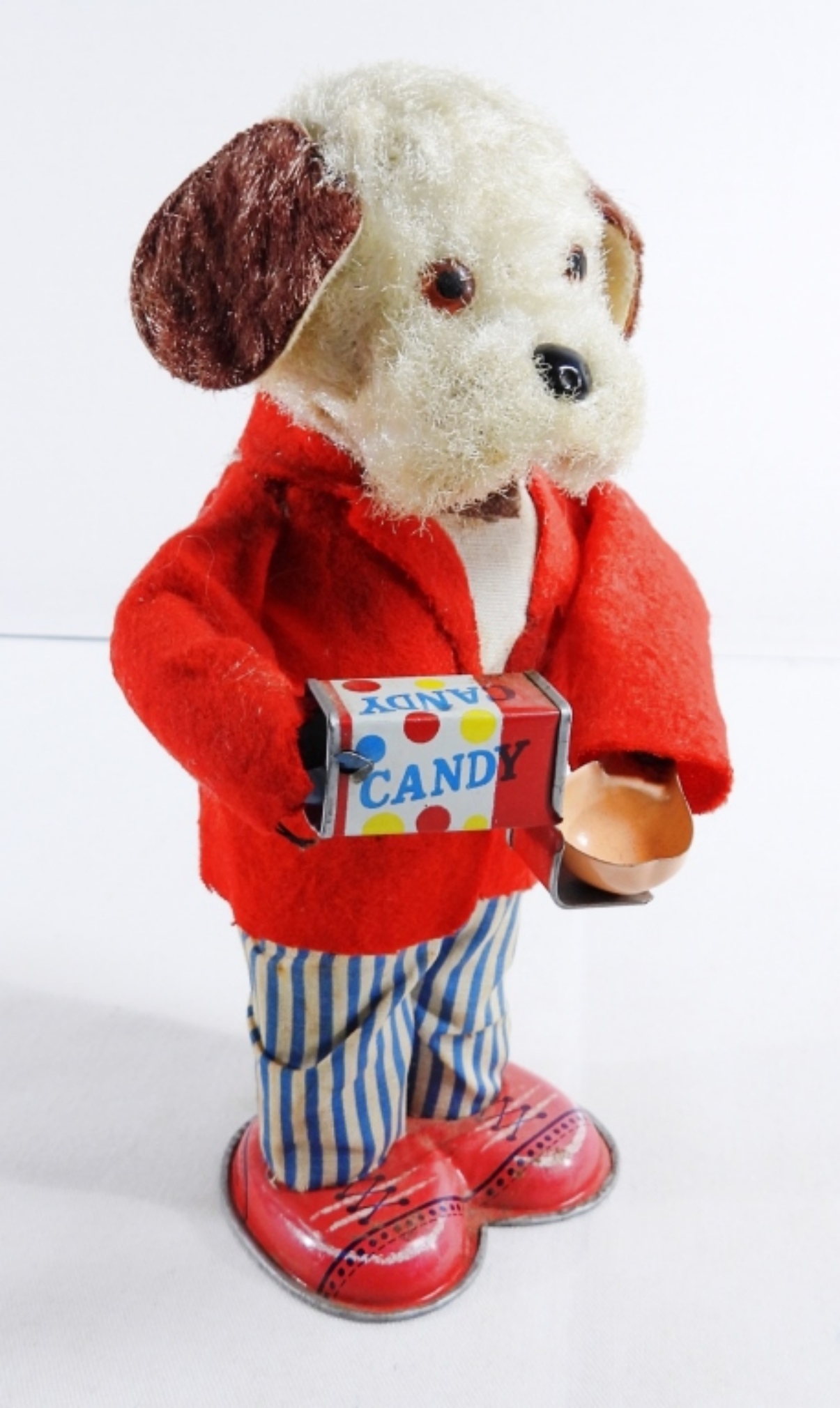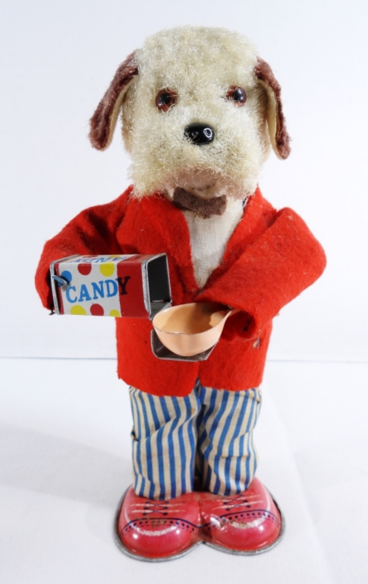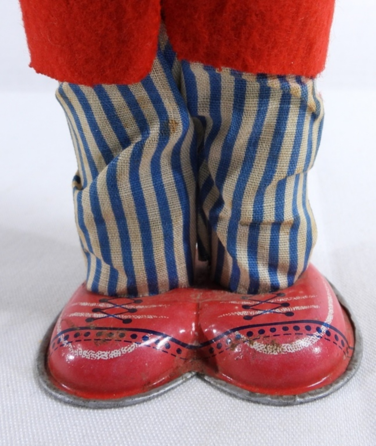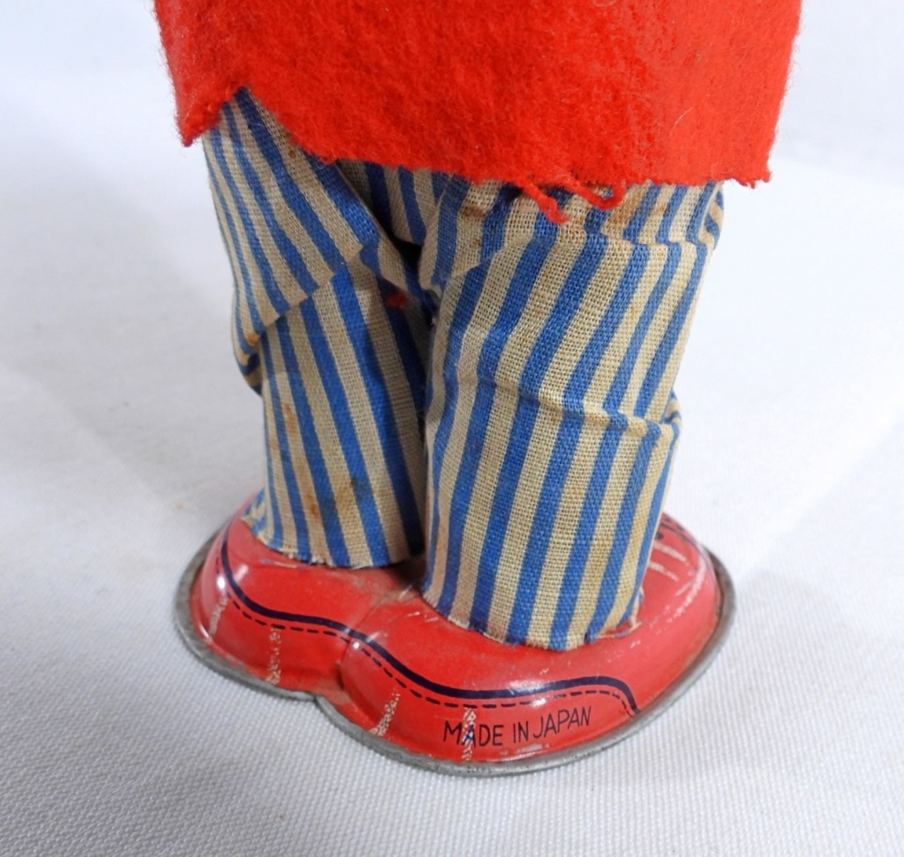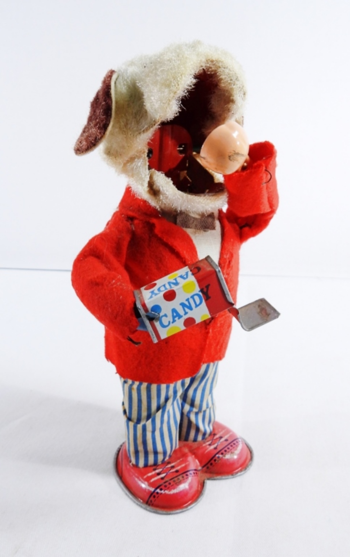 1950, Litho tin toy made in Japan. Still winds up and works. It does have burnt marks on the front of the coat, along with some rips on the back of the coat and stains on the pants