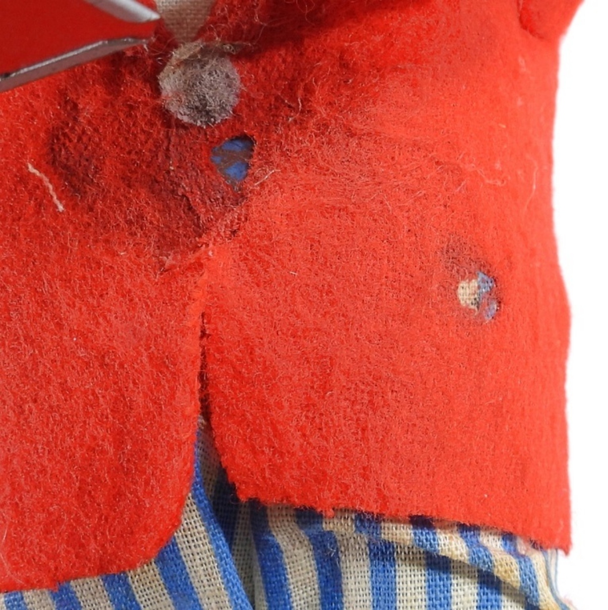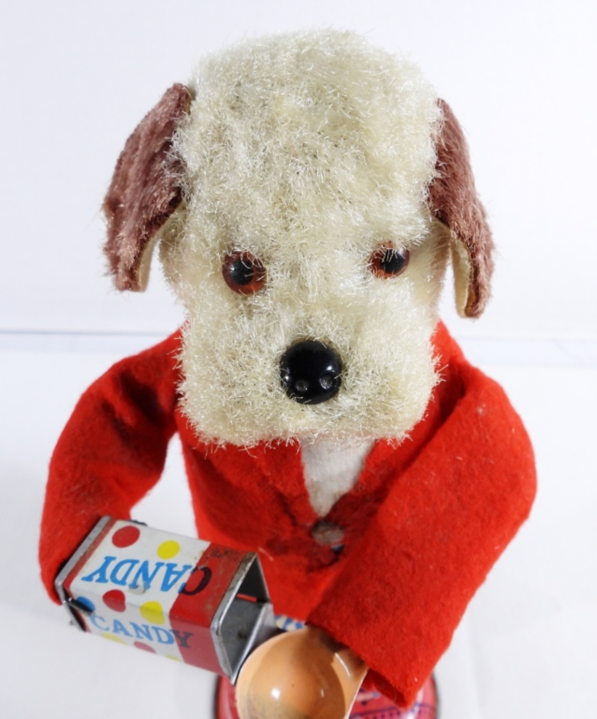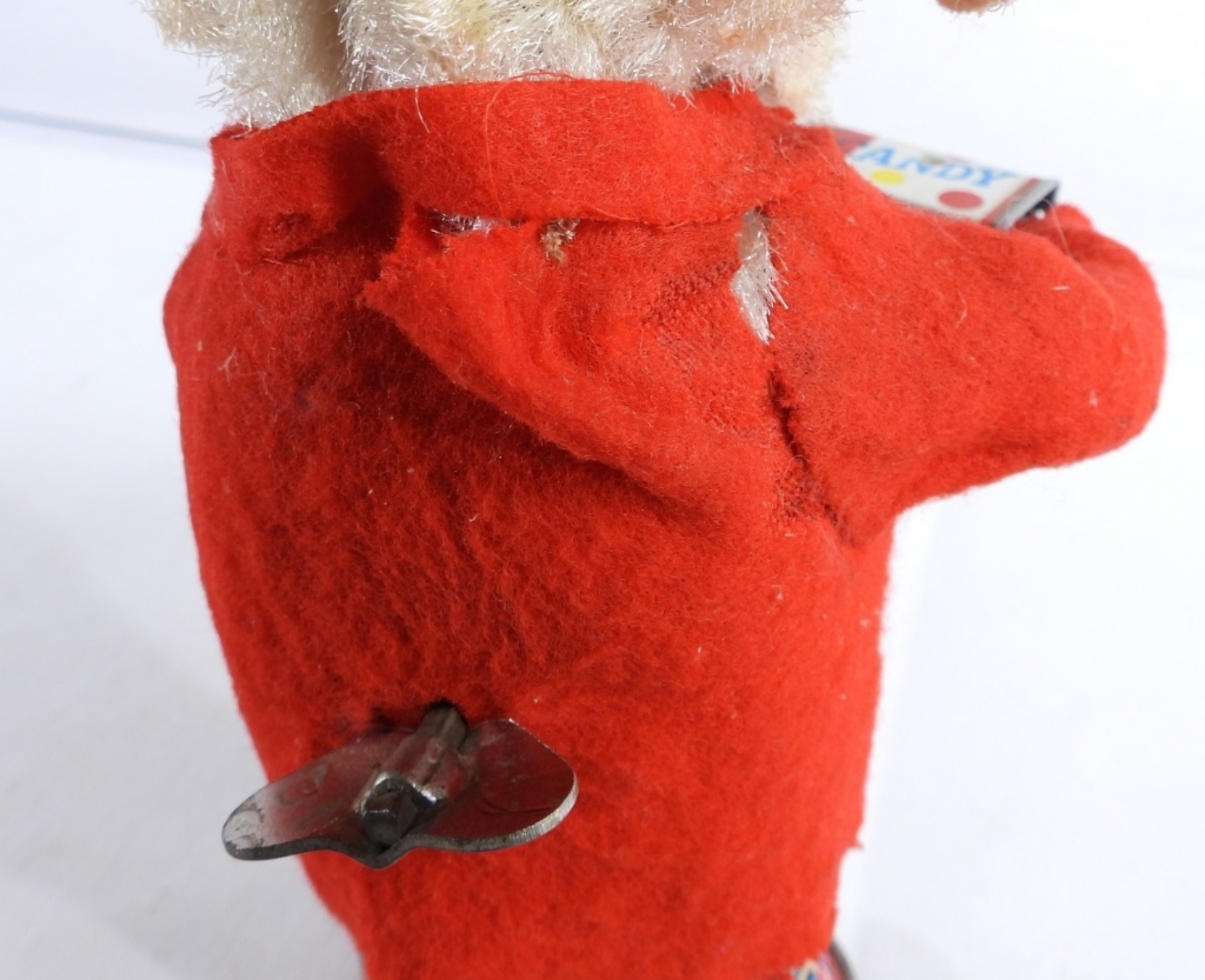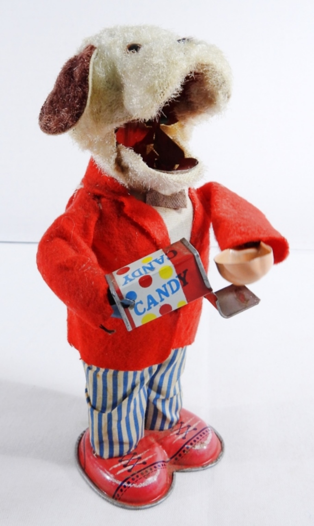 1950, Litho tin toy made in Japan. Still winds up and works. It does have burnt marks on the front of the coat, along with some rips on the back of the coat and stains on the pants