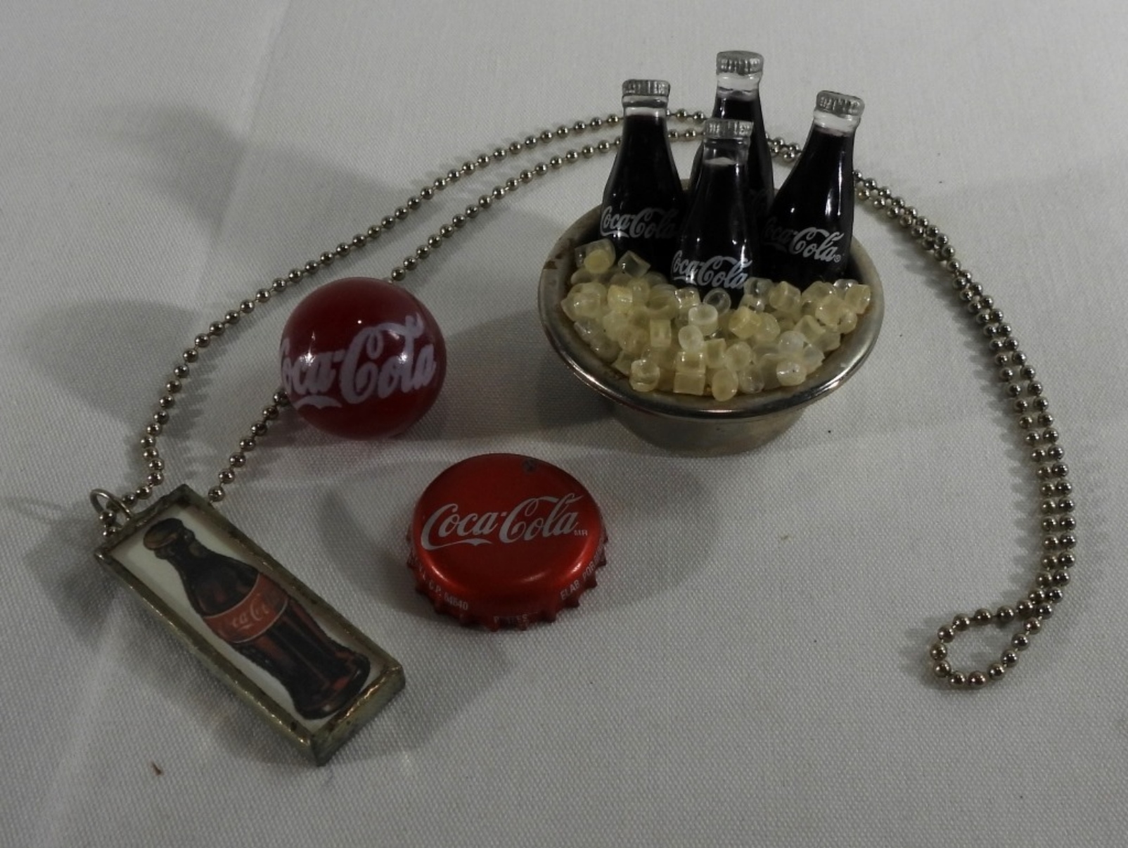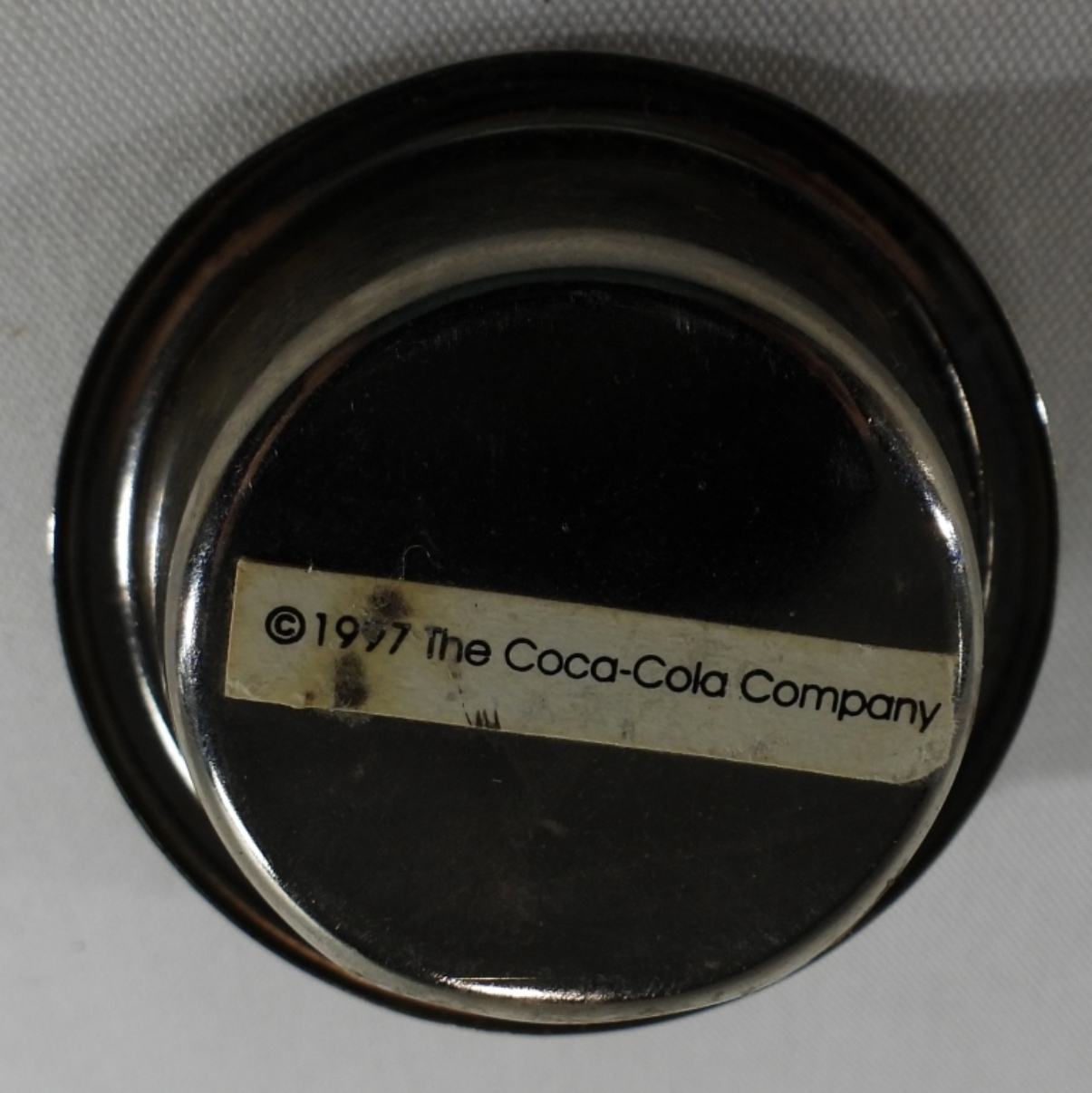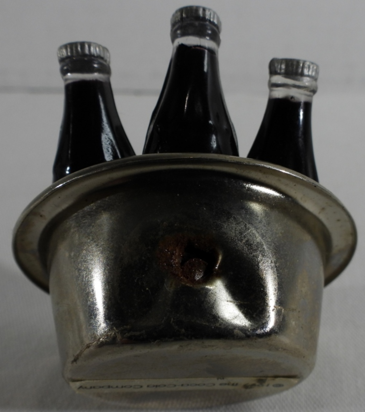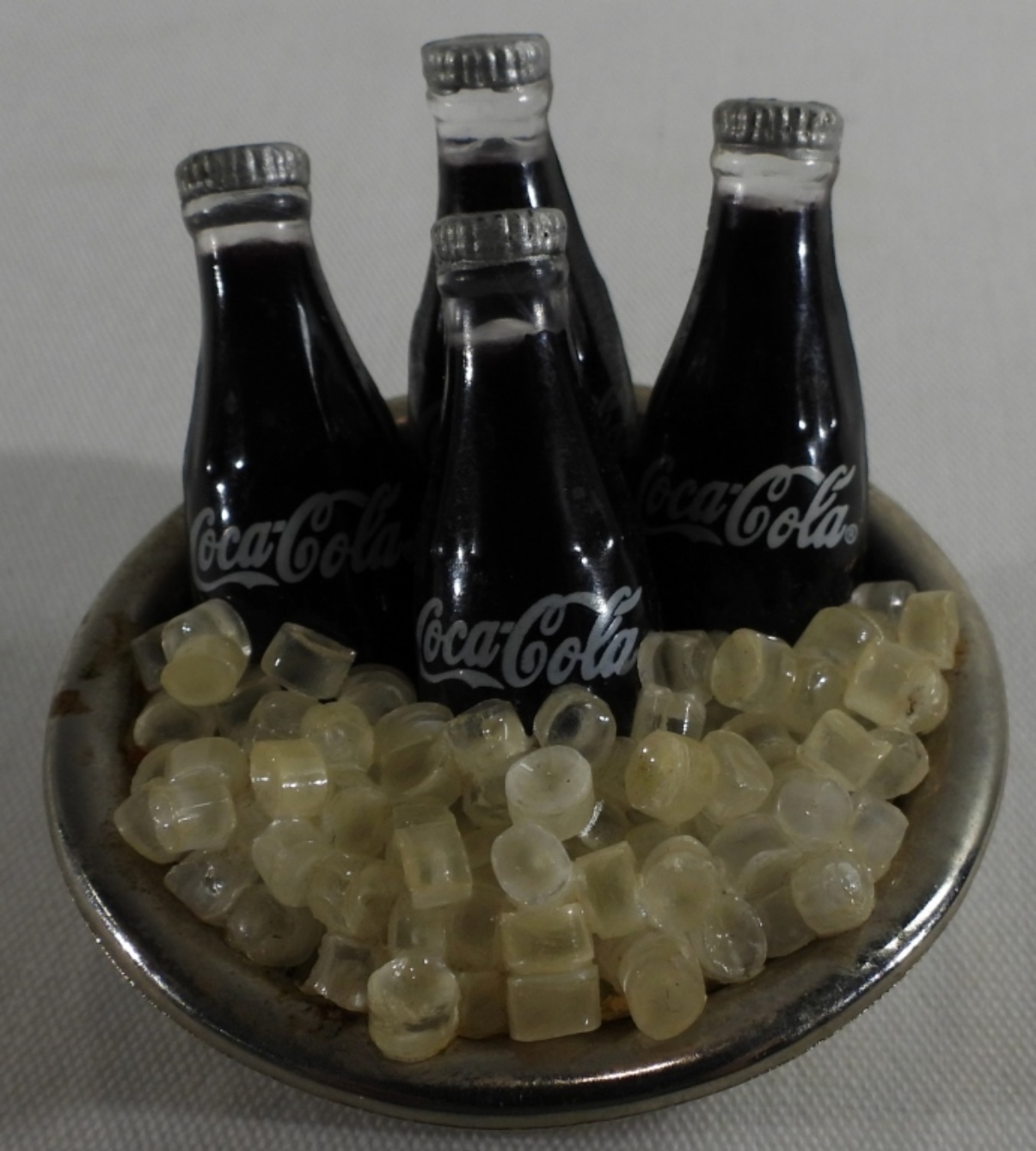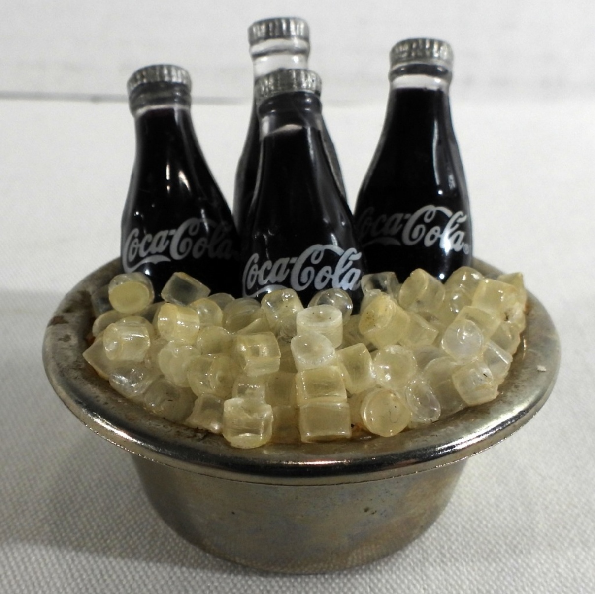 1997 Coca-Cola, four bottles on ice in a silver tin bowl. For a doll house. The bowl has a small dent and a hole that seems like a nail in it. Small 5-cent red ball, the size of a small gum-ball. Red bottle cap. And a