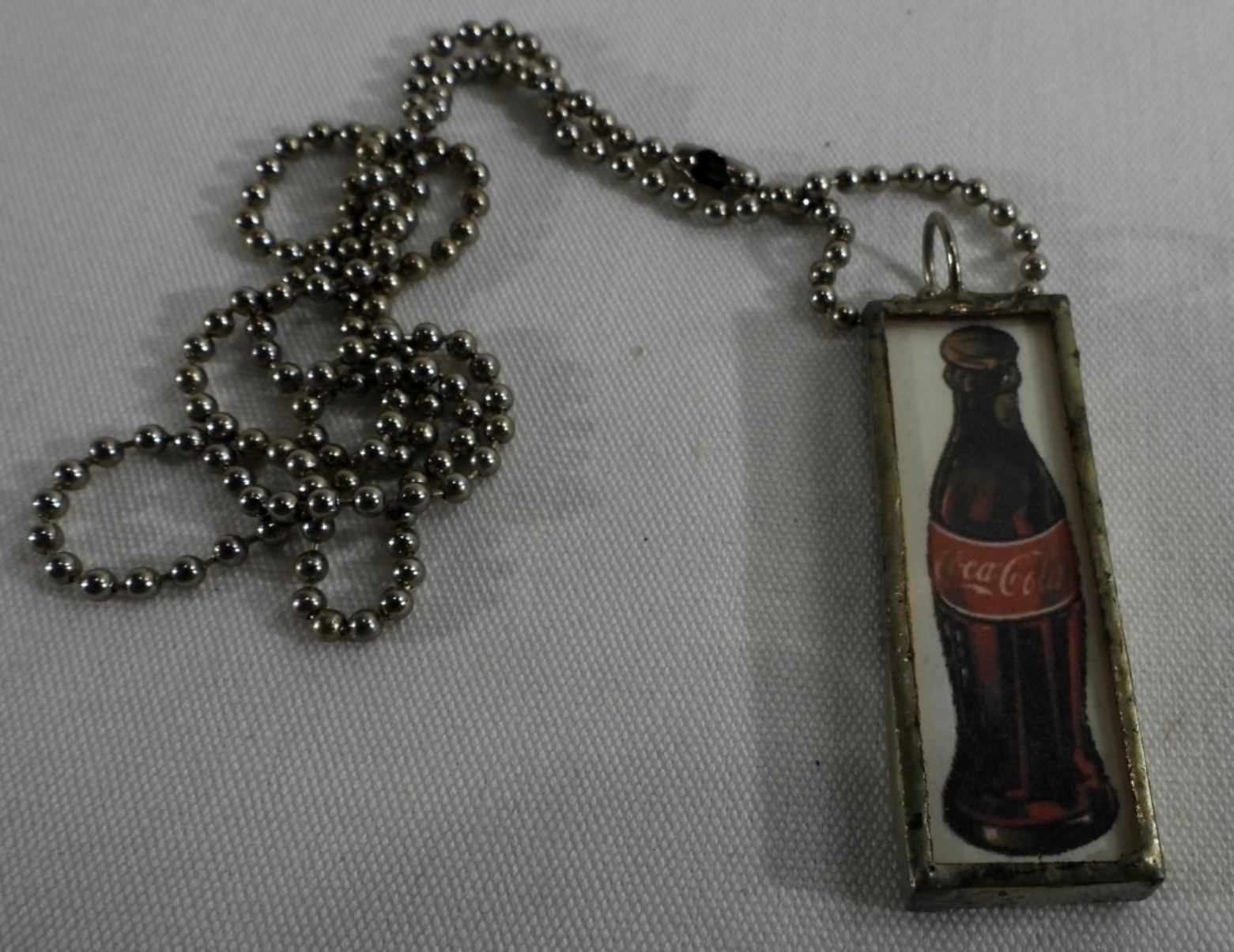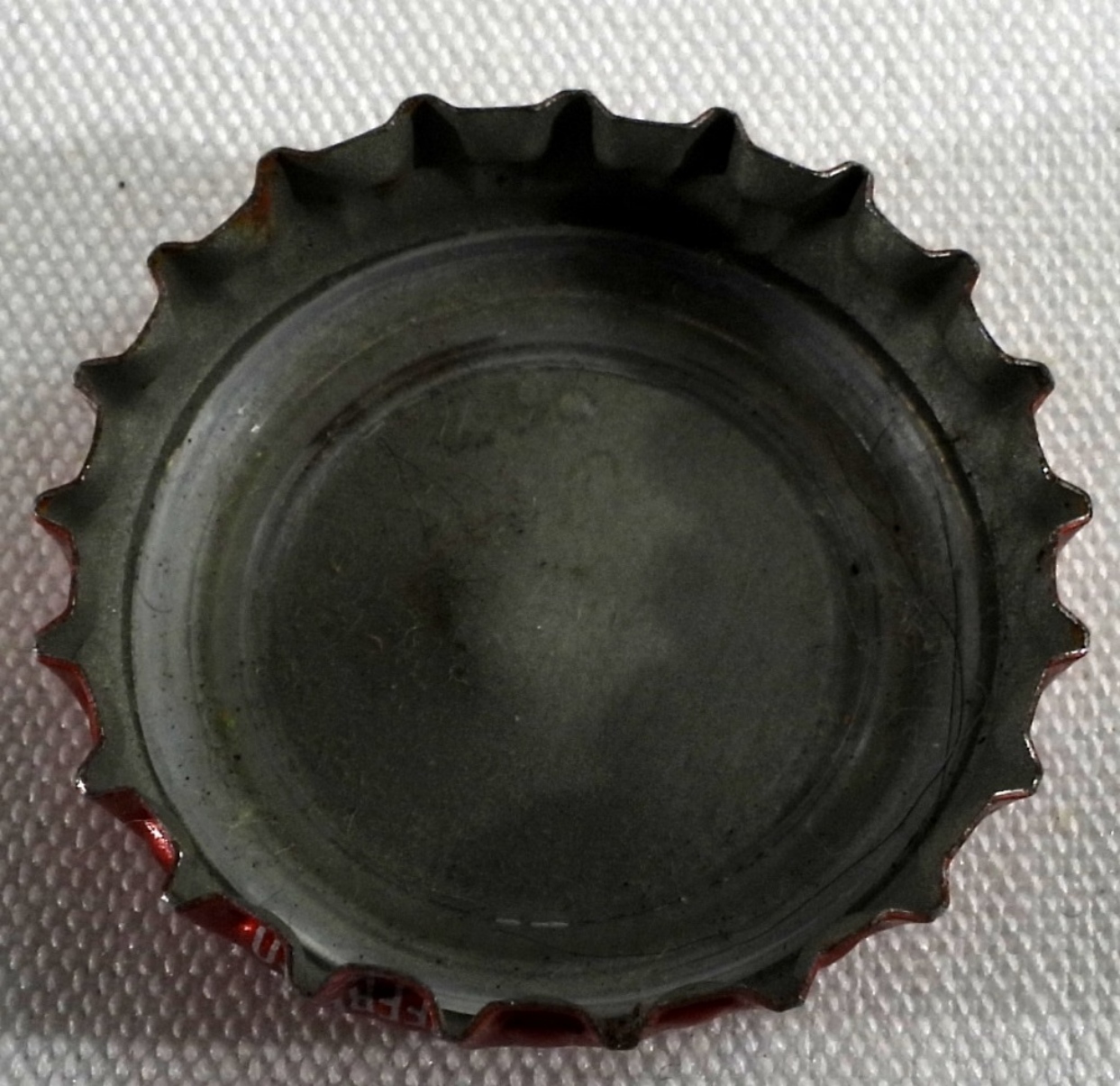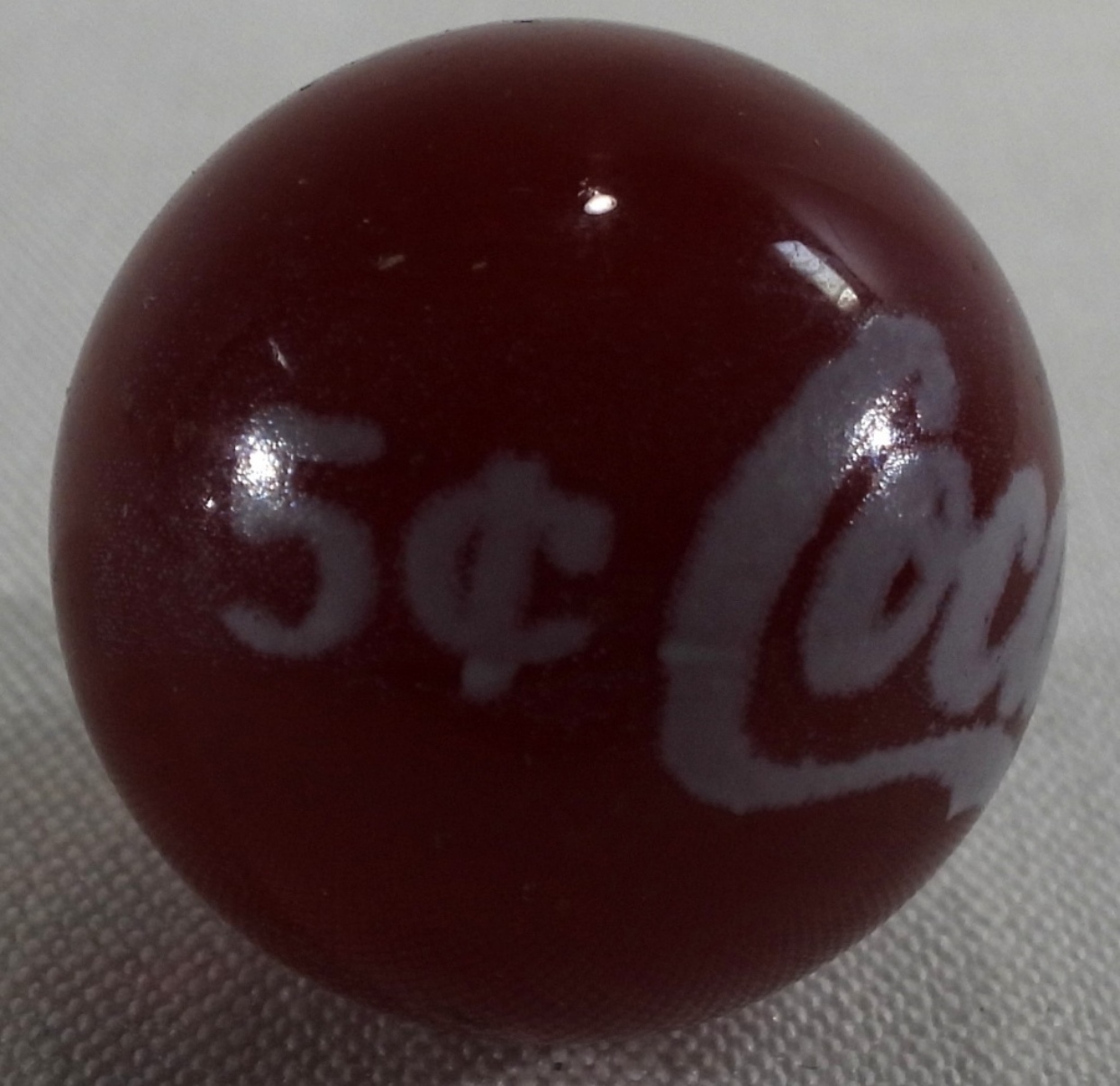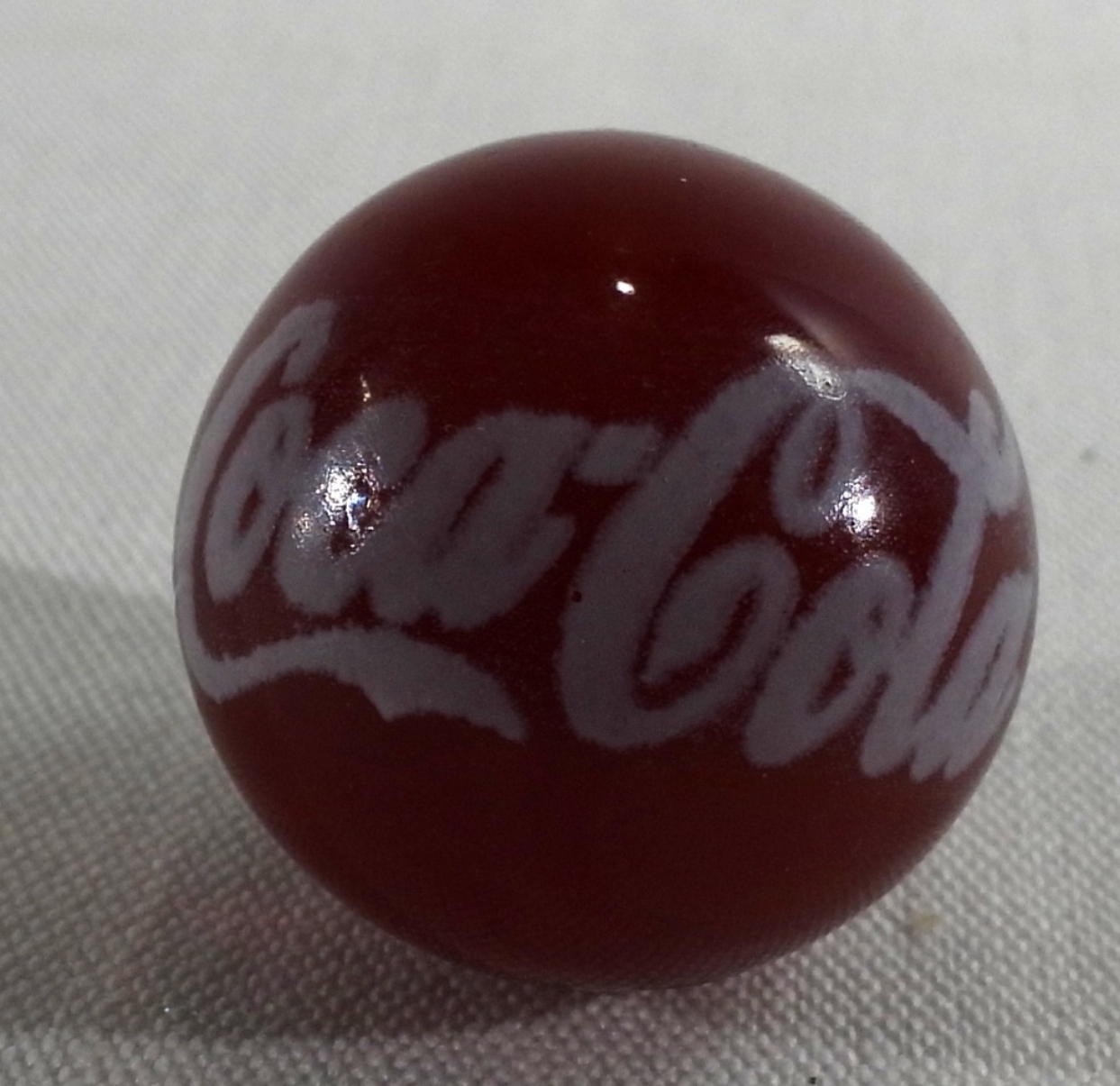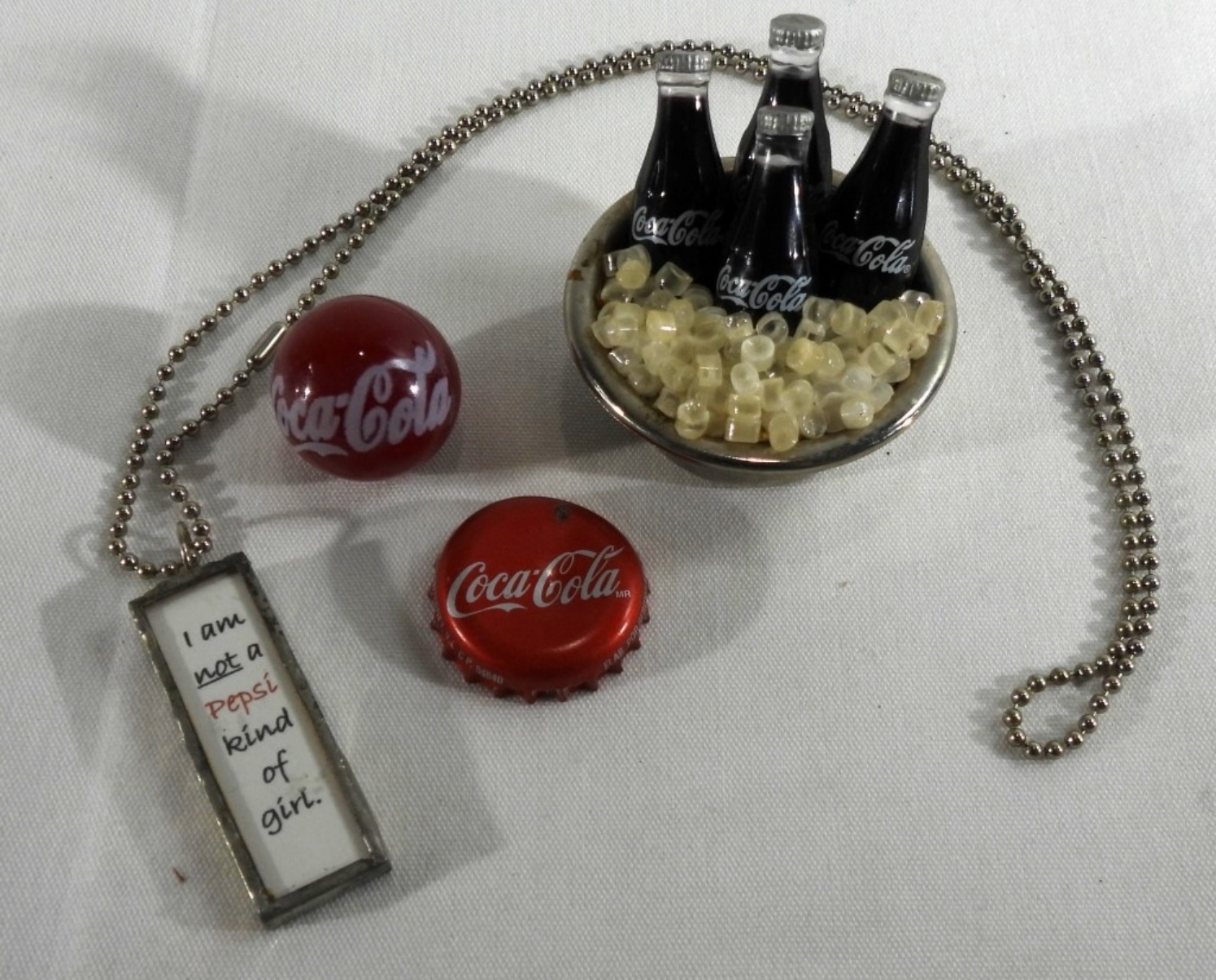1997 Coca-Cola, four bottles on ice in a silver tin bowl. For a doll house. The bowl has a small dent and a hole that seems like a nail in it. Small 5-cent red ball, the size of a small gum-ball. Red bottle cap. And a