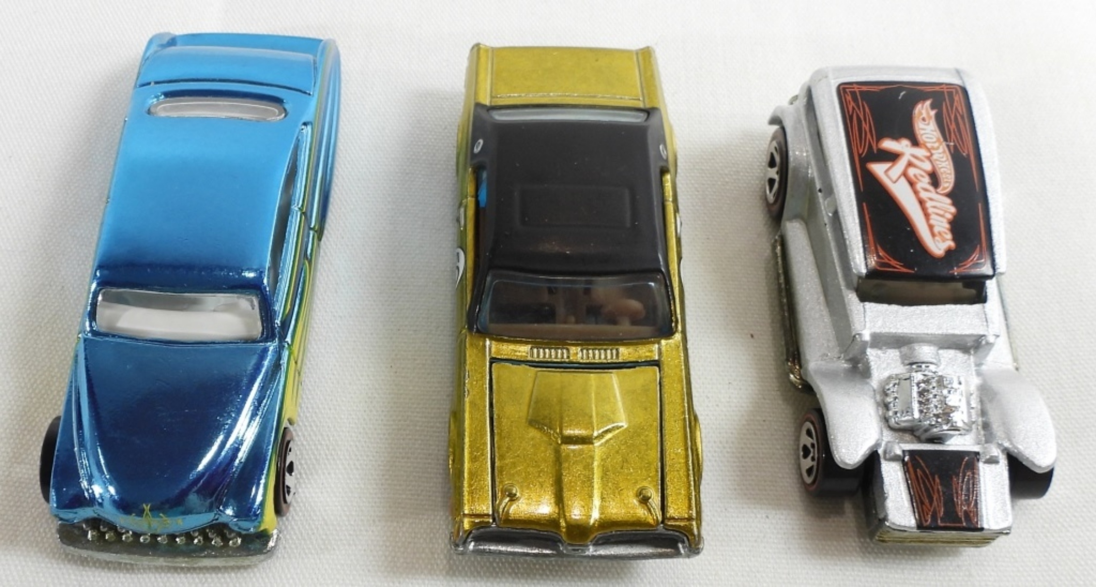 Not in packages. 1. 2018 50th anniversary 1968 Mercury Cougar. Gold with a black top. 50 on the sides. Hood opens. Brown inside. 2. 1969 The Demon Redline 1/64. Silver with a black top and hood with red pin stripes and