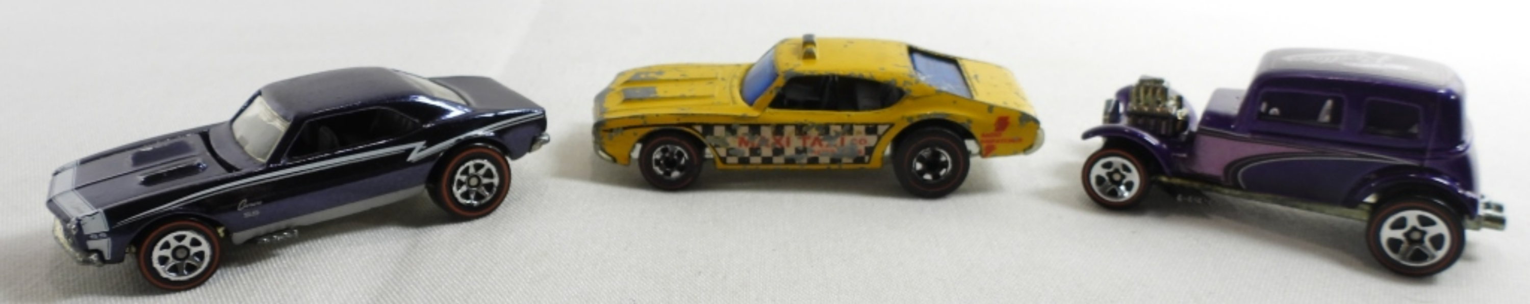 Not in packages. 1. 1982 Hot Wheels 1967 Camaro made in Thailand. Black with white front line as well as pin strips. Silver interior Series 1./2. Classic 32 Ford Vicky Purple. White interior. 3. 1969 Maxi Taxi