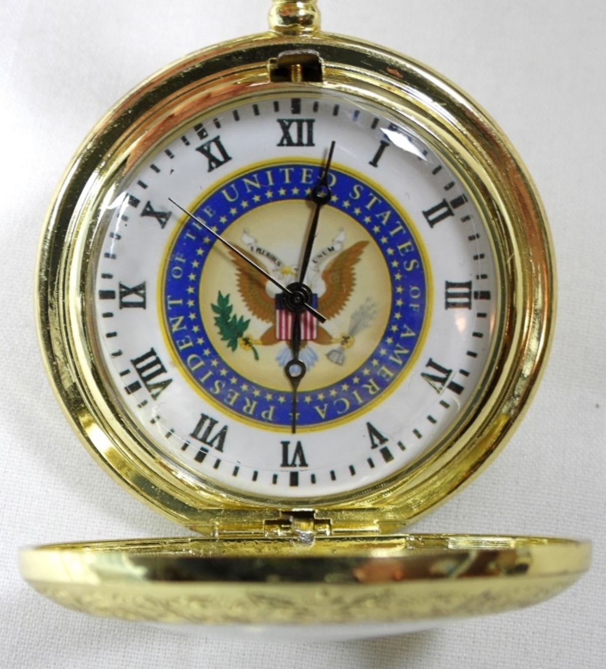 Pocket watch with the presidential seal, untested to see if it works. Watches are not verified, authenticated, or tested in running condition unless otherwise specified.