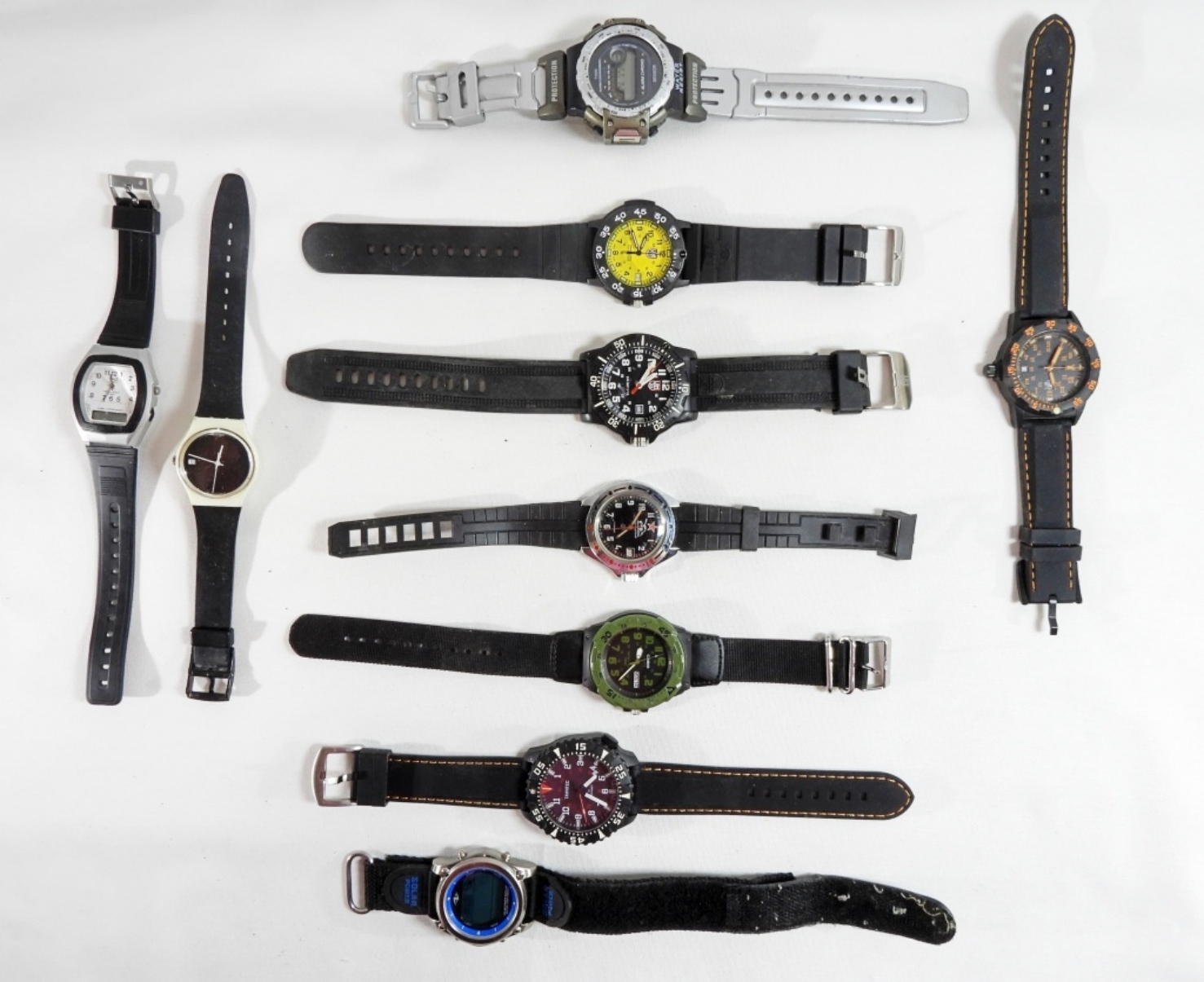 Watches are not verified, authenticated, or tested in running condition unless specified. 10 men’s watches in a variety of brands, all of which have either plastic, silicon, or fabric wristbands.