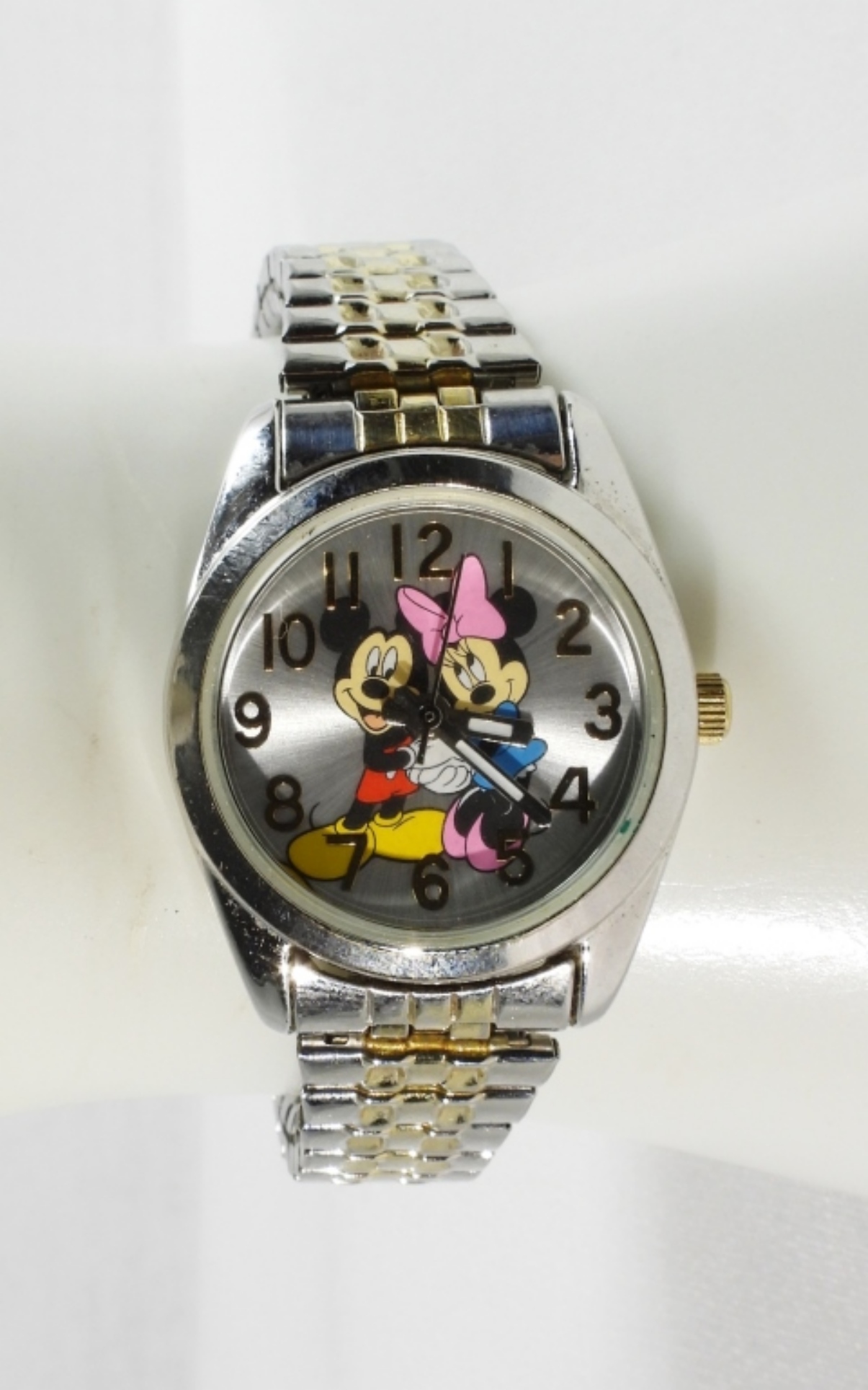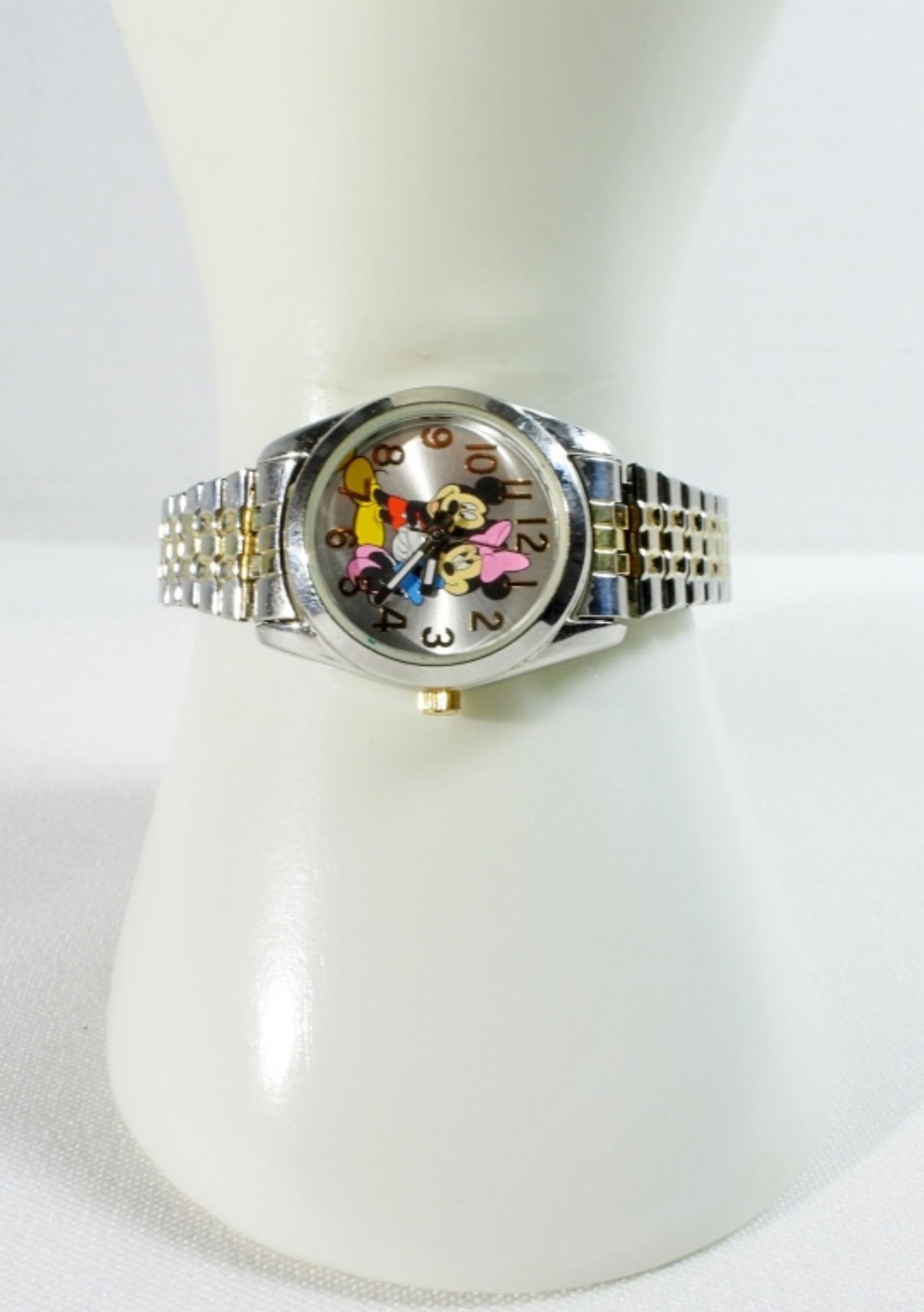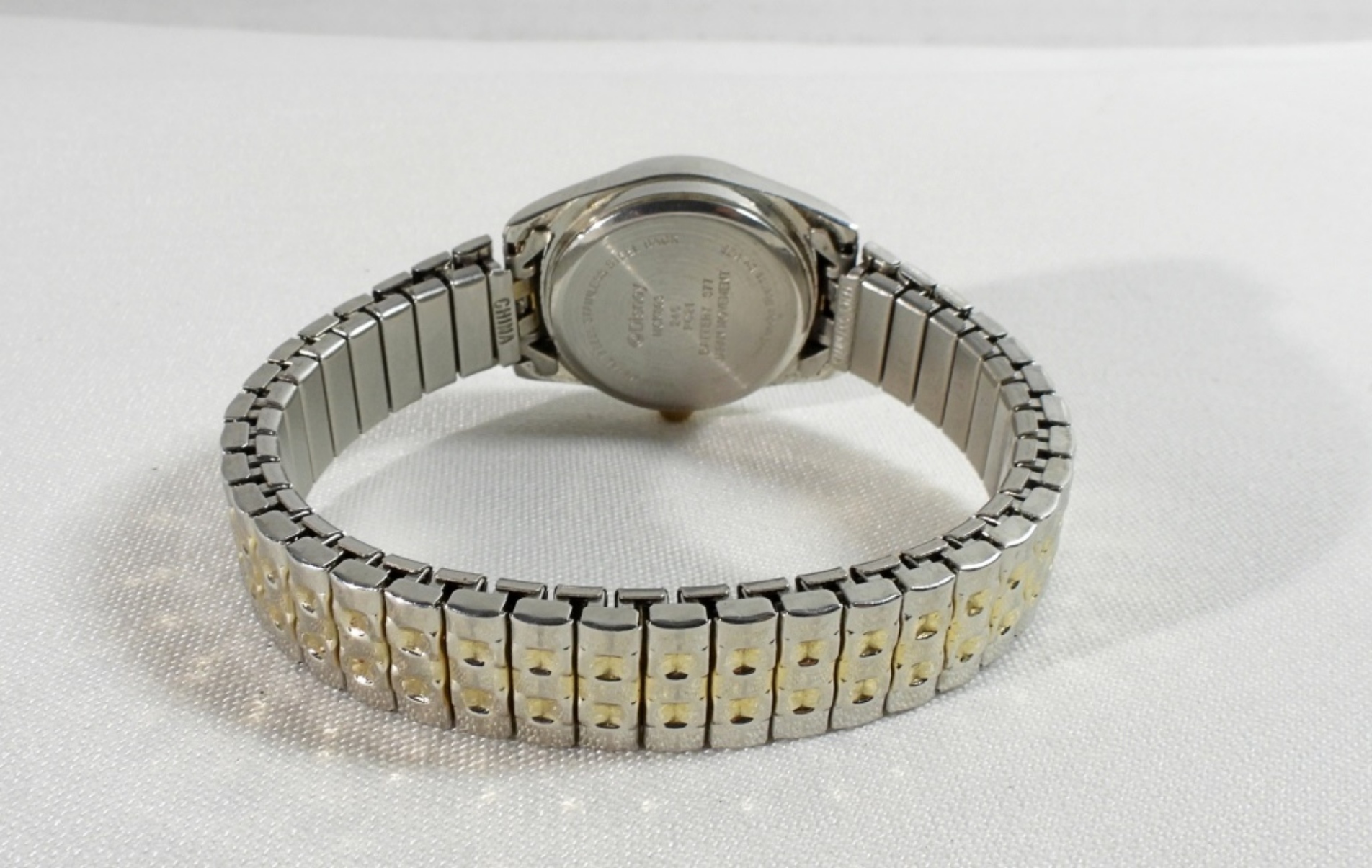 Watches are not verified, authenticated, or tested in running condition unless specified. Silver and gold tone, base metal bezel, stainless steel back, MCK803, stretch band