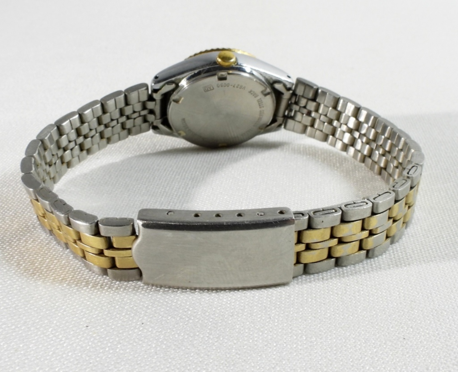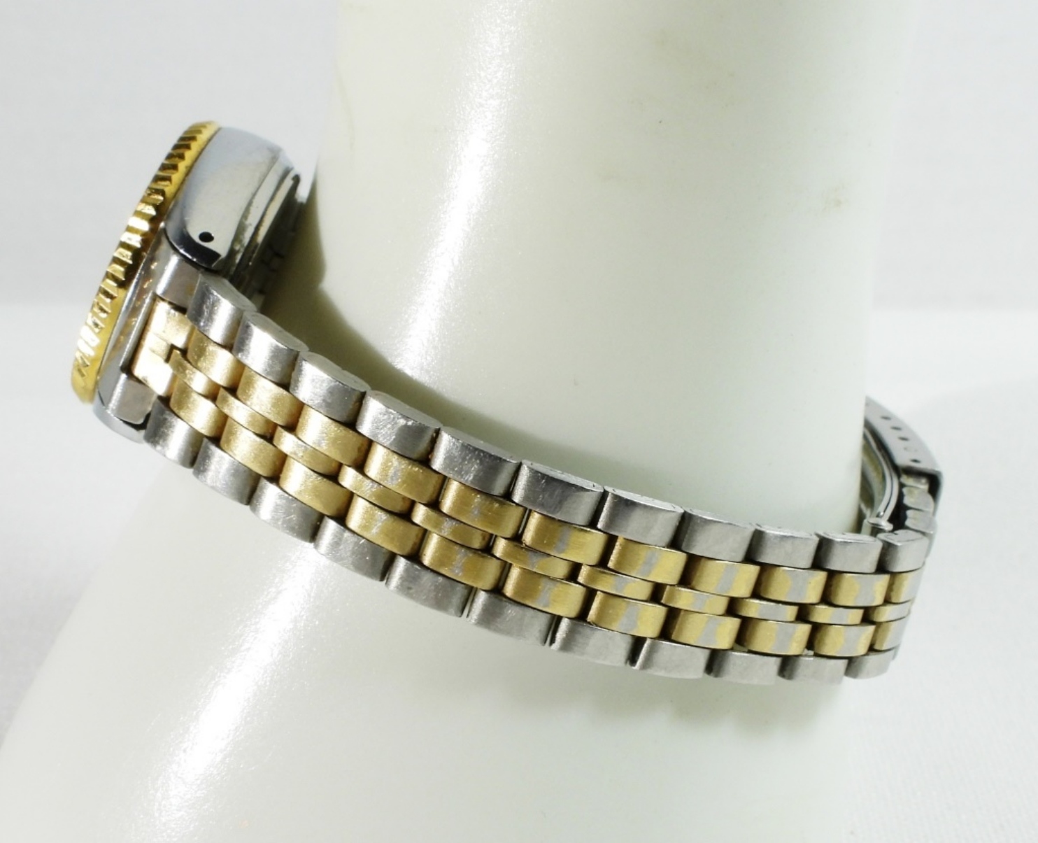 The dial on the side still moves arms. Two-toned, clasp still works. Watches are not verified, authenticated, or tested in running condition unless specified.