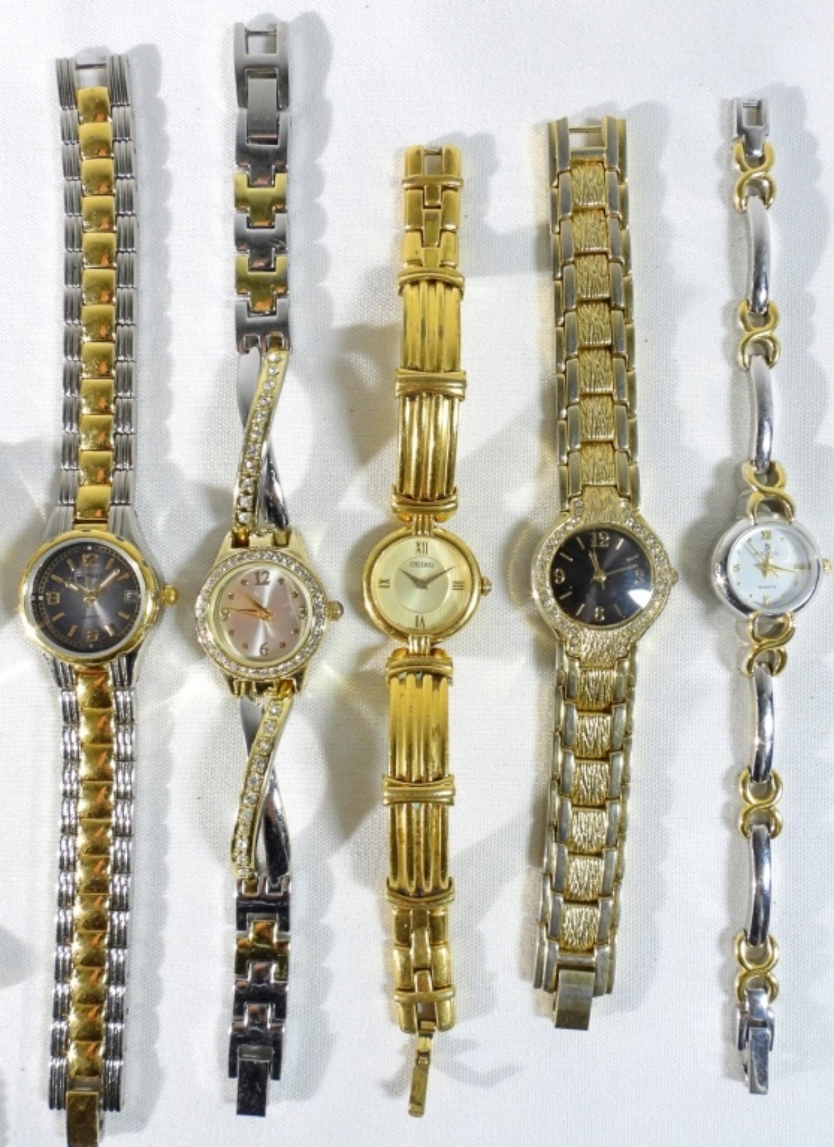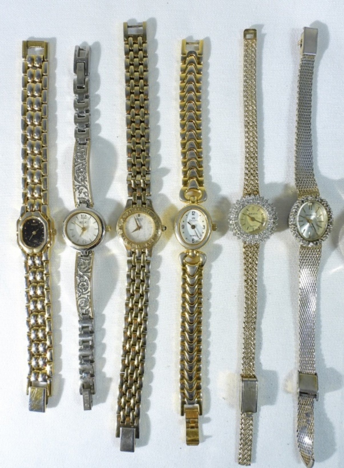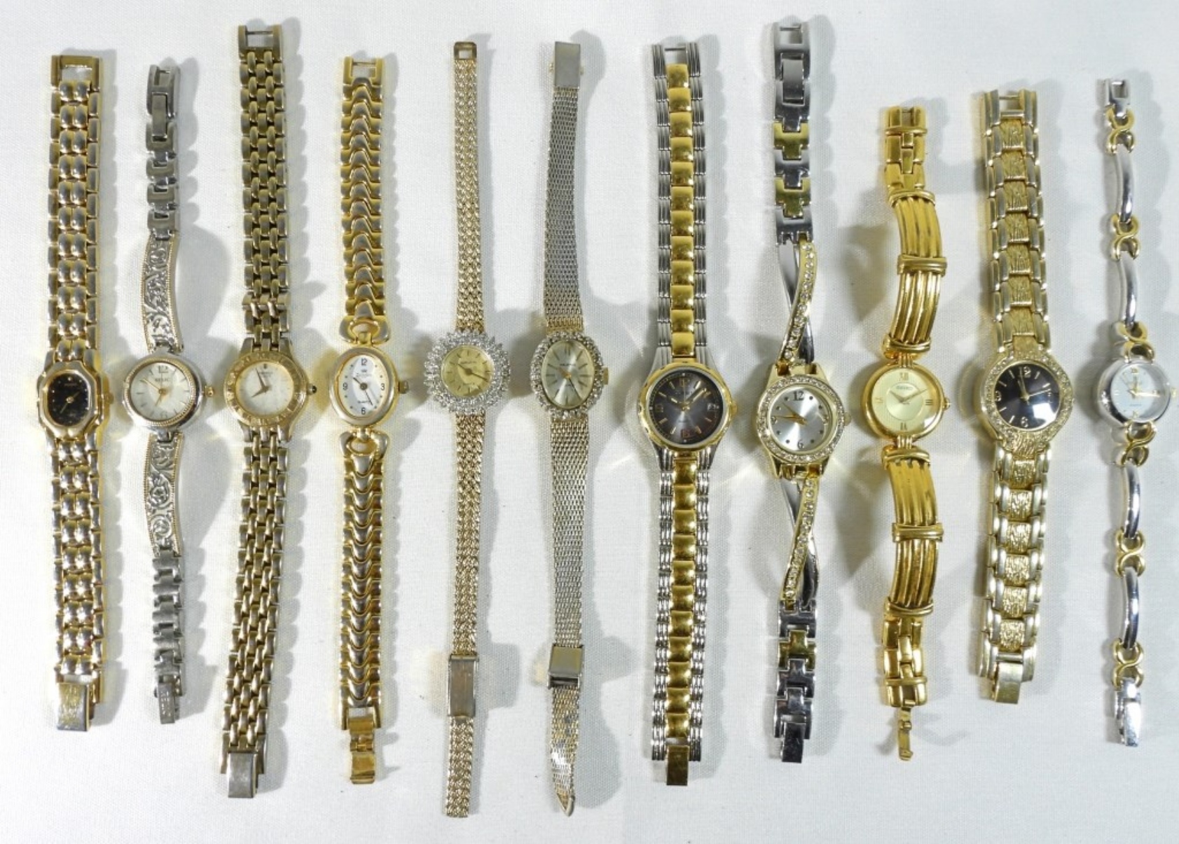All Different styles and conditions, gold-tone and two-tone styles. Some brands in this lot are Relic, Helbros, Gruen, and Seiko. Watches are not verified, authenticated, or tested in running condition