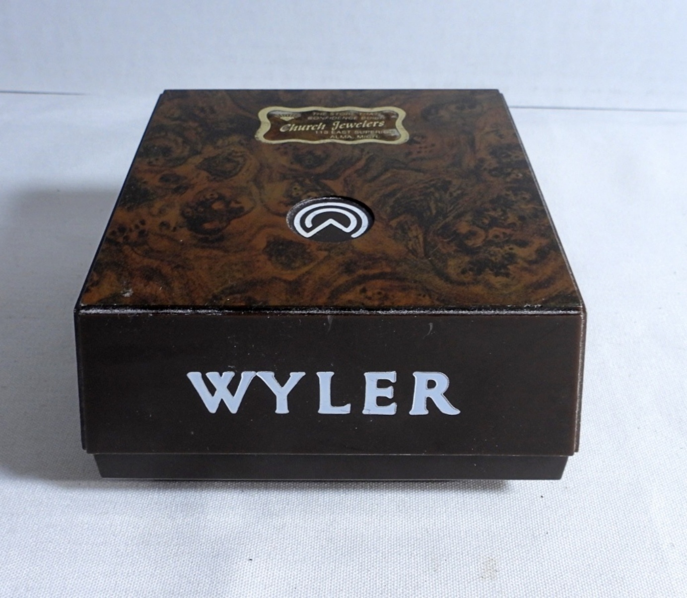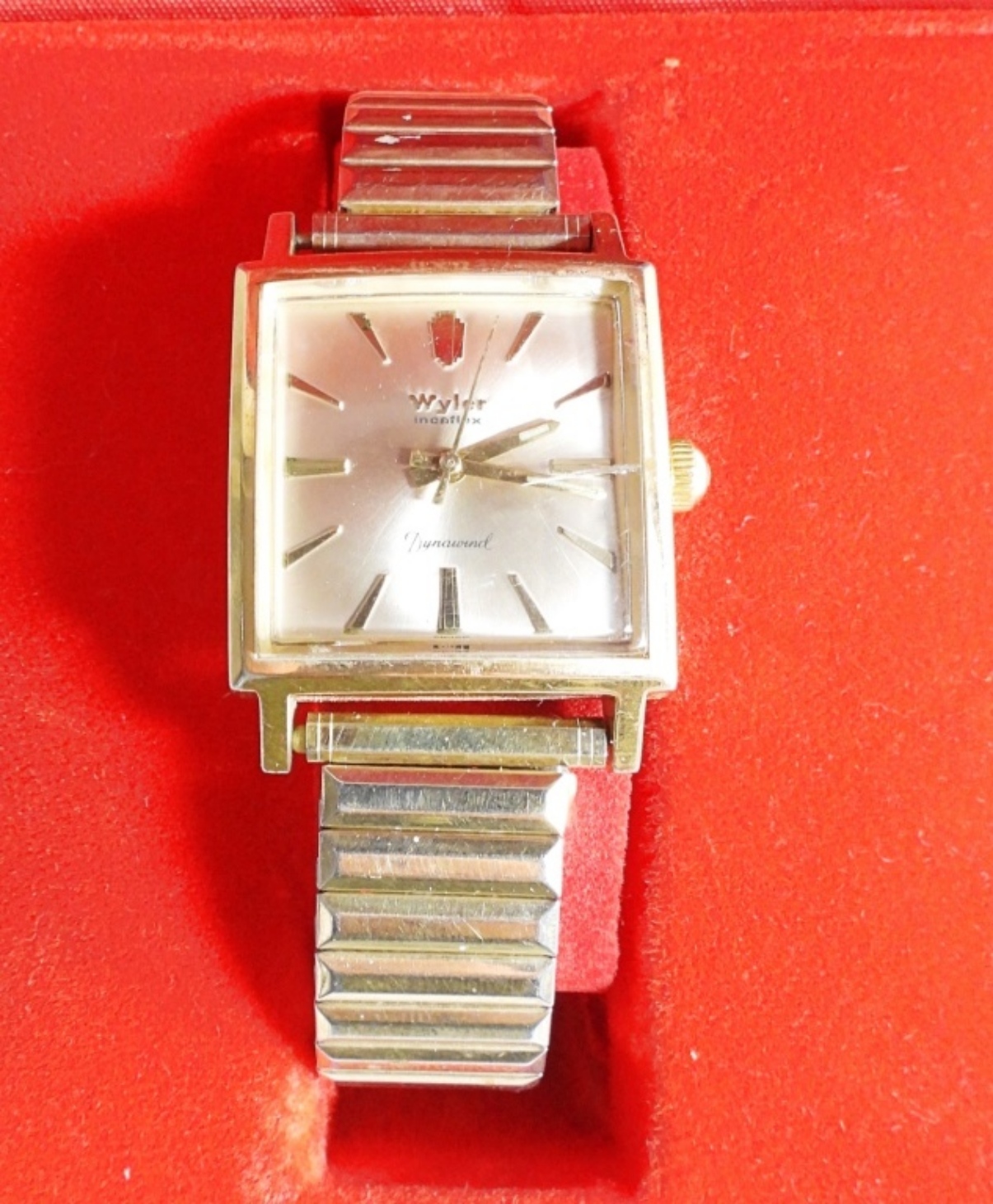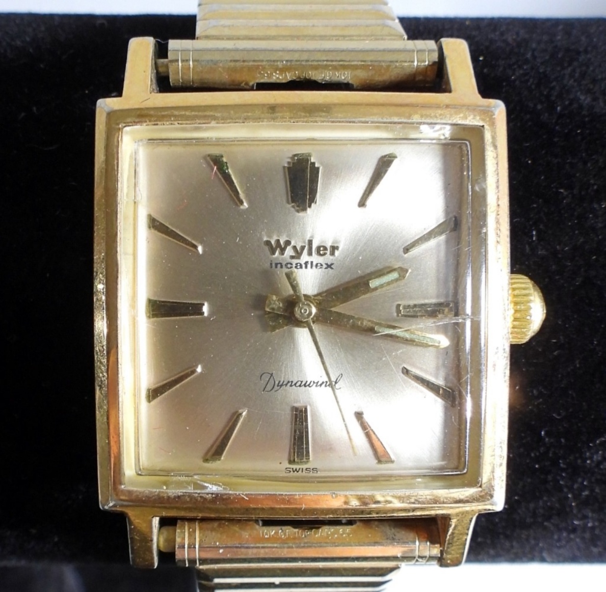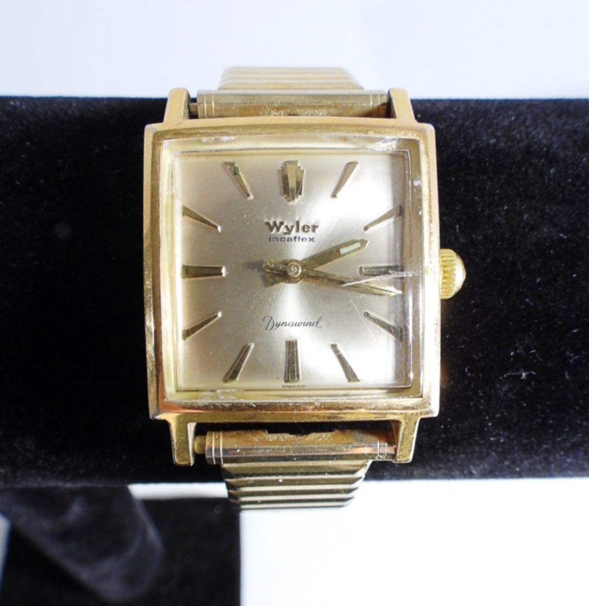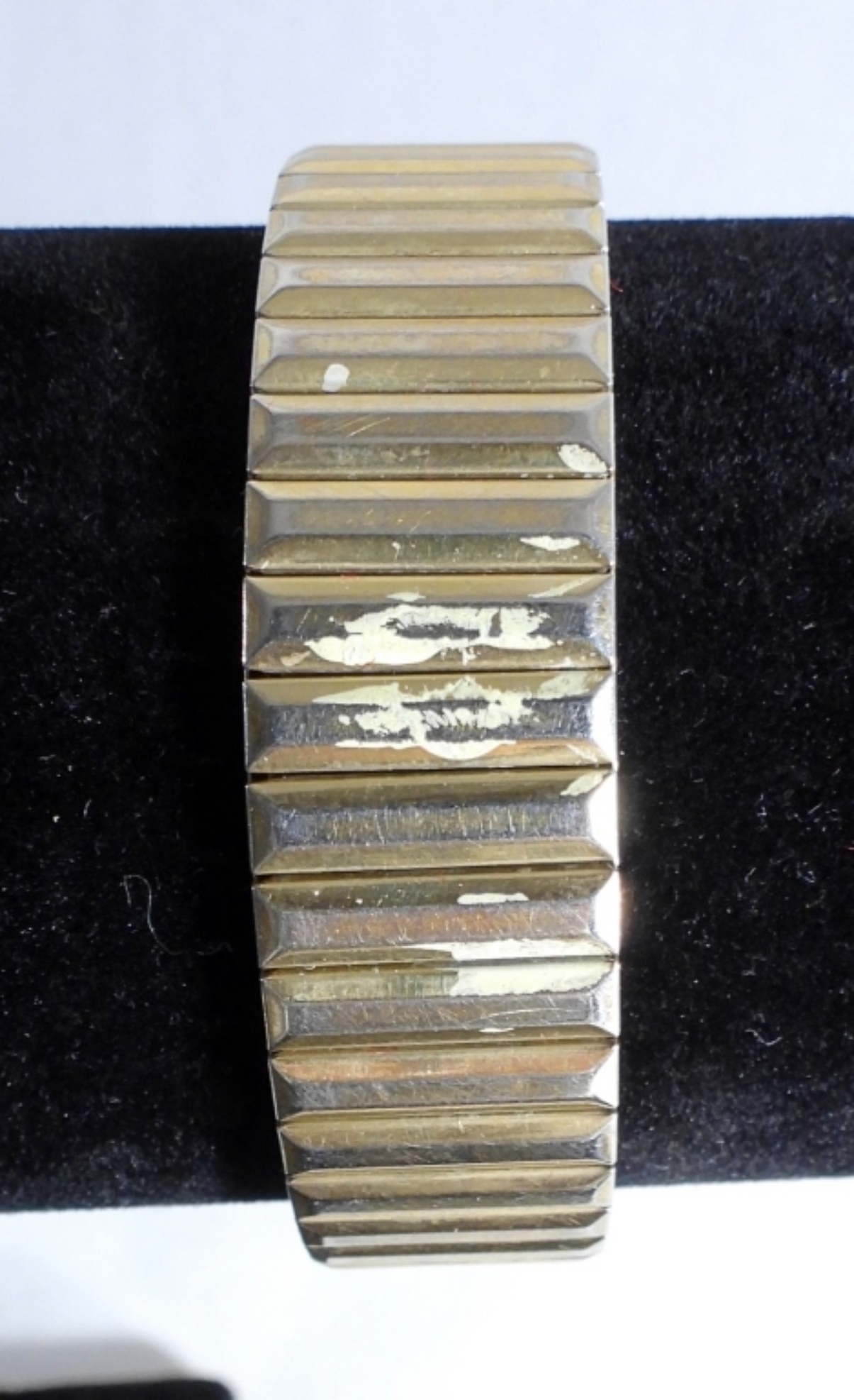 still in its original box. The gold-tone stretch band has wear from the years.