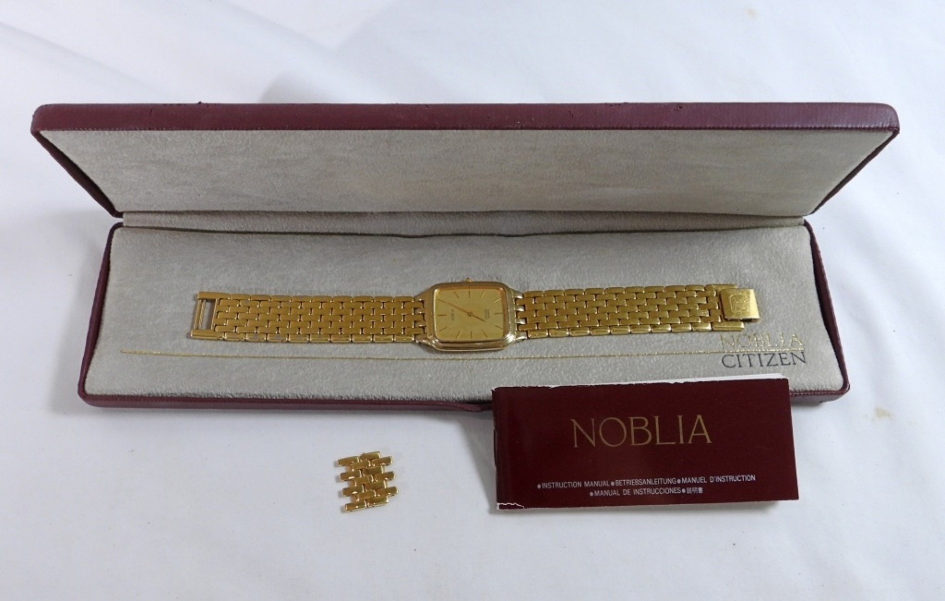 Watches are not verified, authenticated, or tested in running condition unless specified, gold tone, band shows signs of being worn, the original case, instruction manual, and extra link