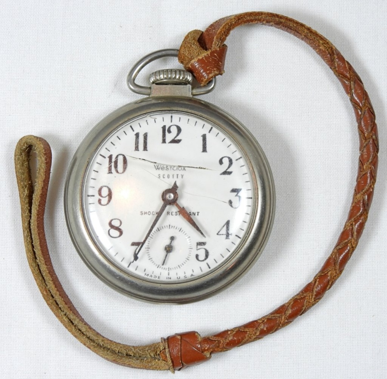 Westclox Scotty Shock Resistant pocket watch, silver. Watches are not verified, authenticated, or tested in running condition unless specified.