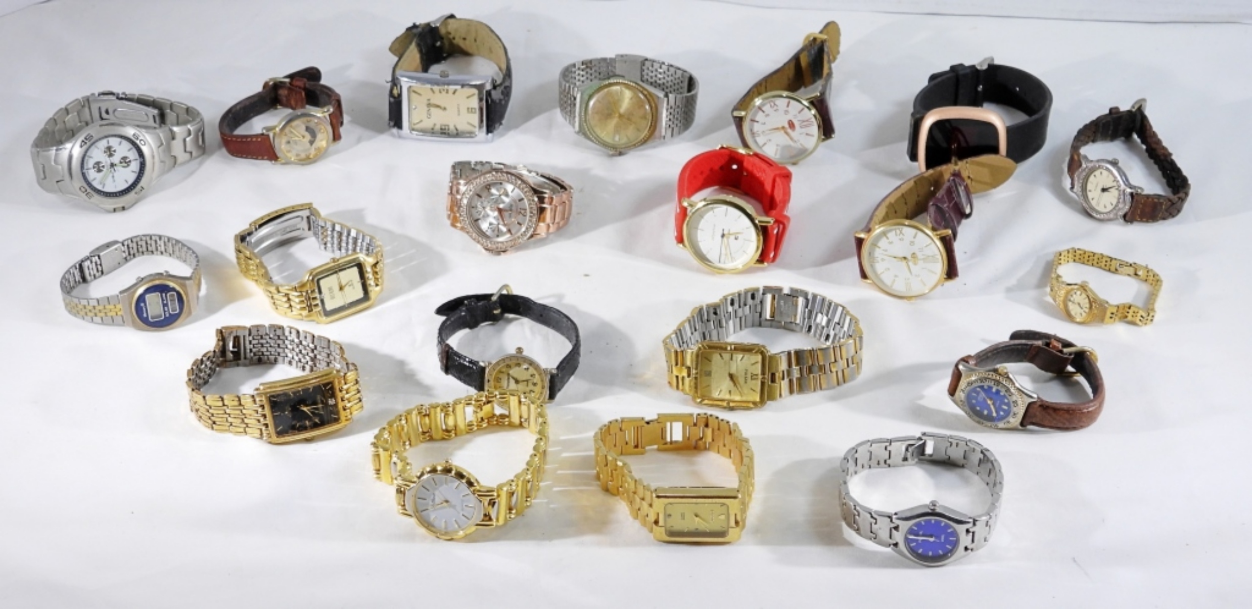 Watches are not verified, authenticated, or tested in running condition unless specified. A mixed lot of men’s and women’s watches( 20 watches) and a variety of brands( one watch face will need repaired.)