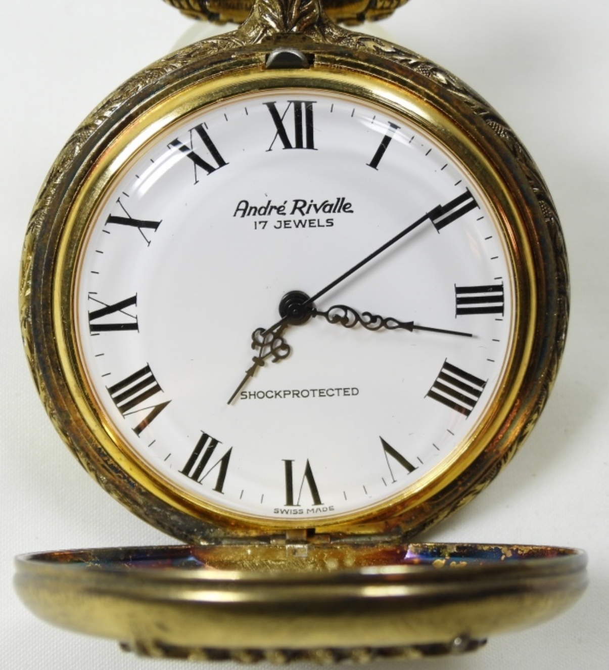 1 Gold toned engraved Andre Rivalle 17 jewels pocket watch. Watches are not verified, authenticated, or tested in running condition unless specified.
