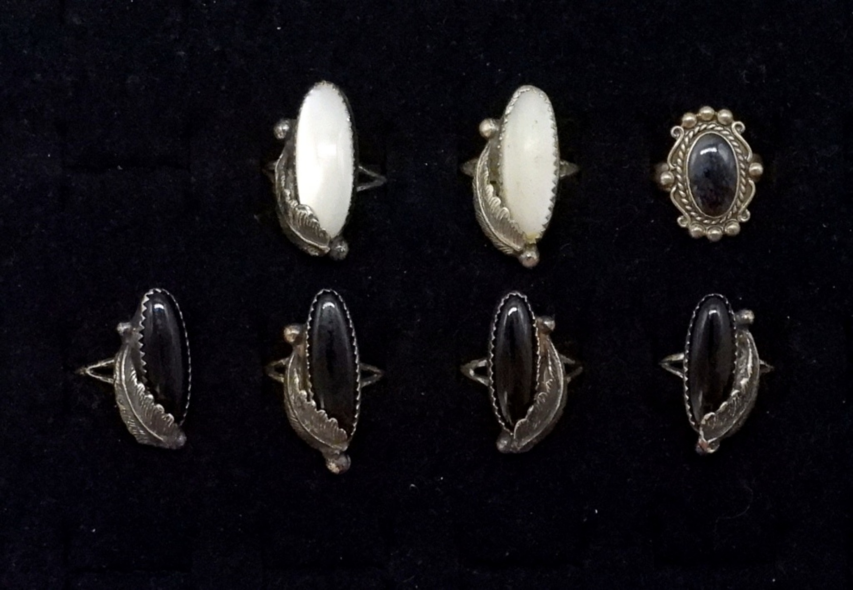 Seven sterling black onyx & mother of pearl rings. All very similar in style. Sizes 5-7.5 (18.7 dwt)