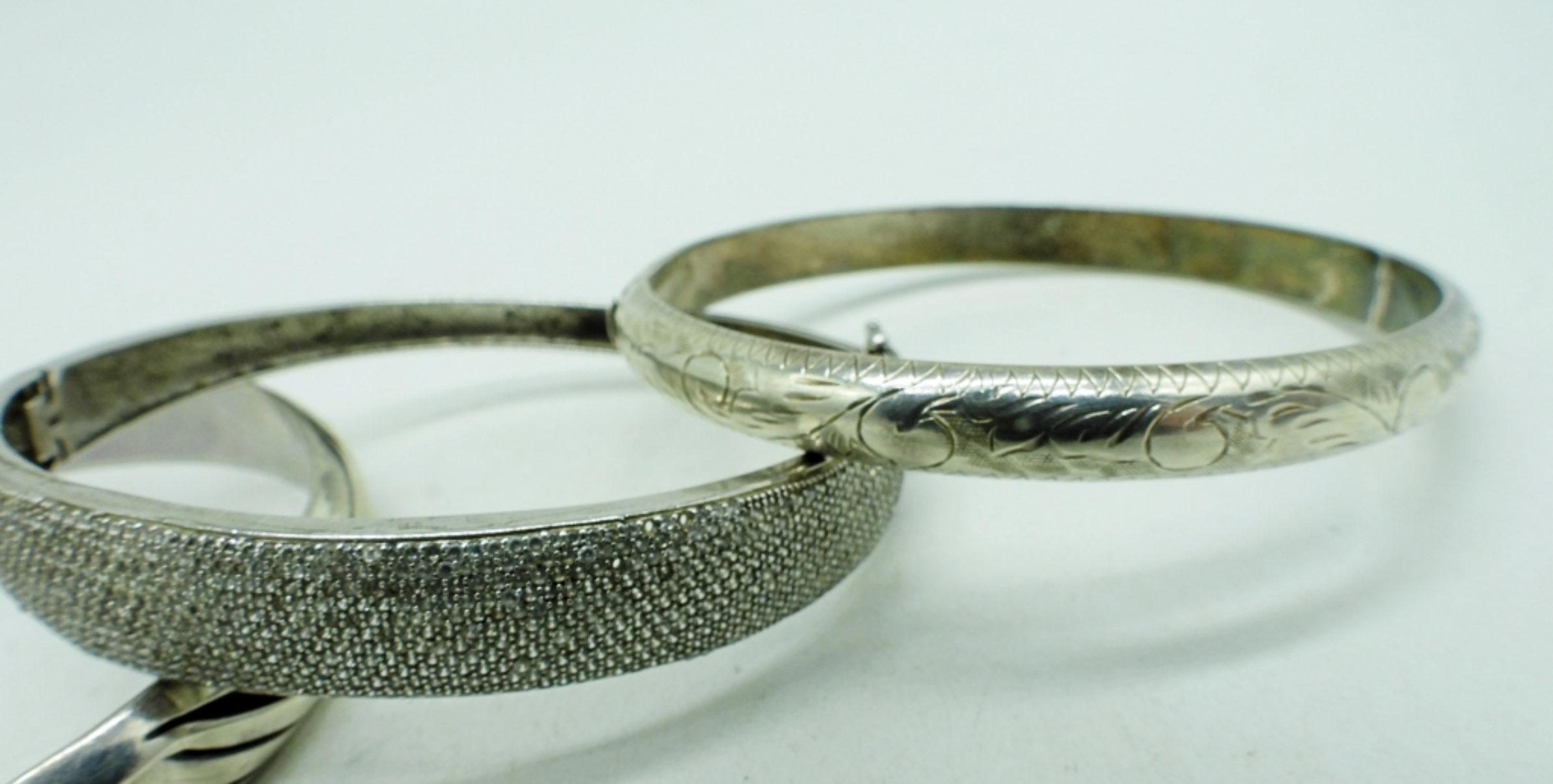 Taxco Sterling Bangle Bracelet marked “TF-37 Mexico 925”, 8 “. Simulated diamond encrusted (missing some stones) hinged bracelet and an etched sterling bangle. (26.4 dwt)