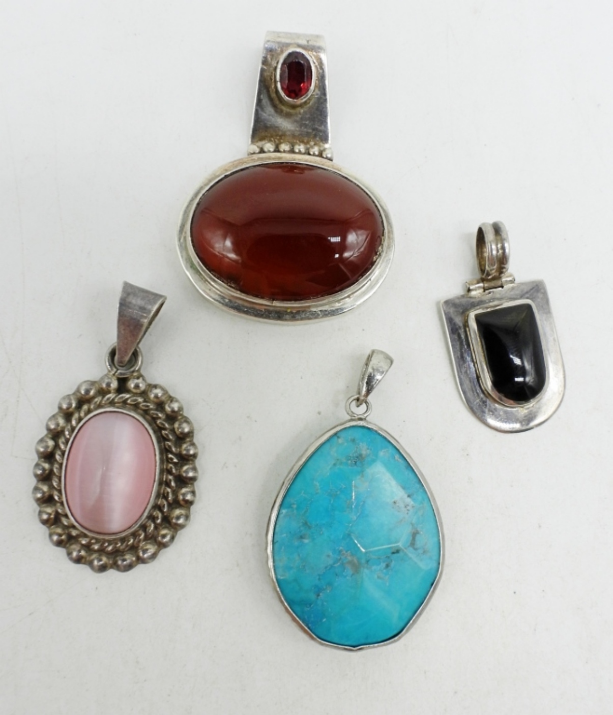 Four sterling pendants. Carnelian, garnet, black onyx, turquoise & pink cats eye. 1.5″-2″. (35.6 dwt)
