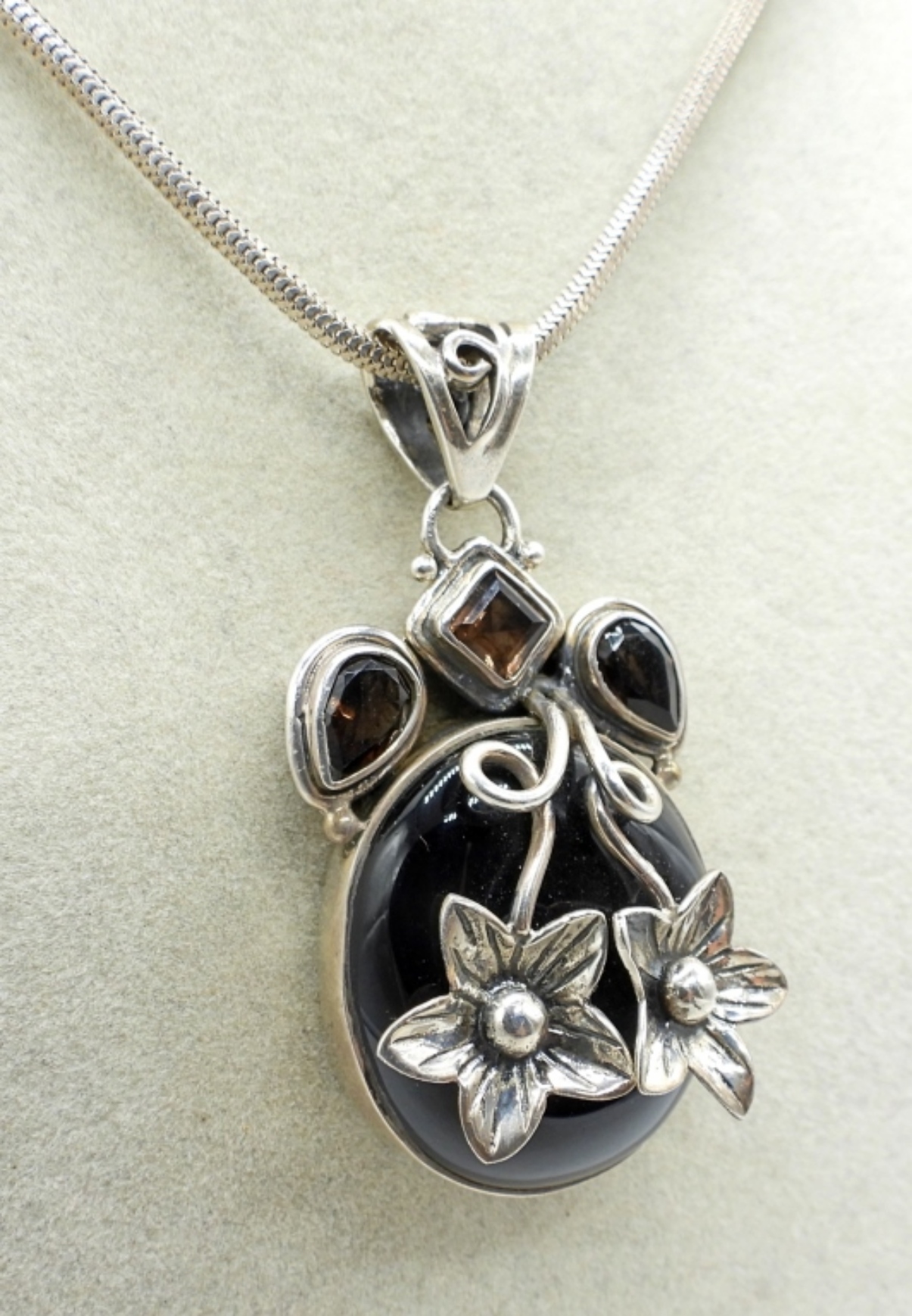 Beautiful sterling pendant with black onyx and smokey quartz gemstones. Pendant is 2″ long. Sterling chain is 24″ long. (17 dwt)