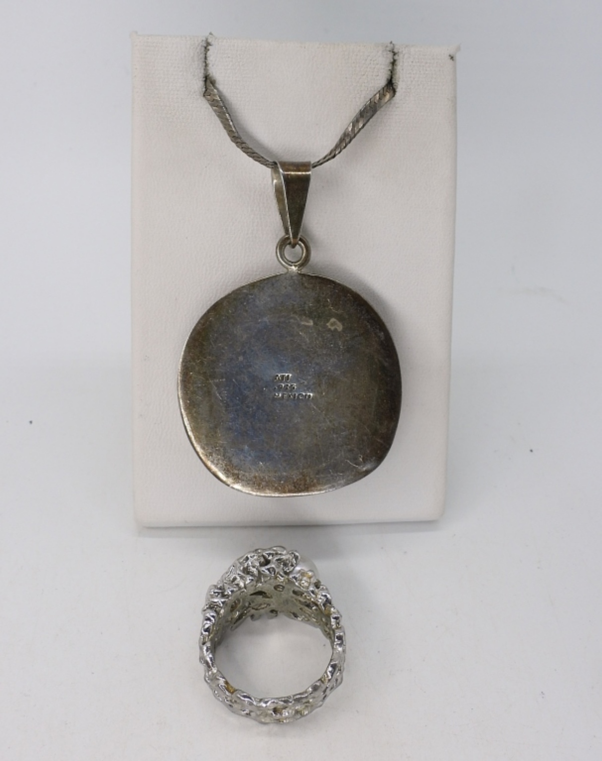 ATI Mexico sterling sand dollar pendant on an 18″ Chain. Pendant is 2.5″ Long. Sterling pearl ring, Size 9.5 (23.1 DWT)