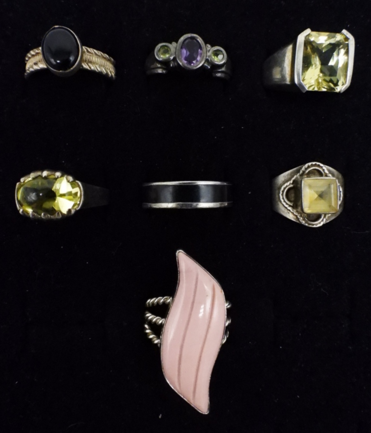 7 sterling gemstone rings. Black onyx, Peridot, Quartz, Amethyst & more. Sizes 7-9 (26.4 dwt)