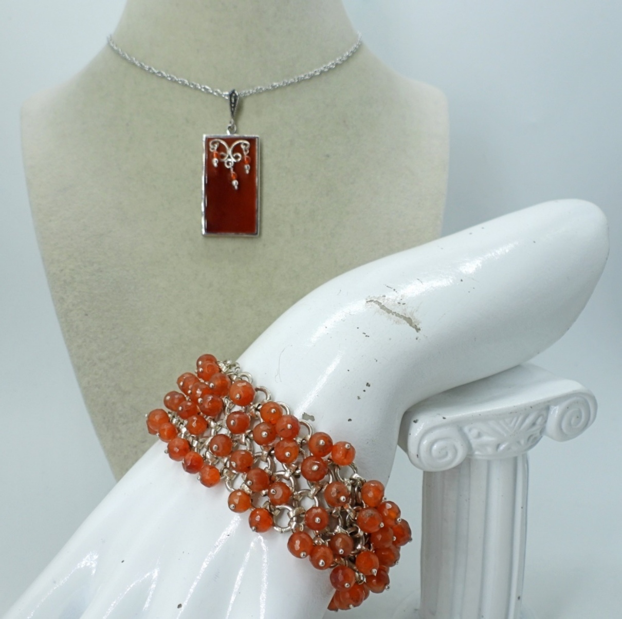 One vintage faceted carnelian sterling bracelet, 7″. Carnelian Pendant on a 14″ Chain. (52 DWT)