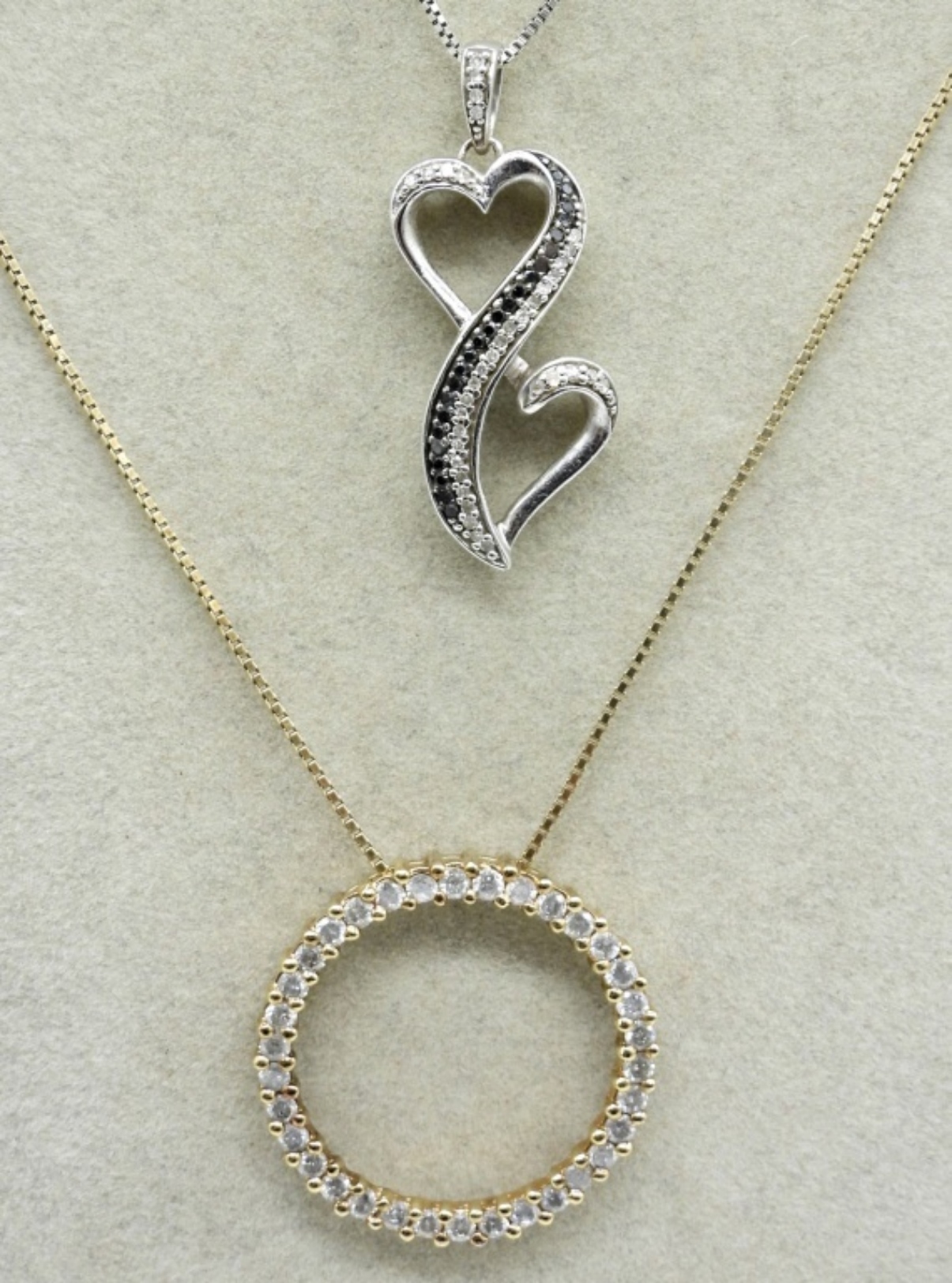 Two sterling silver necklaces with diamonds. Gold tone diamond circlet, chain is 18″. Black and white diamond heart necklace, 18″. (6.5 DWT)