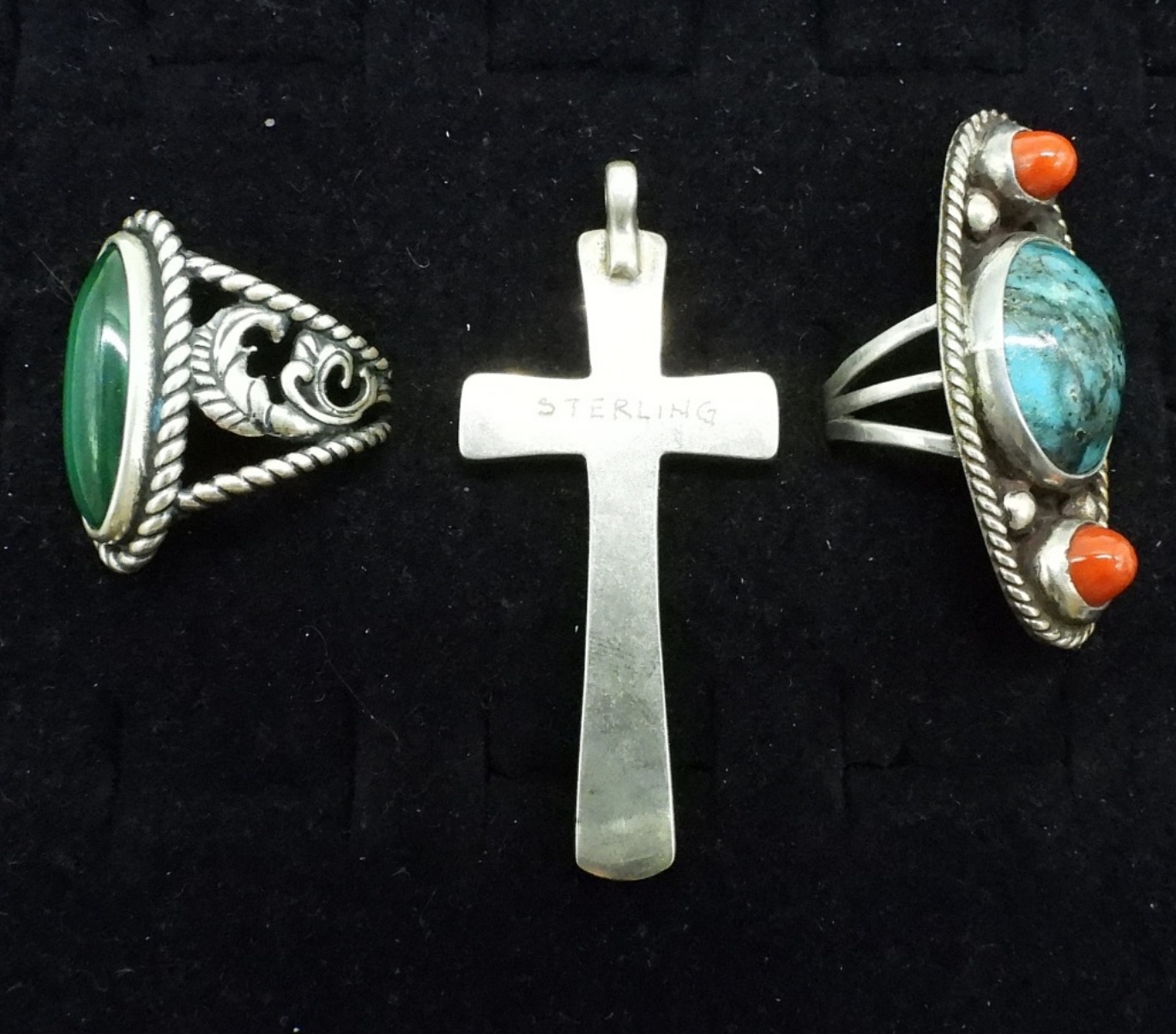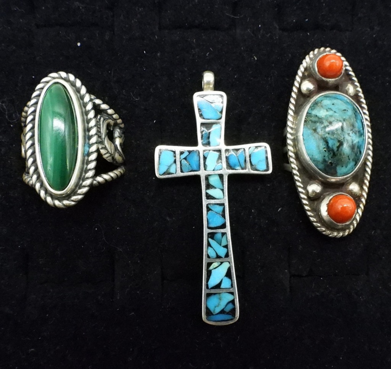 Sterling turquoise ring, size 6.5, Sterling malachite ring, size 8. Turquoise inlay cross pendant, 2″. (19.9 dwt)
