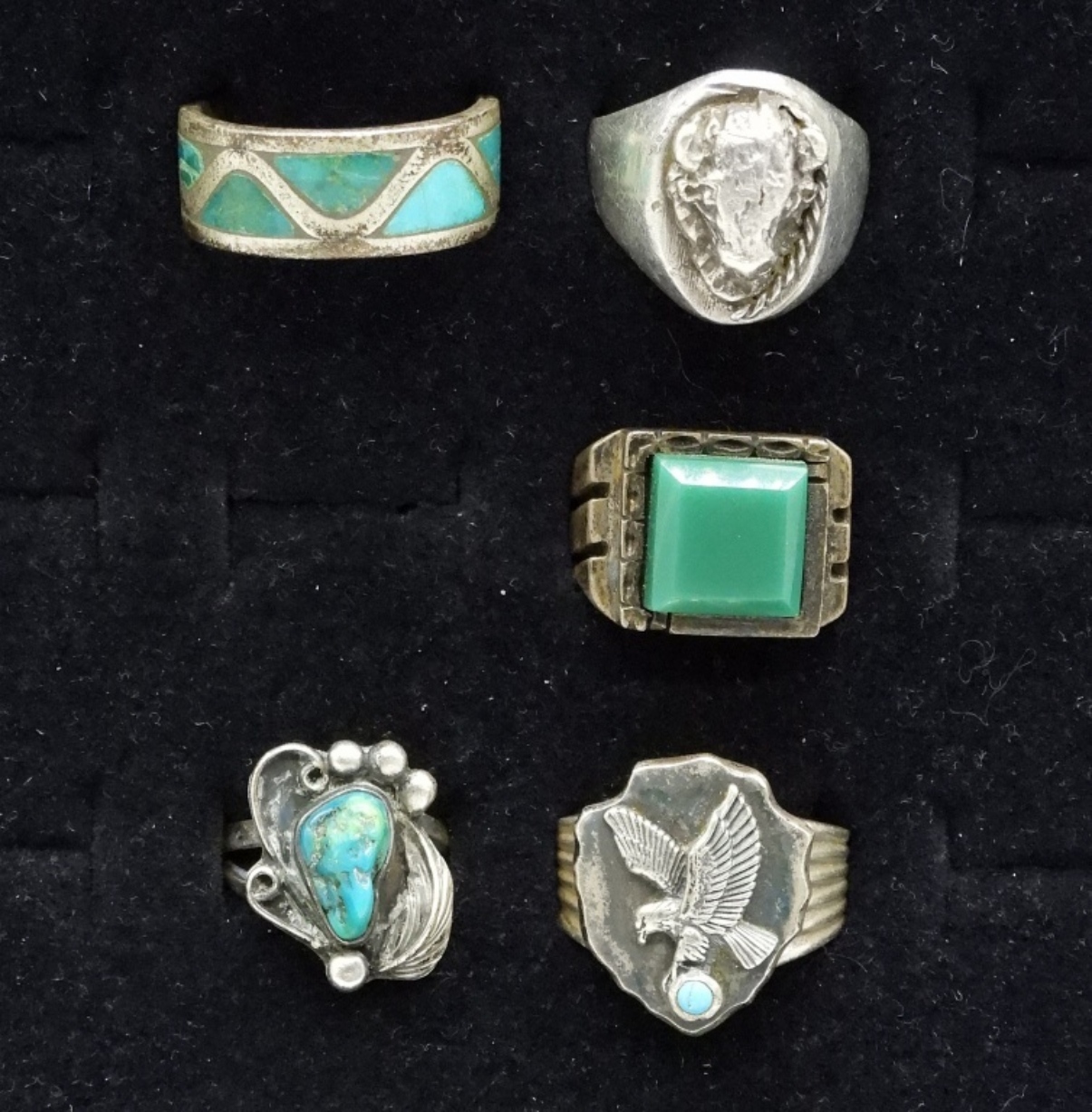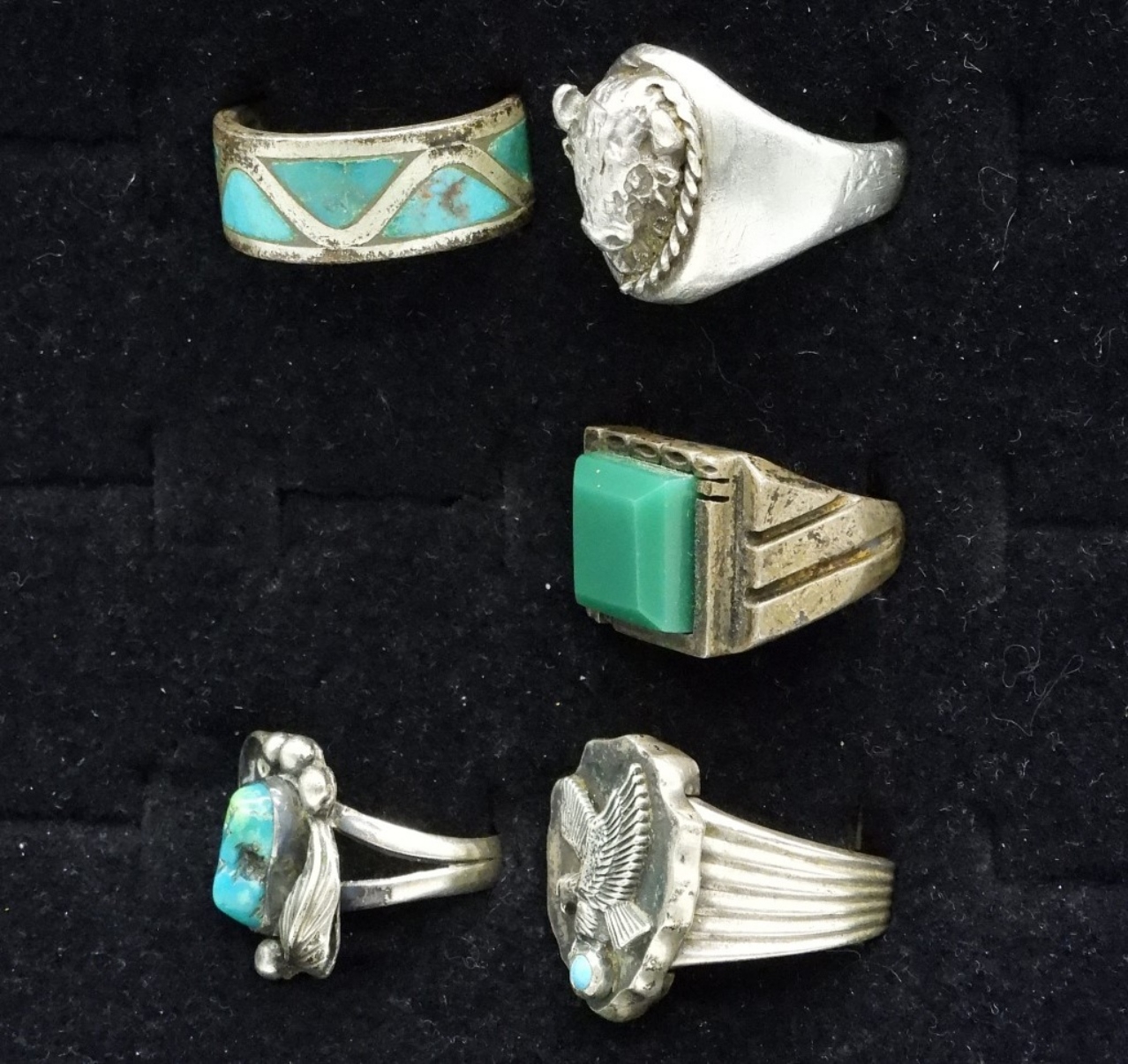 Five sterling rings. Buffalo head, turquoise, green onyx. Sizes 7-11. Buffalo ring is misshapen. (38.7 dwt)
