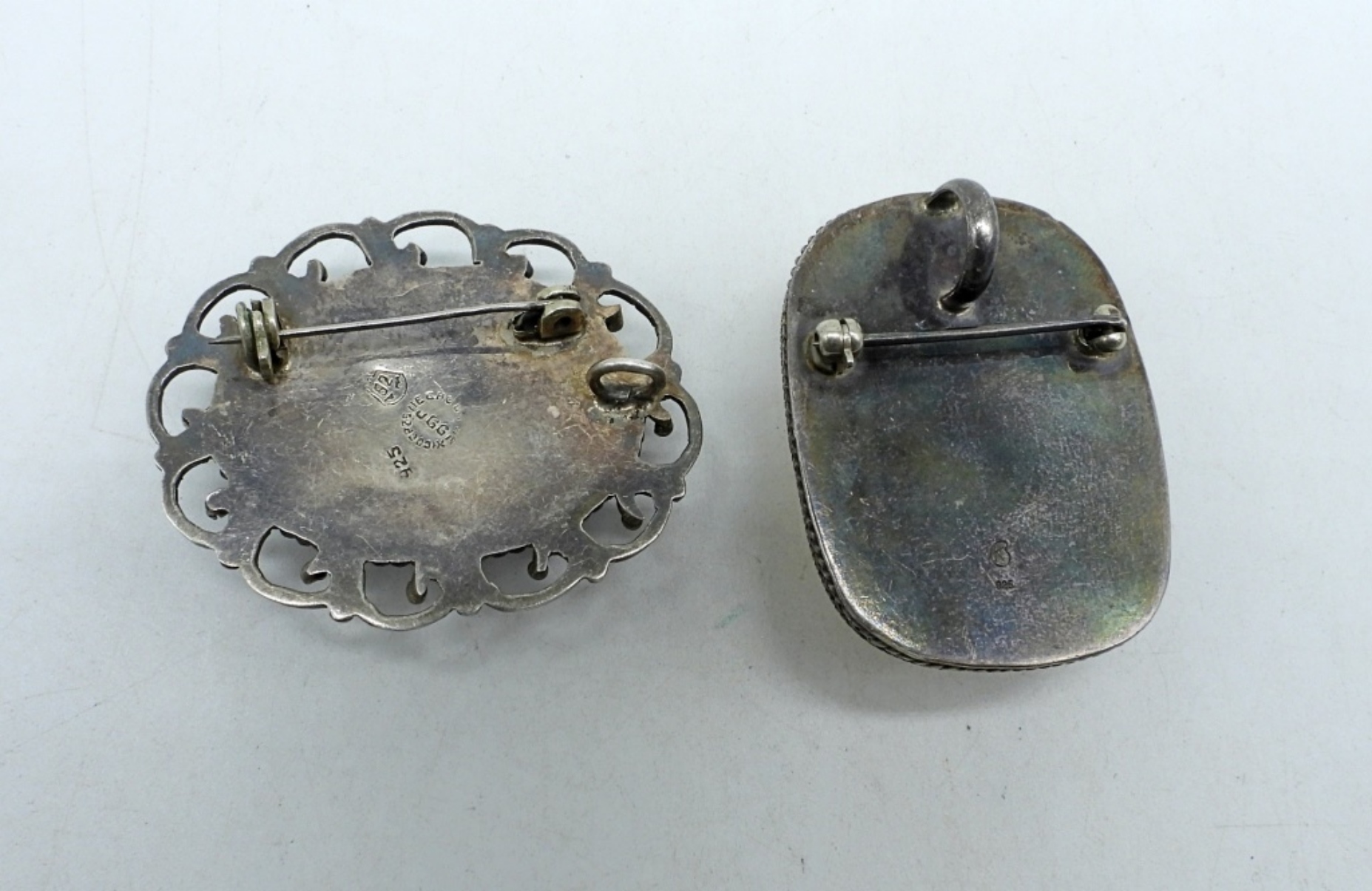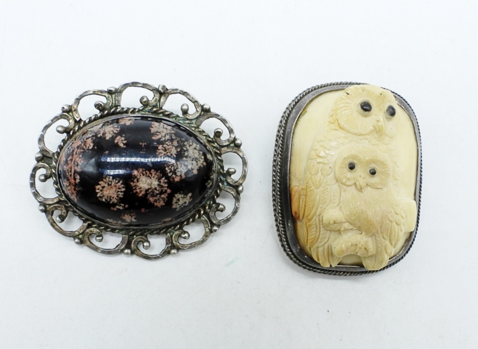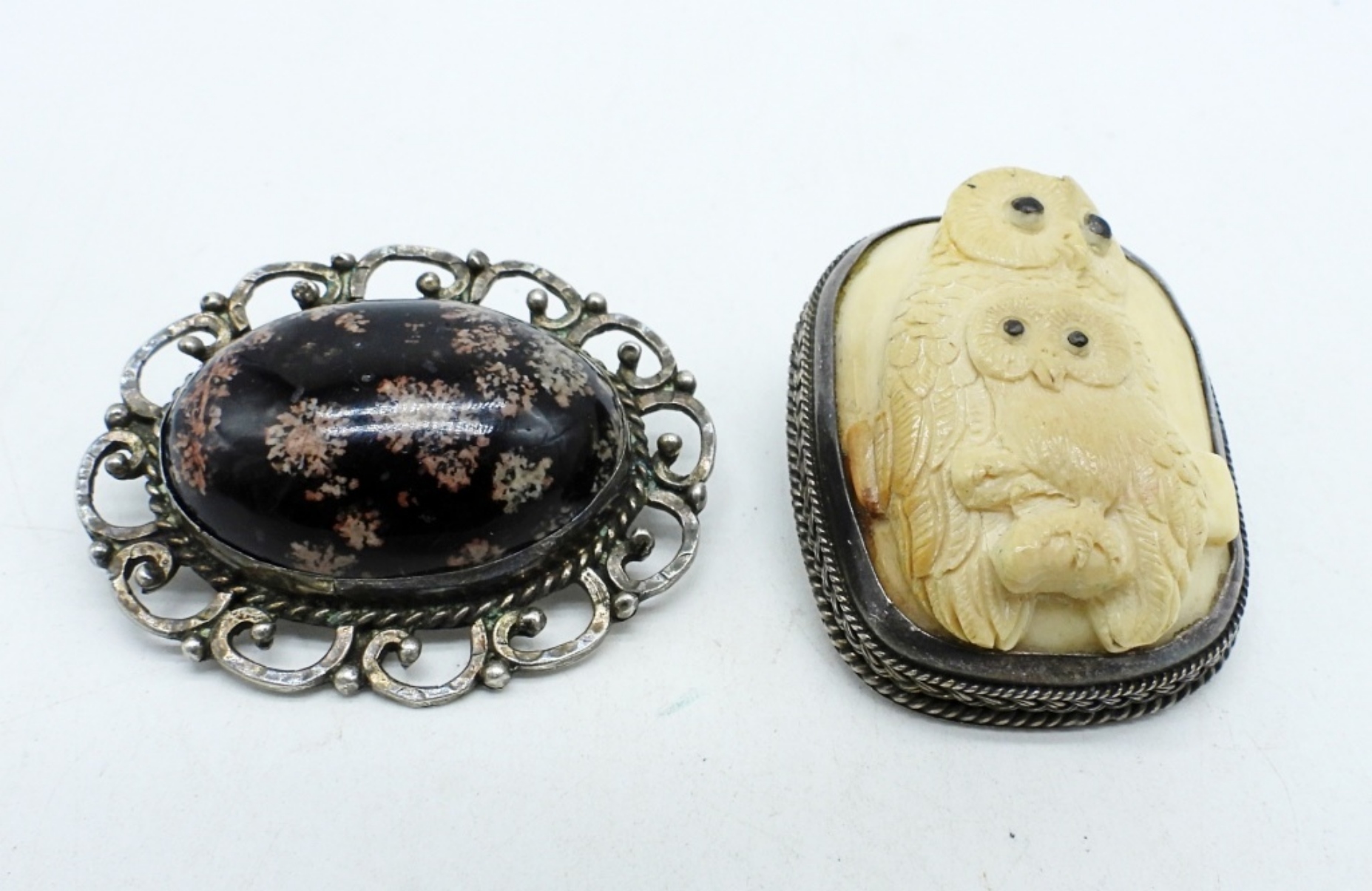 Vintage Sterling Carved Bone, Owl Design Brooch 1.5″ x 1″. Vintage Sterling Snowflake Obsidian Brooch, 2″ x 1.5″. (24 DWT)