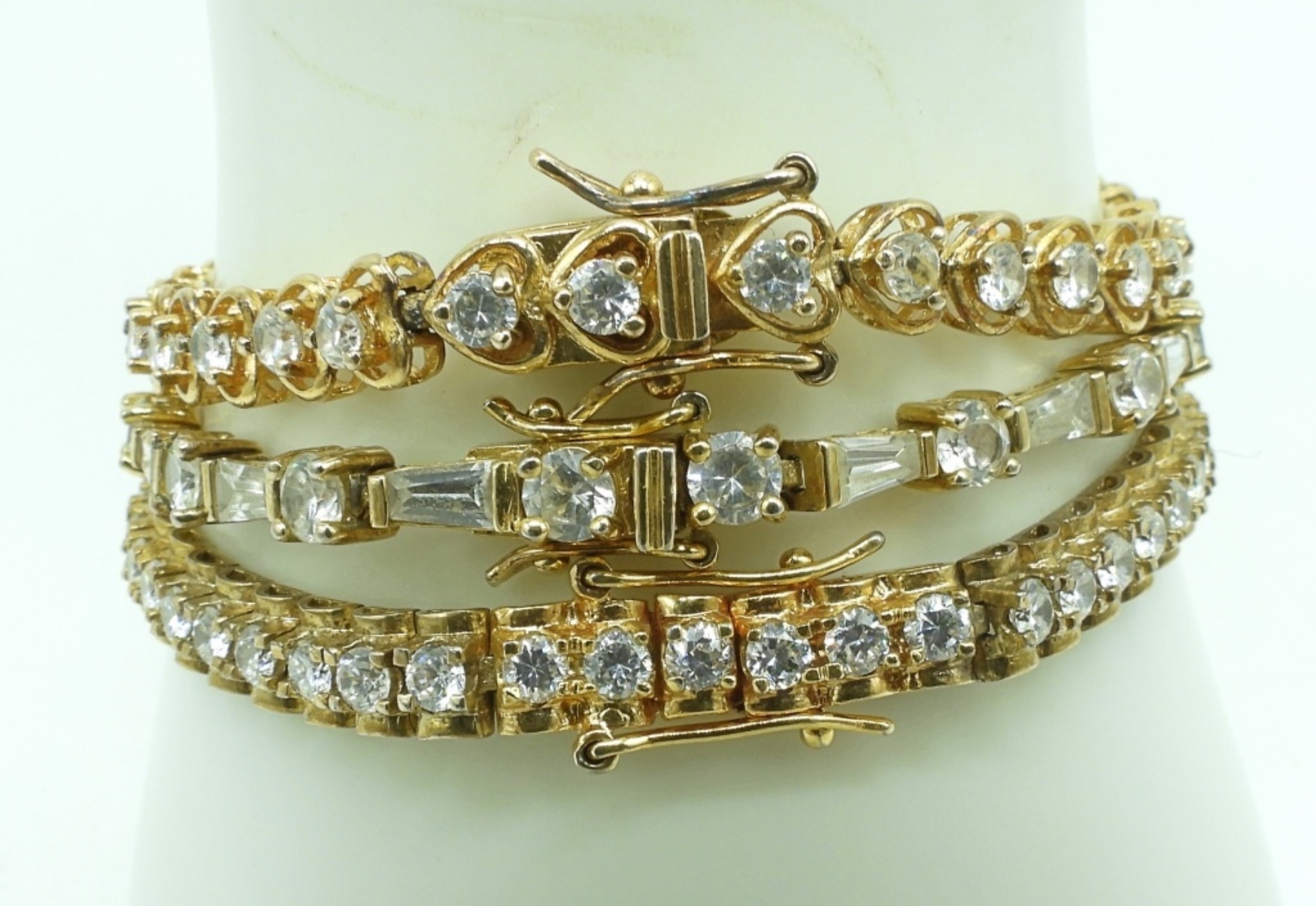 Three gold tone sterling tennis bracelets with simulated diamonds. 7″. (24.4 dwt)