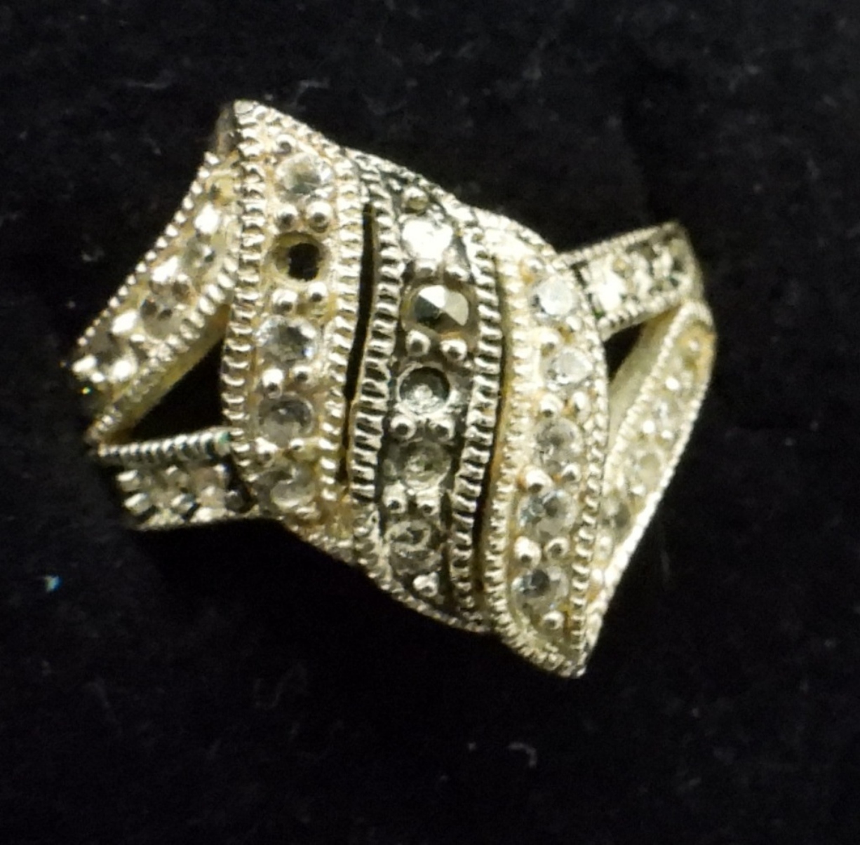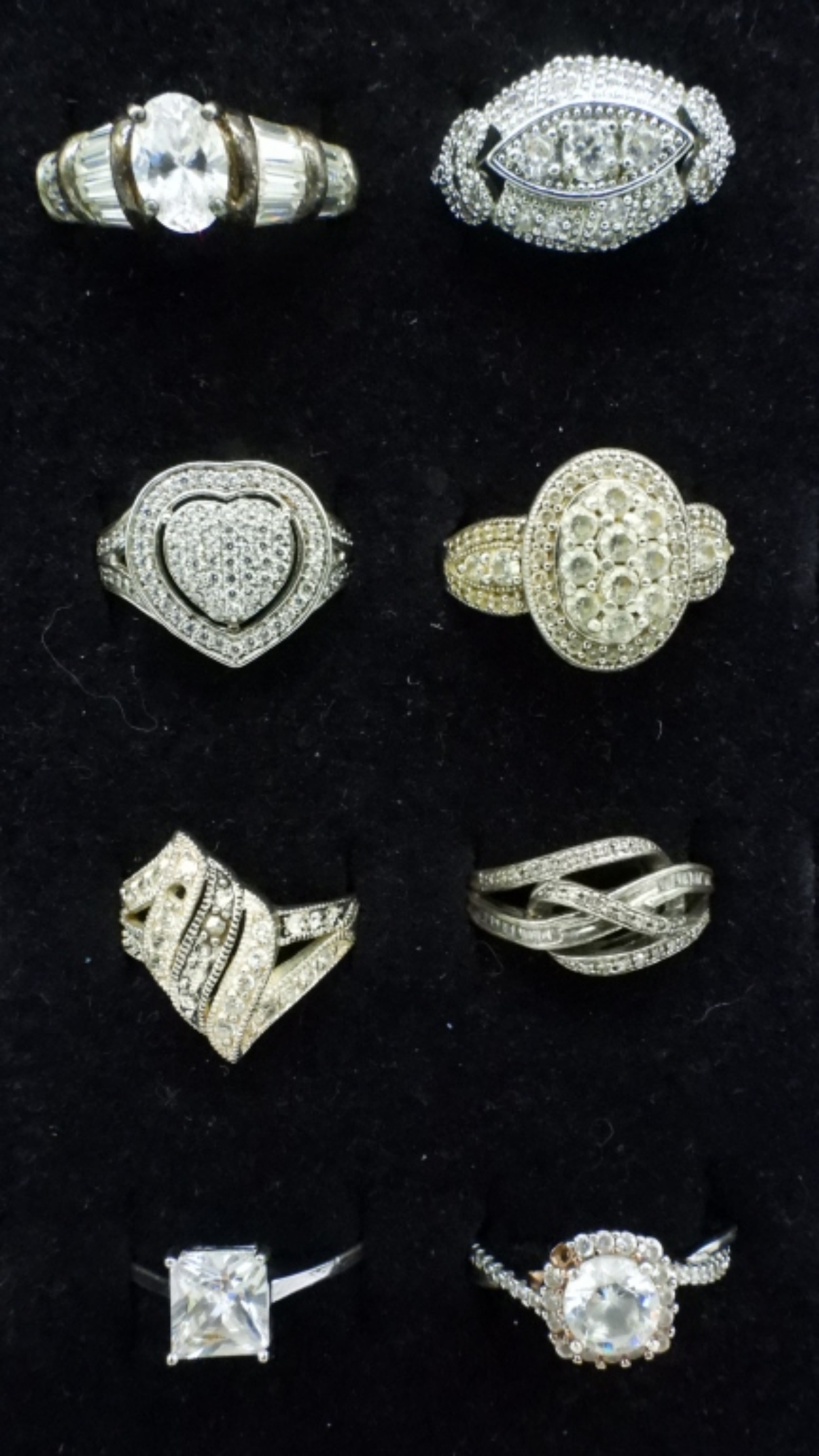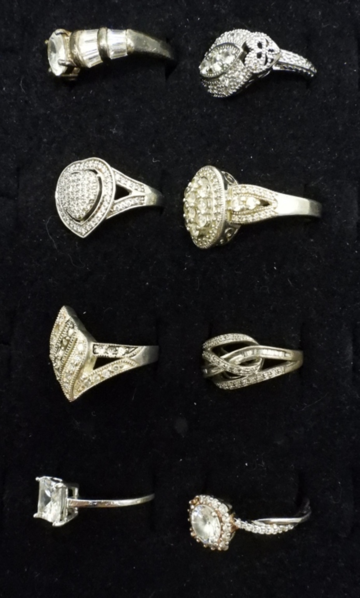 Eight sterling bridal style fashion rings. Sizes 5-10. Several rings are missing some gemstones. See photos.