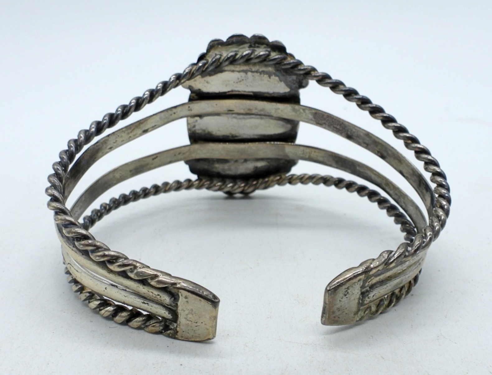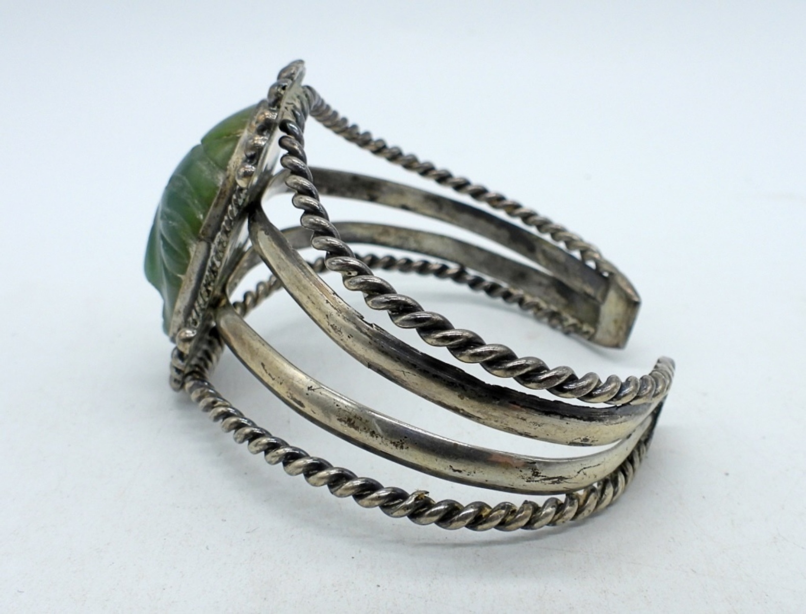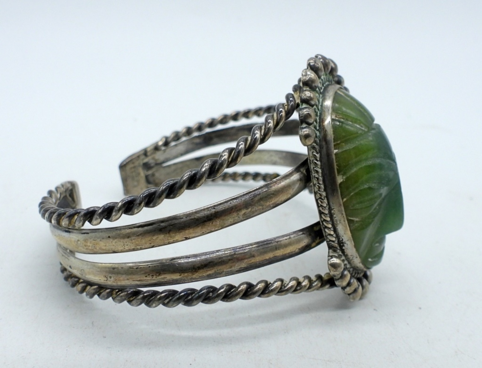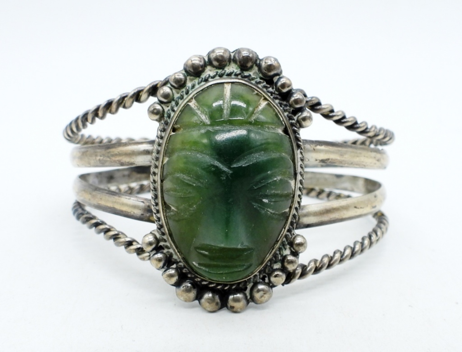 7.5″ “Mexico Silver” cuff style bracelet with large jade mask gemstone. 1.5″ long. (24.7 dwt)