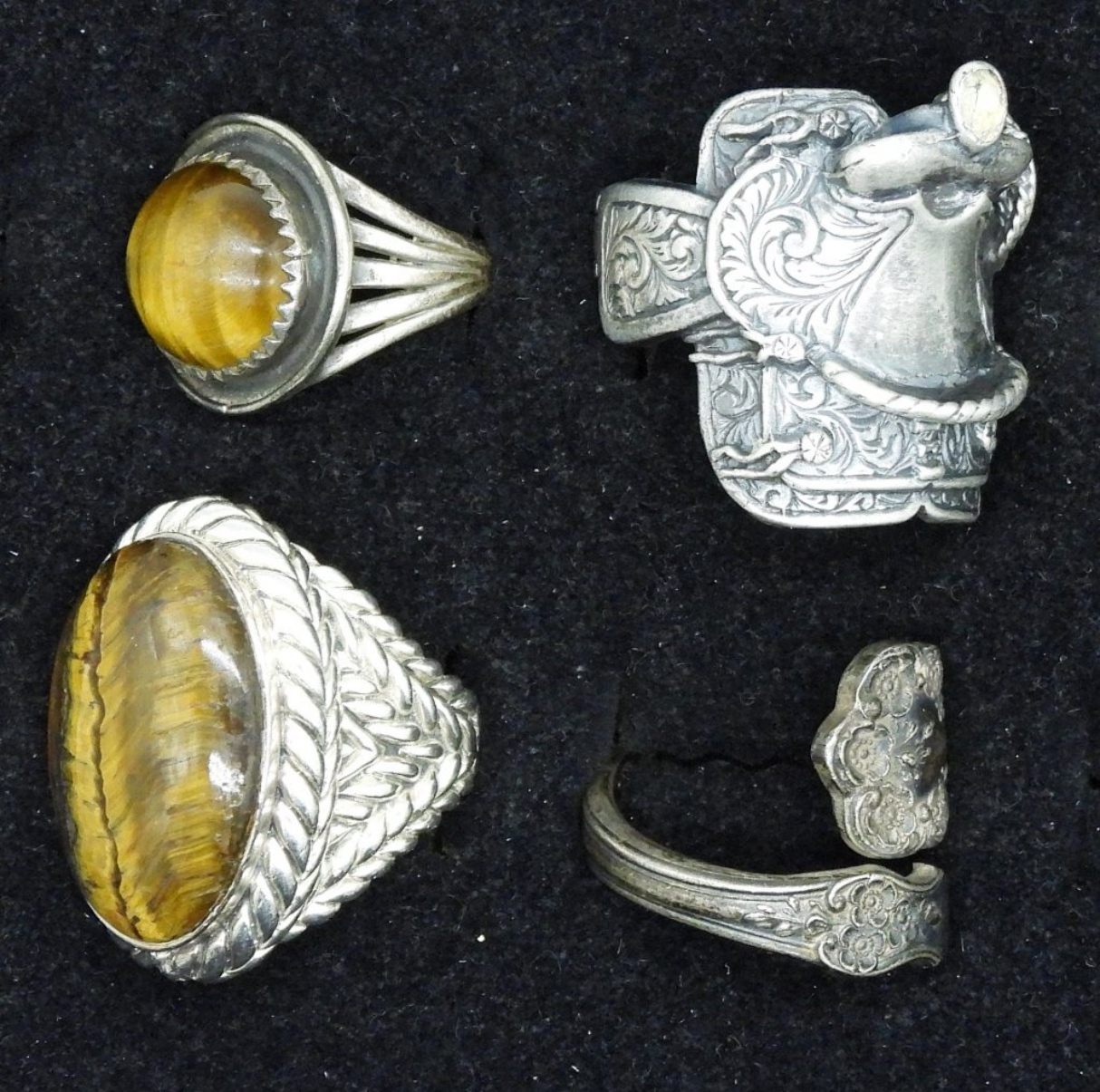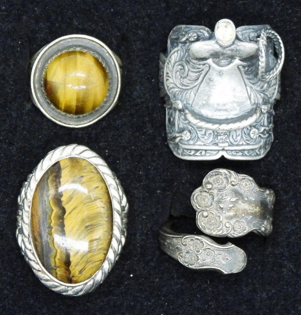 Four sterling rings. Two have tigers eye gemstones. One saddle shaped. Sizes 4.5-10 (31.2 dwt)