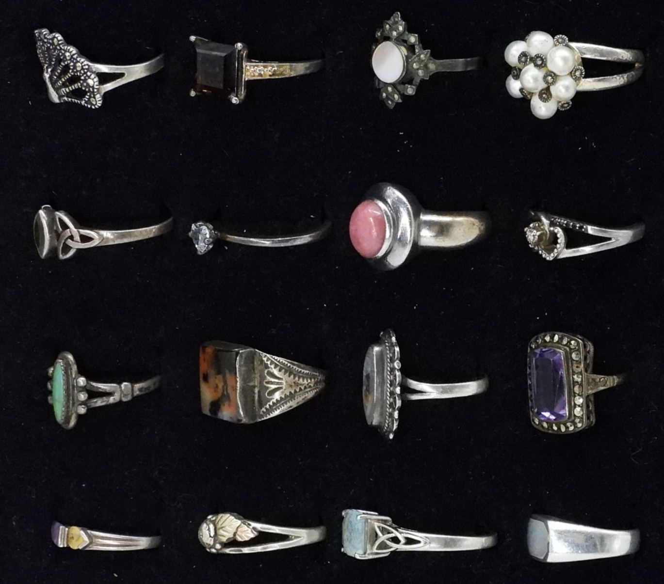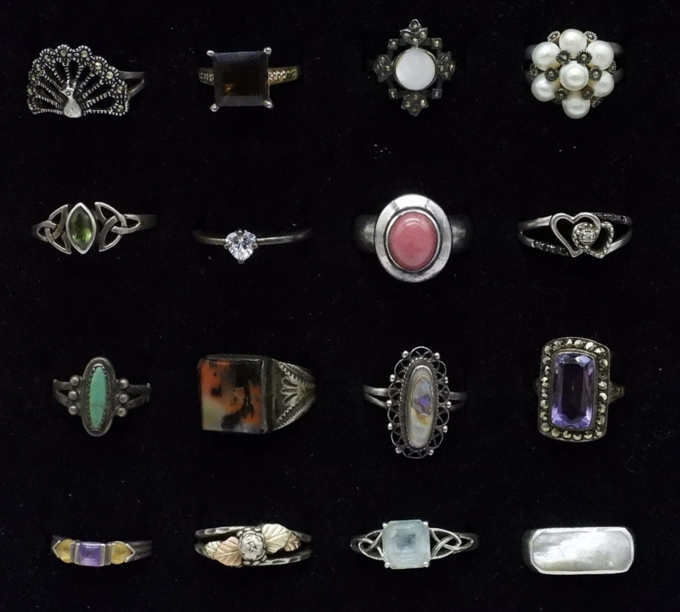 16 sterling rings. Smokey Quartz, Abalone, Amethyst, Rhodochrosite & More (36 dwt)