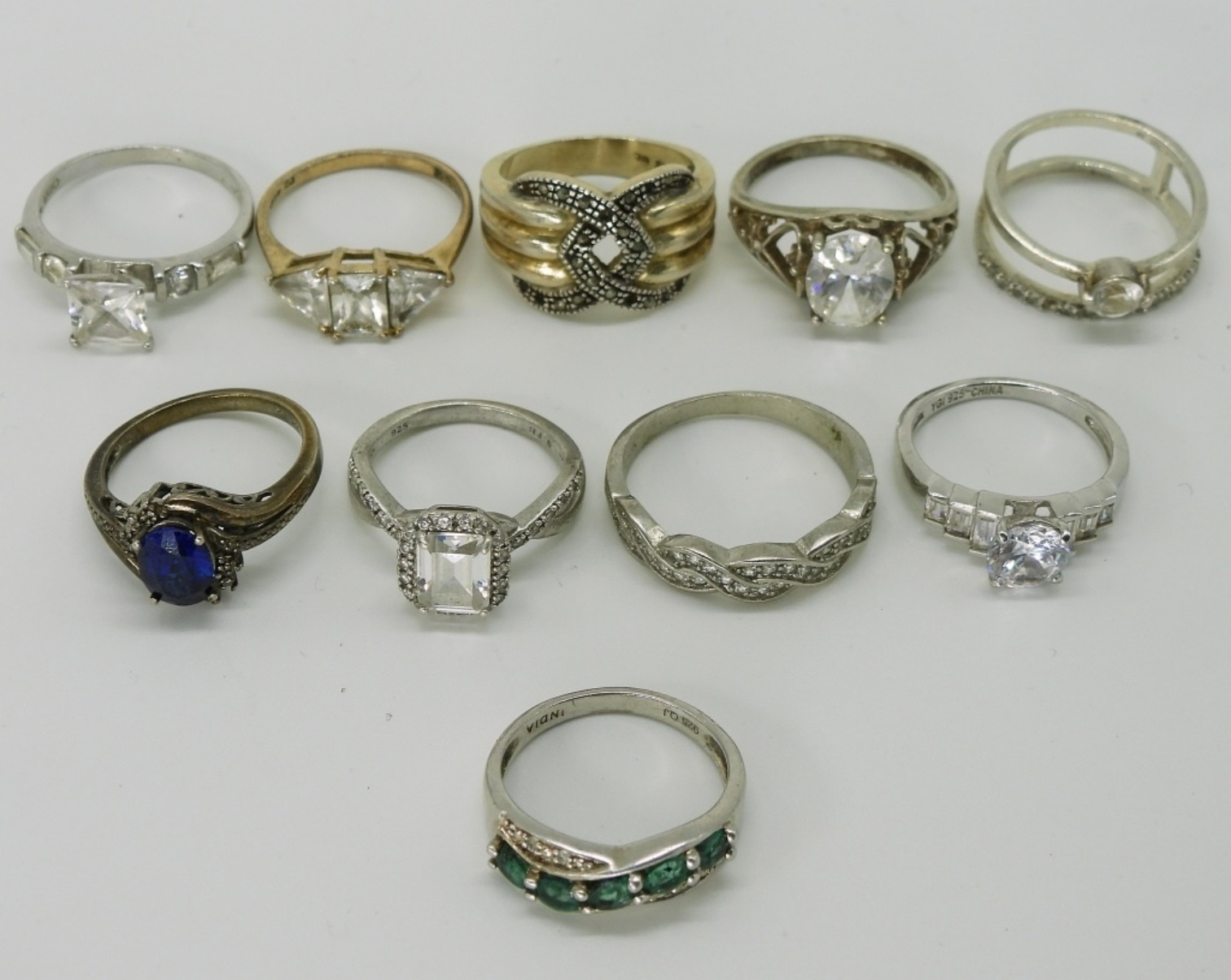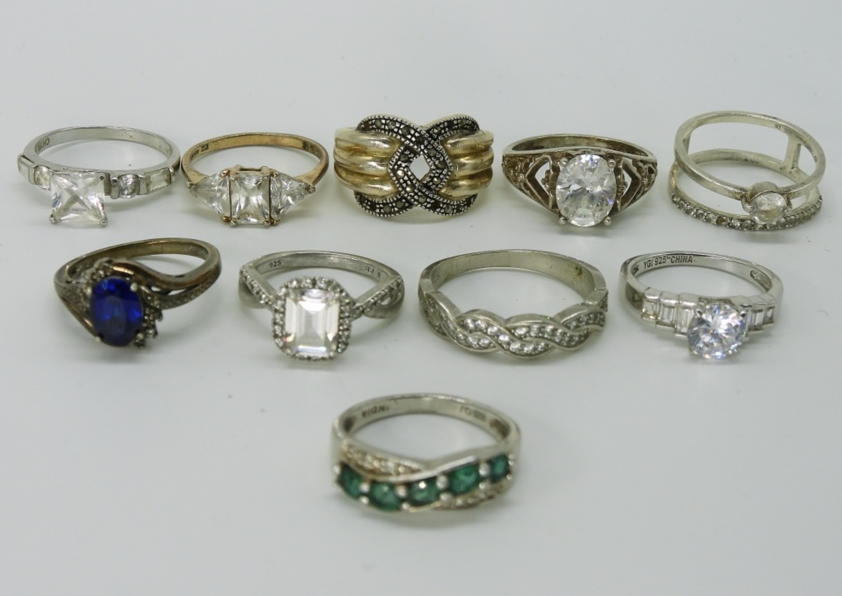 10 sterling gemstone rings, sizes 6-10. Simulated diamonds, emeralds and sapphire. (21.4 dwt)