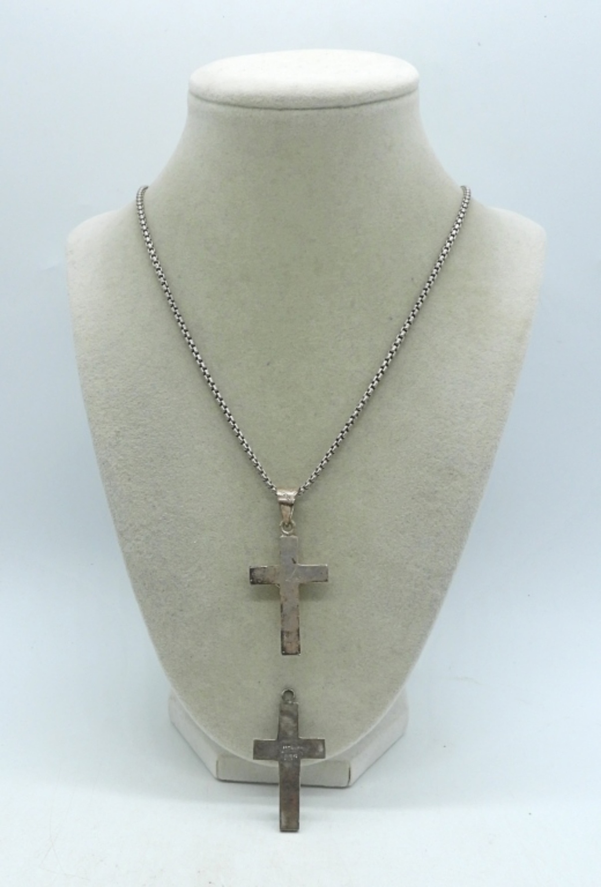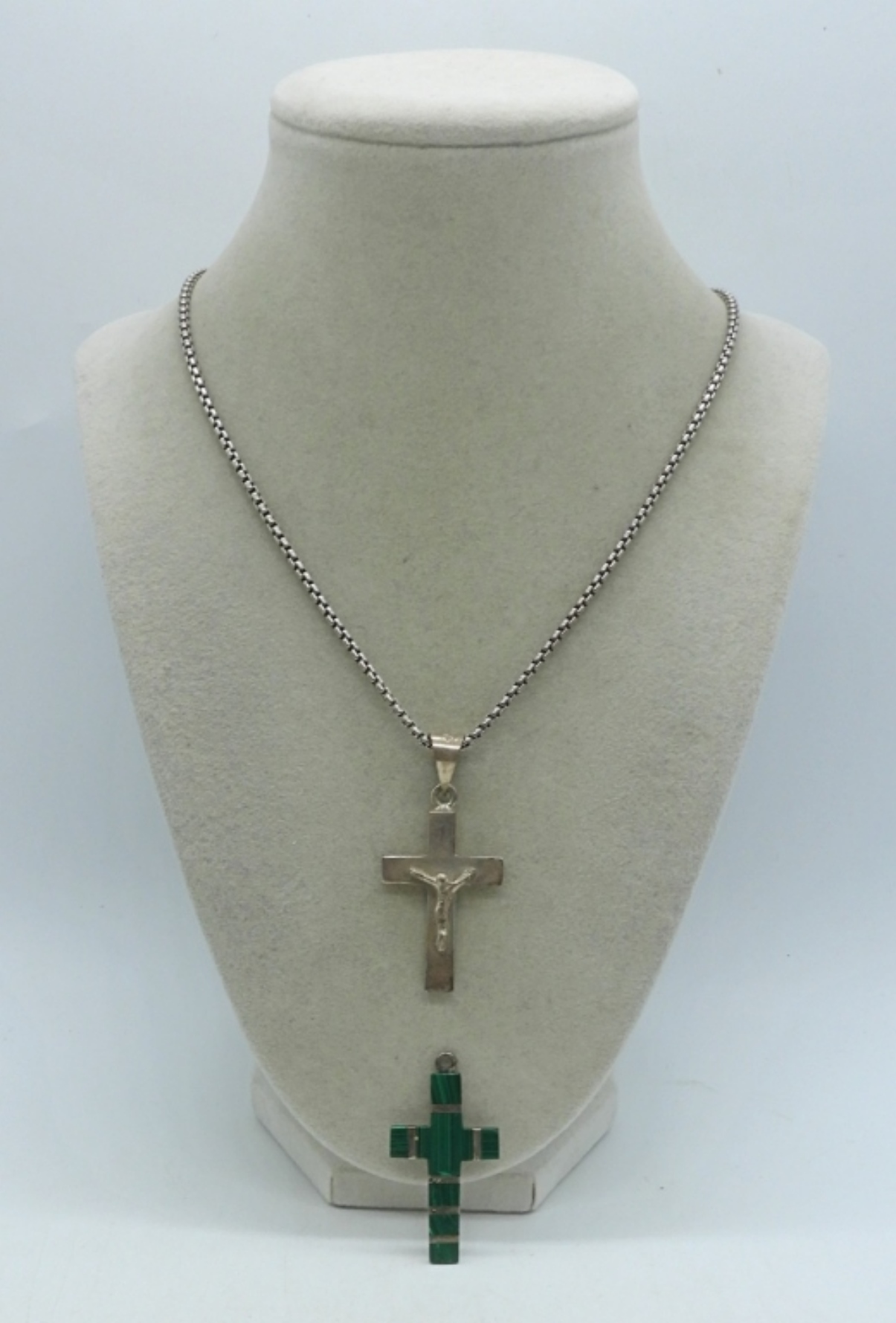 Taxco sterling cross pendant on a 20″ sterling chain. Marked “TD-111 Mexico 925”. Malachite inlay cross pendant marked “Mexico ?? 925″, middle wording is illegible. Pendants are 2”. (19.6 dwt)