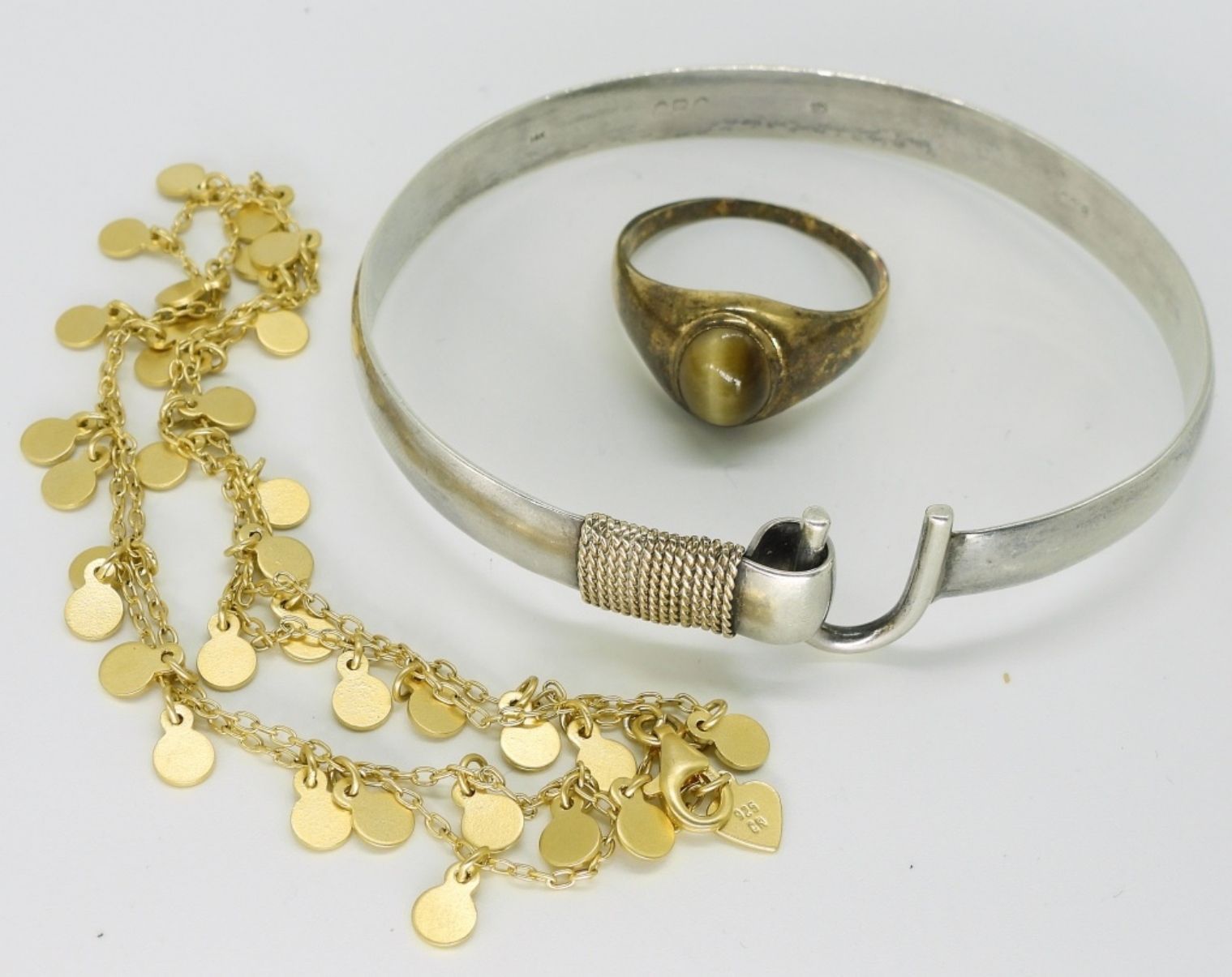 Sterling bracelet with gold tone accents. Gold tone sterling cats eye ring, size 13. Petite sterling gold tone necklace, 18″. (21.9 dwt)