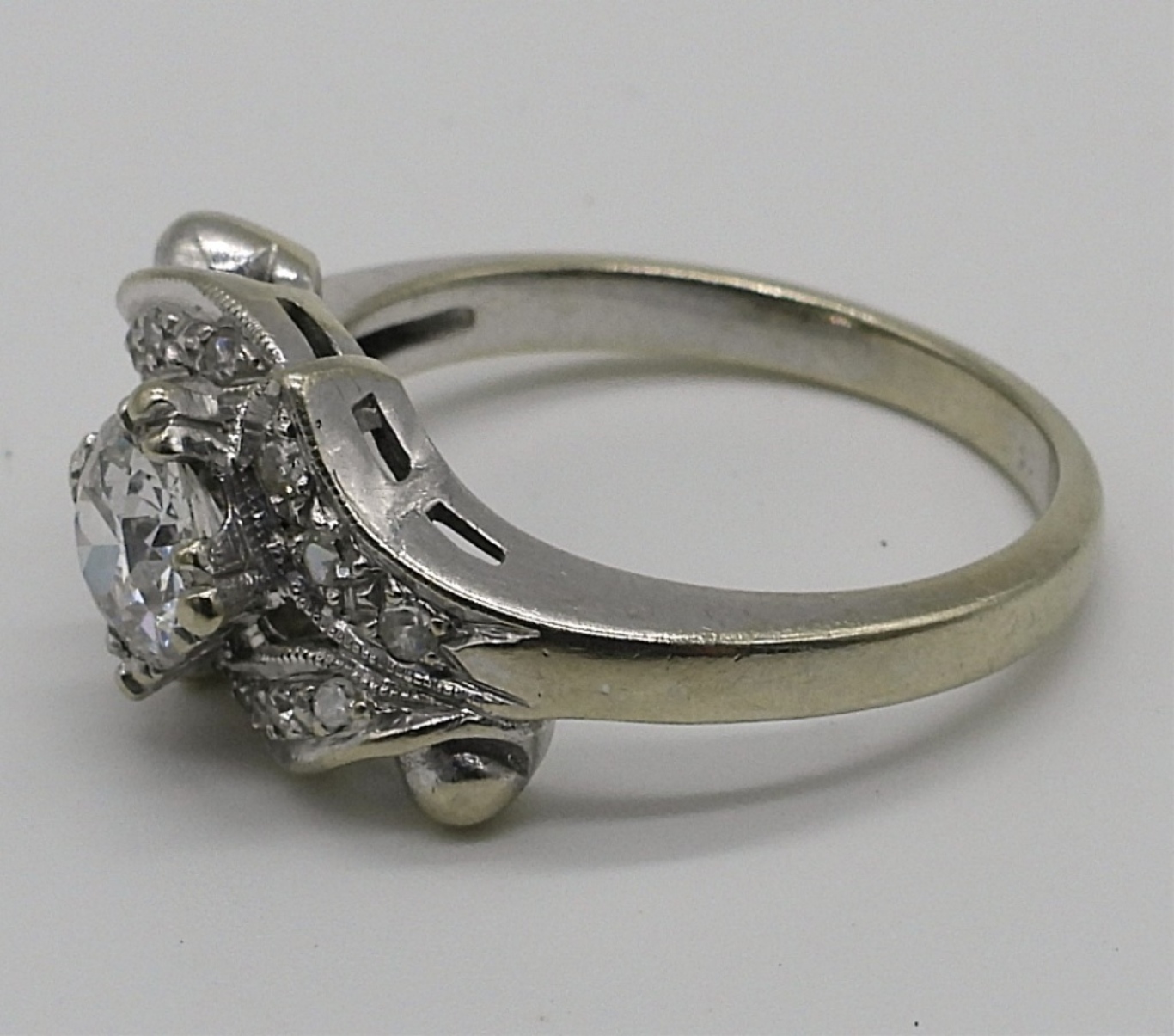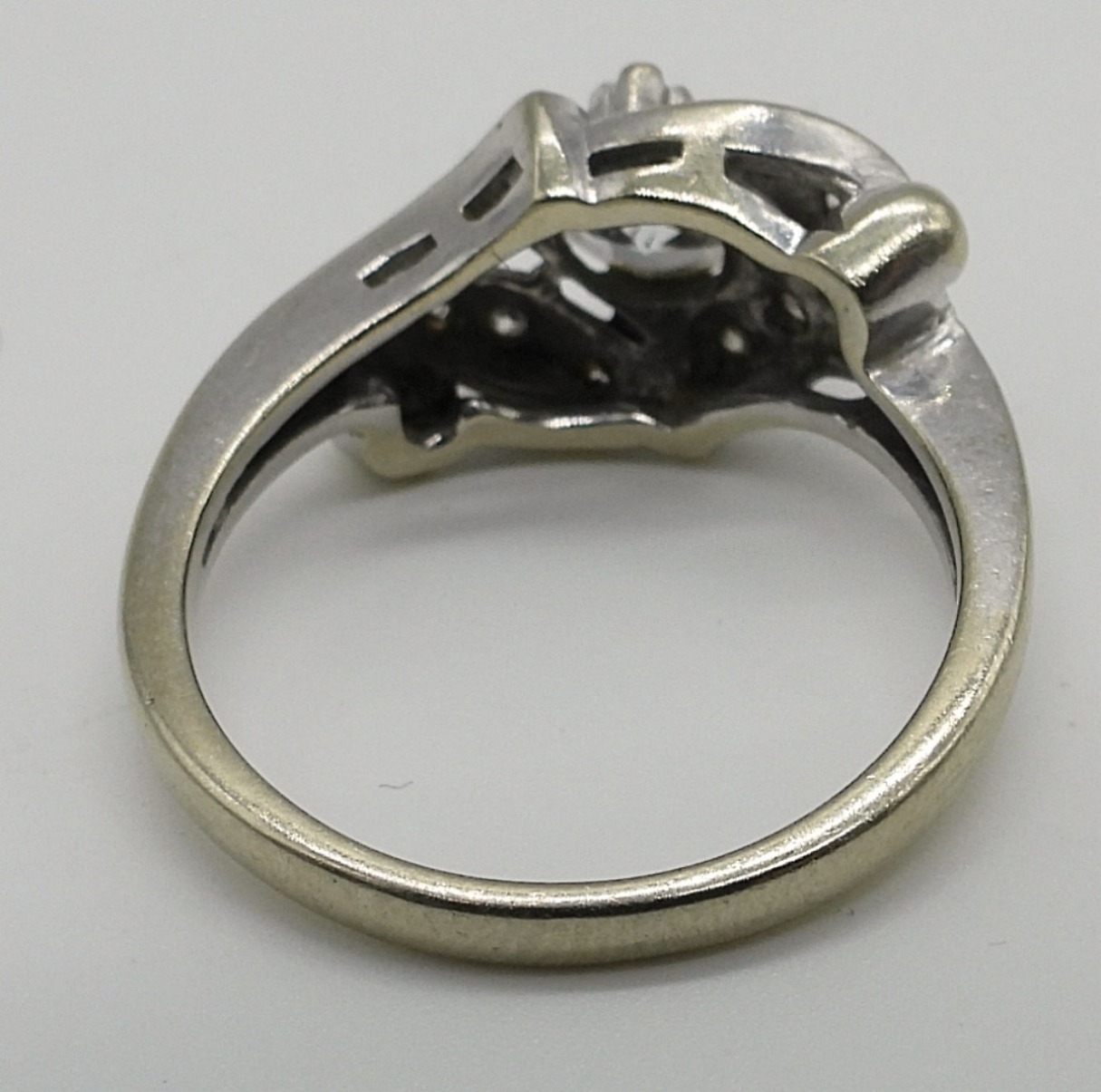 14k white gold, 1/2 carat center diamond. Several small side diamonds. Size 6. Incredibly Gorgeous Diamond! (3.7 grams)