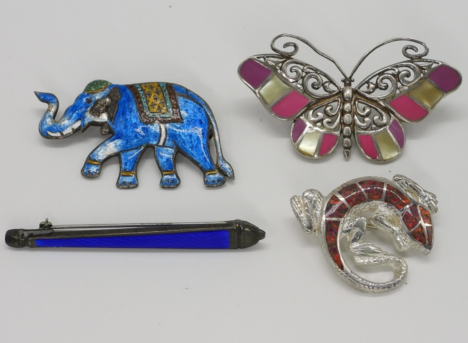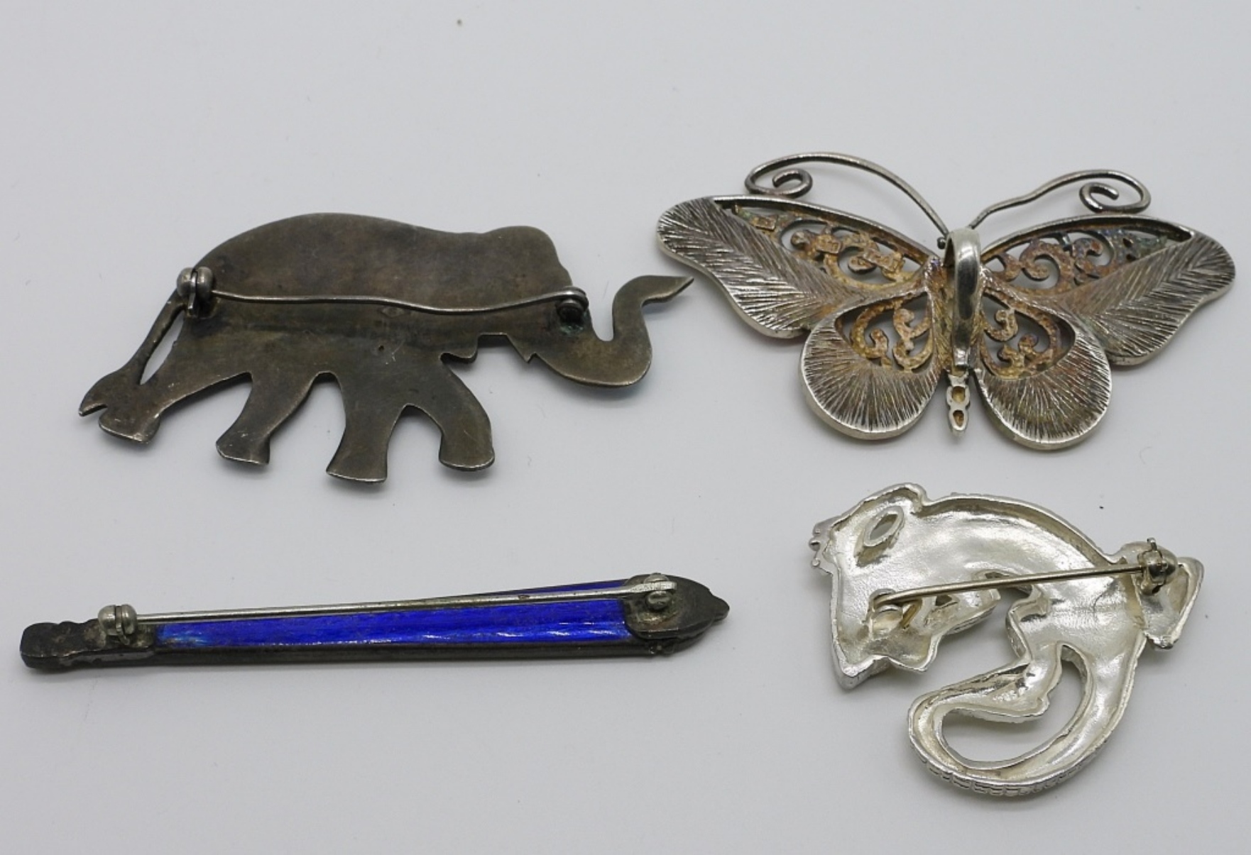 Three sterling, vintage brooches. With enamel and inlay. One sterling butterfly pendant. 1.5″-2.5″ (28 dwt)
