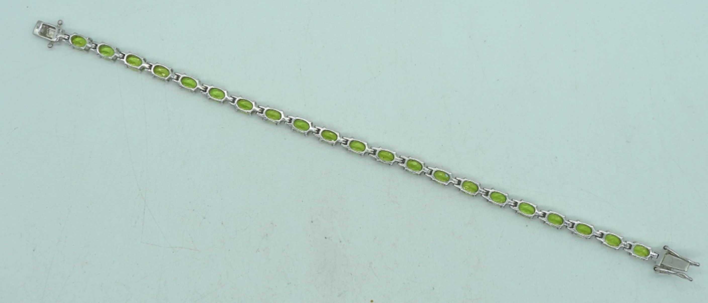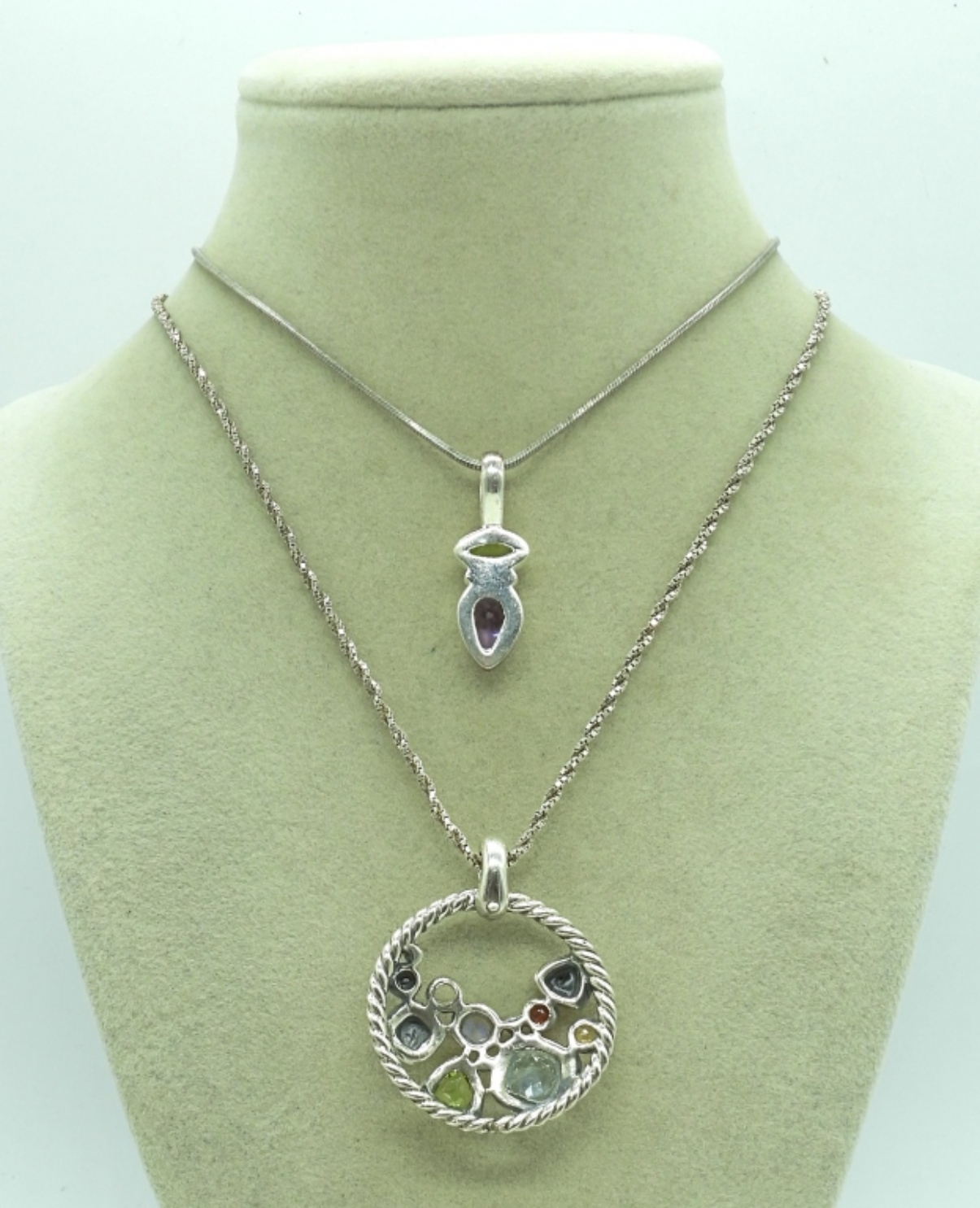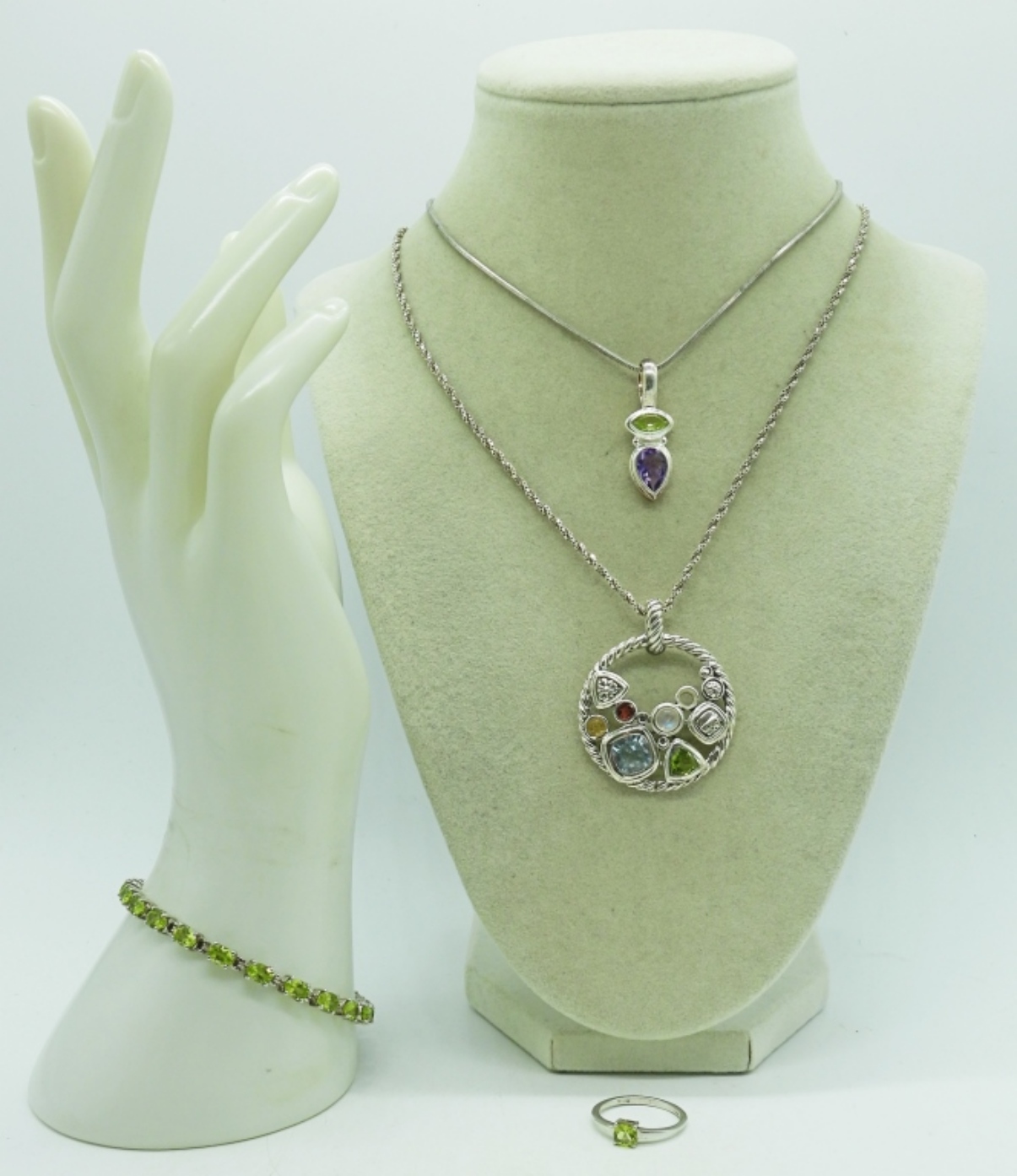 Peridot bracelet, 7″ & Ring, Size 7. Peridot, amethyst, moonstone & blue topaz necklaces, 14″ & 24″. (26.2 dwt)