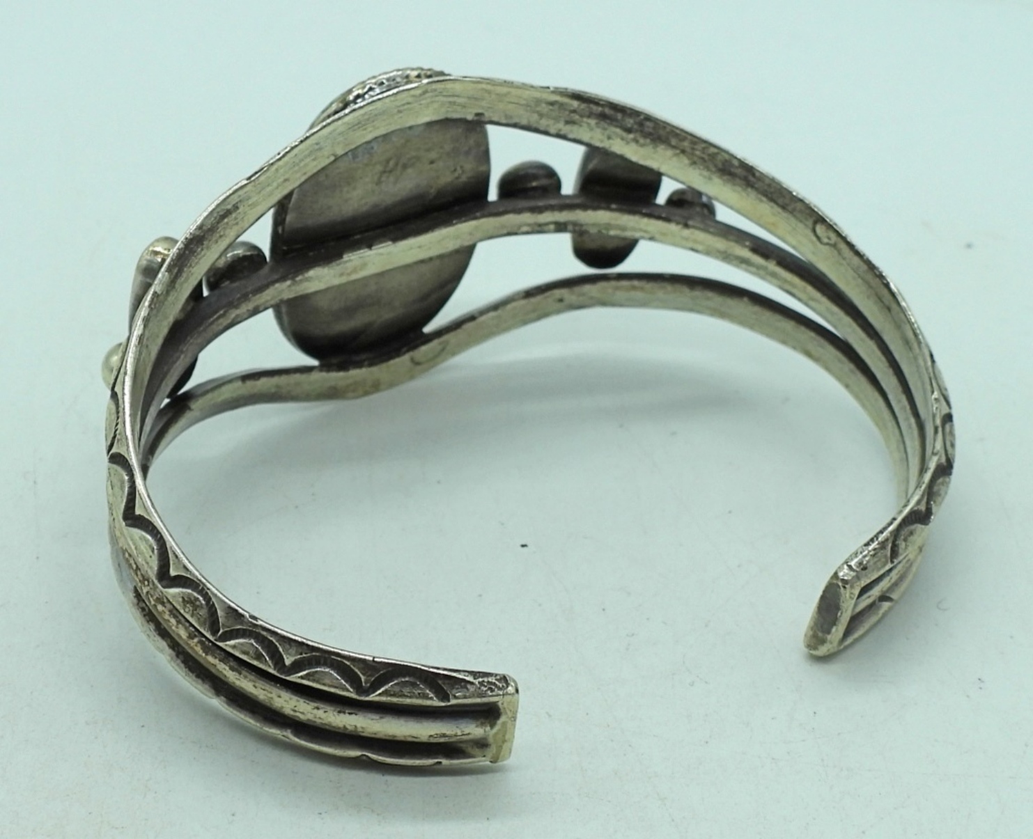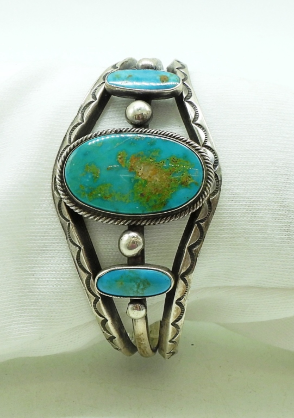 Sterling cuff bracelet with three turquoise gemstones. 7″. (24 dwt)