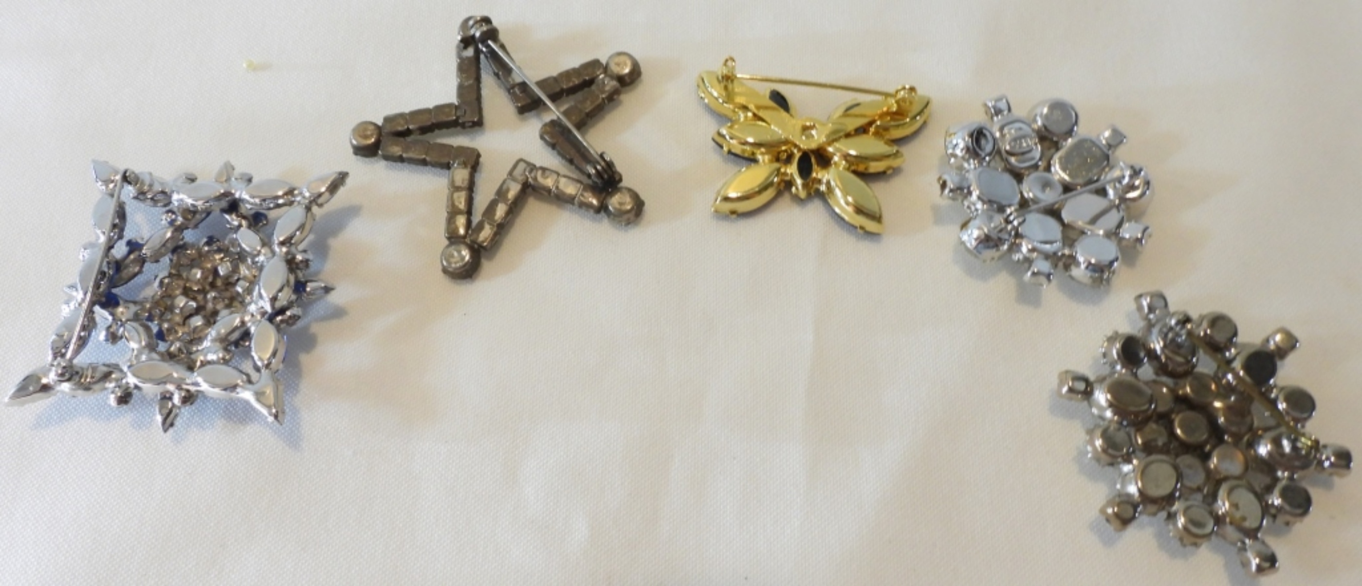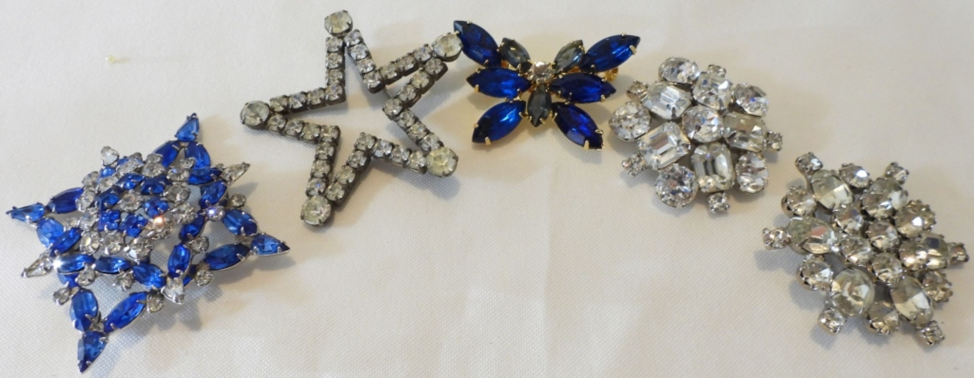 All the brooches are between 1″ to 1 1/2″ long, 3- all white stones, 1- white and blue, 1- blue