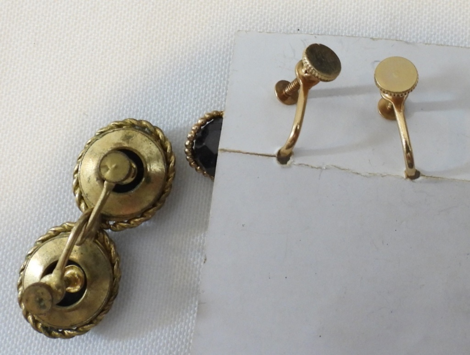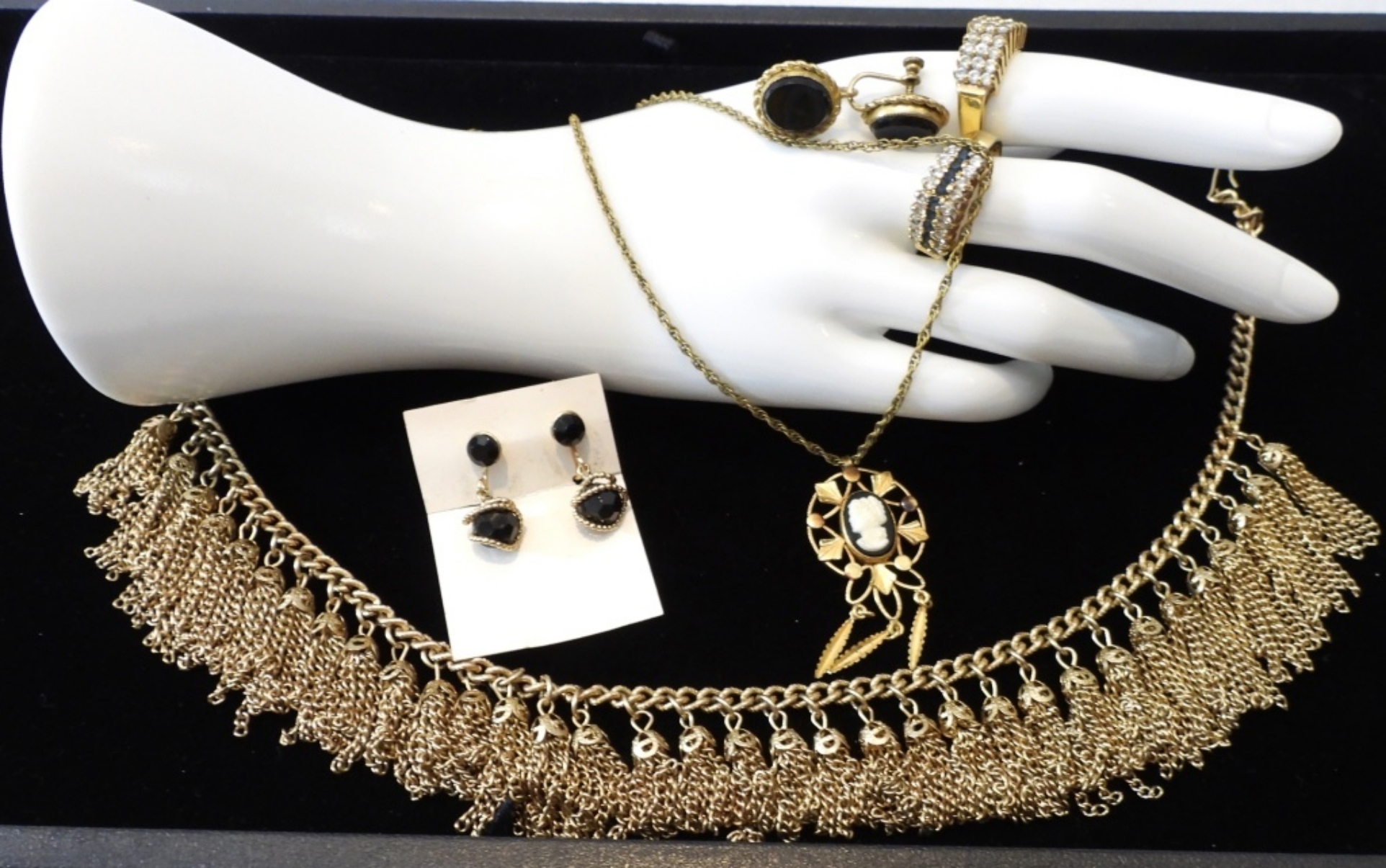 2 Gold-tone necklaces 1- is a cameo 18in long, the other is 17″ long with a hook clasp. 2 sets of screw-back earrings, 2 ring, sizes 8 and 10