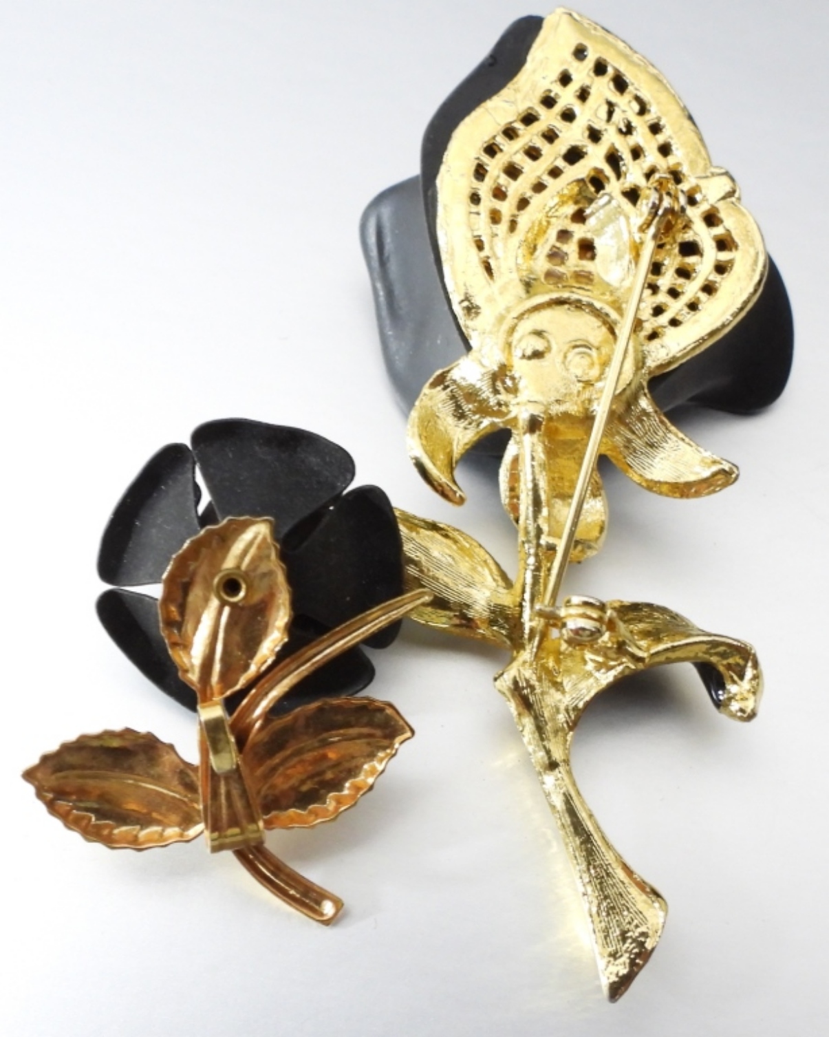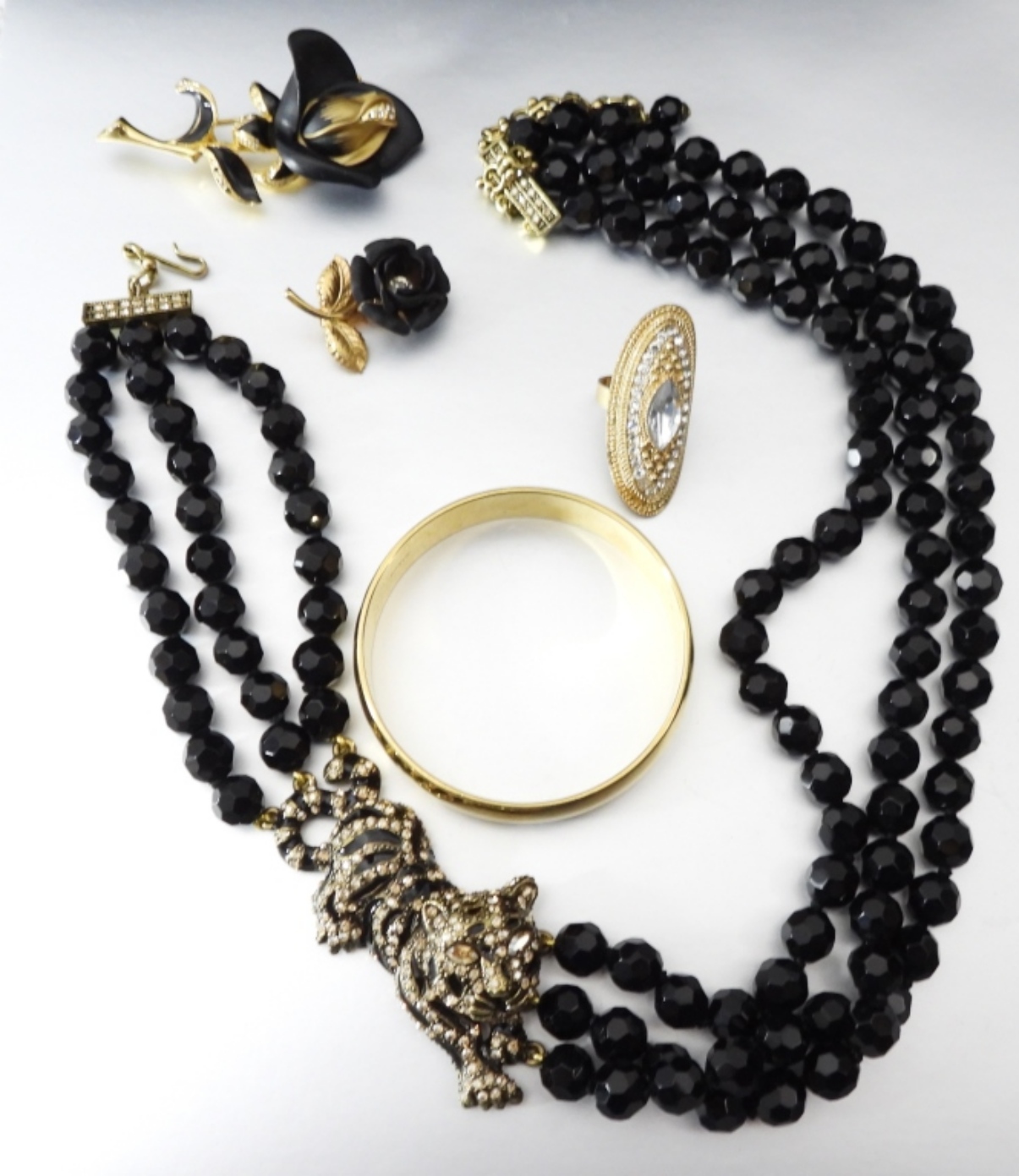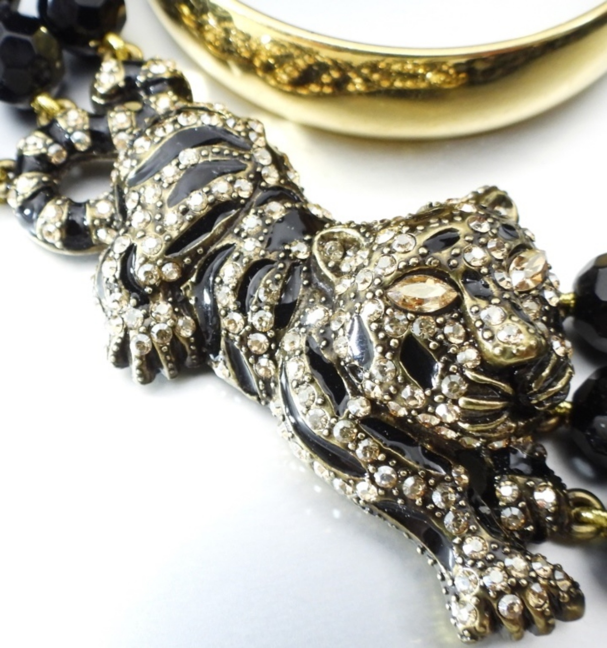 The tiger necklace is about 20″ long with a hook clasp. Made by Heidi Daus, 1 bangle, 1 adjustable ring. A rose pin about 3″ long, a rose pendant under an 1″ long