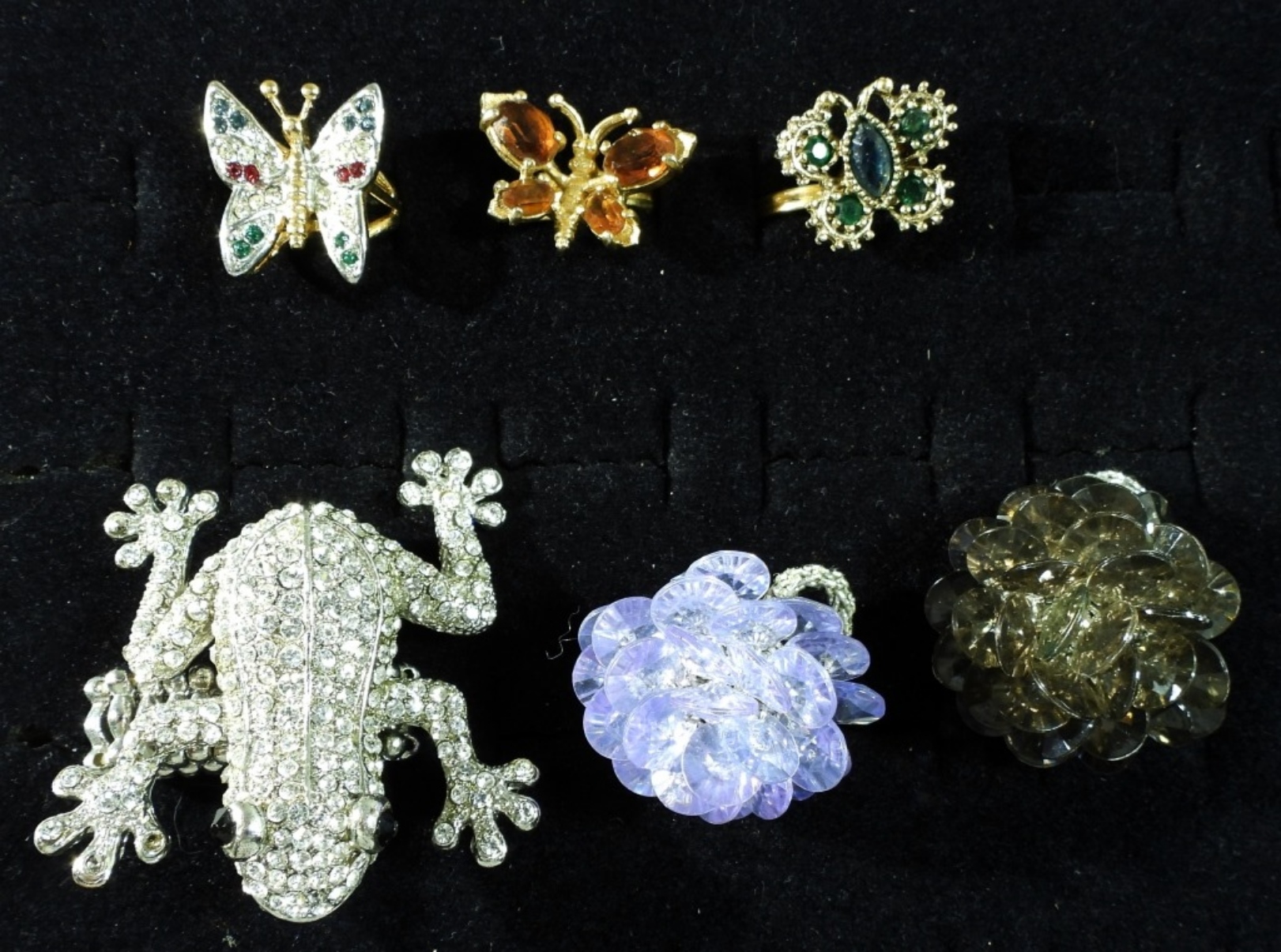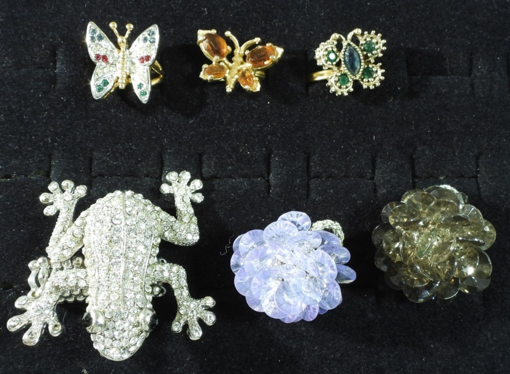 Stones untested Sizes 4-13 (3) Butterfly rings. (1) Frog stretch ring. (2) Flower stretch rings
