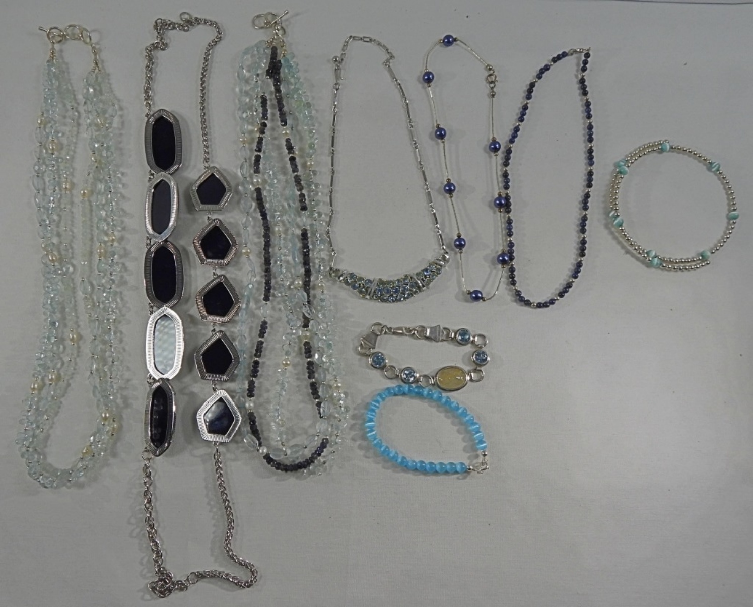 8 Necklaces, 2 Bracelets, Different shades of blue with some silver tones, lengths are from 15 1/2″ to 34″