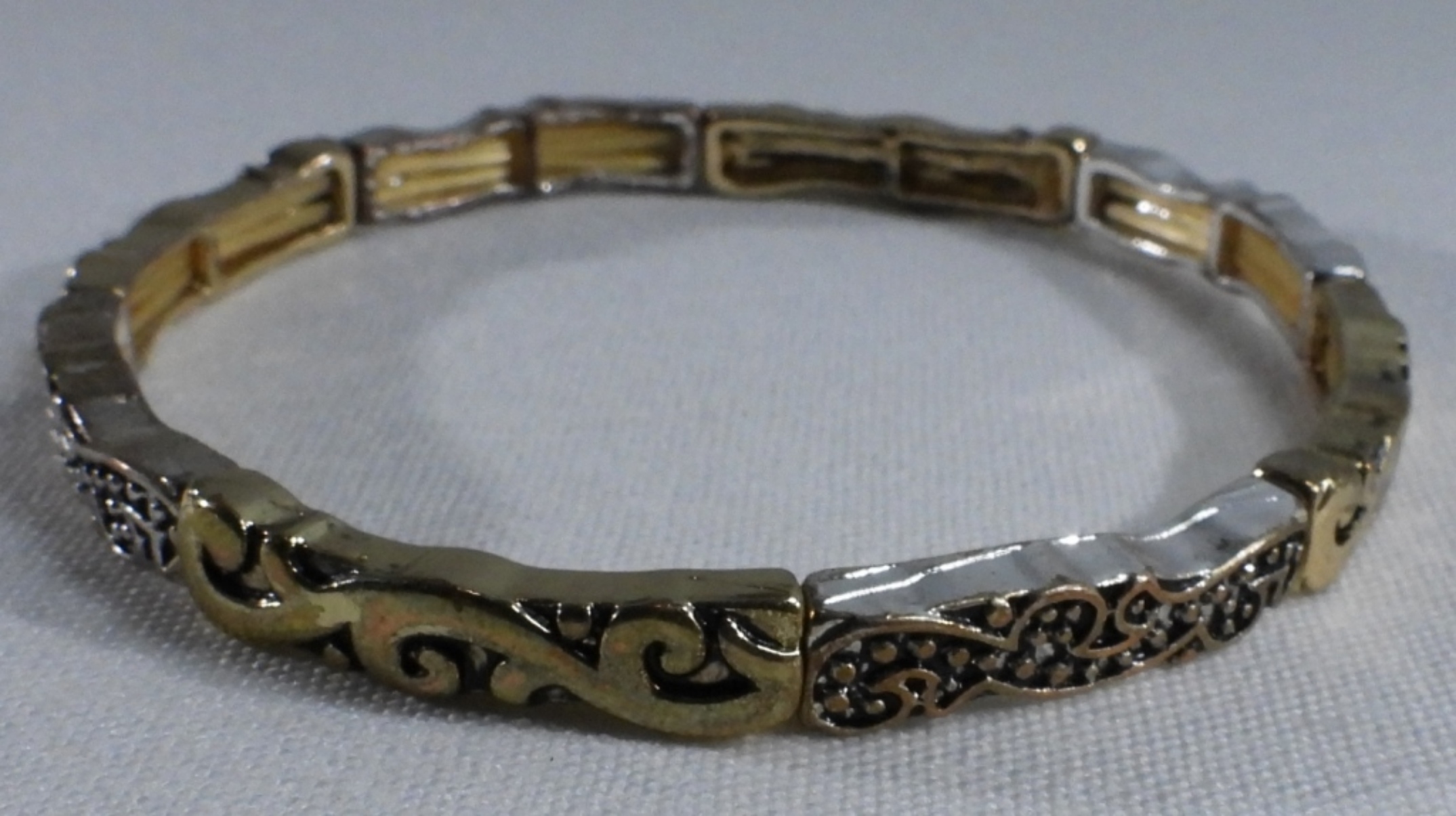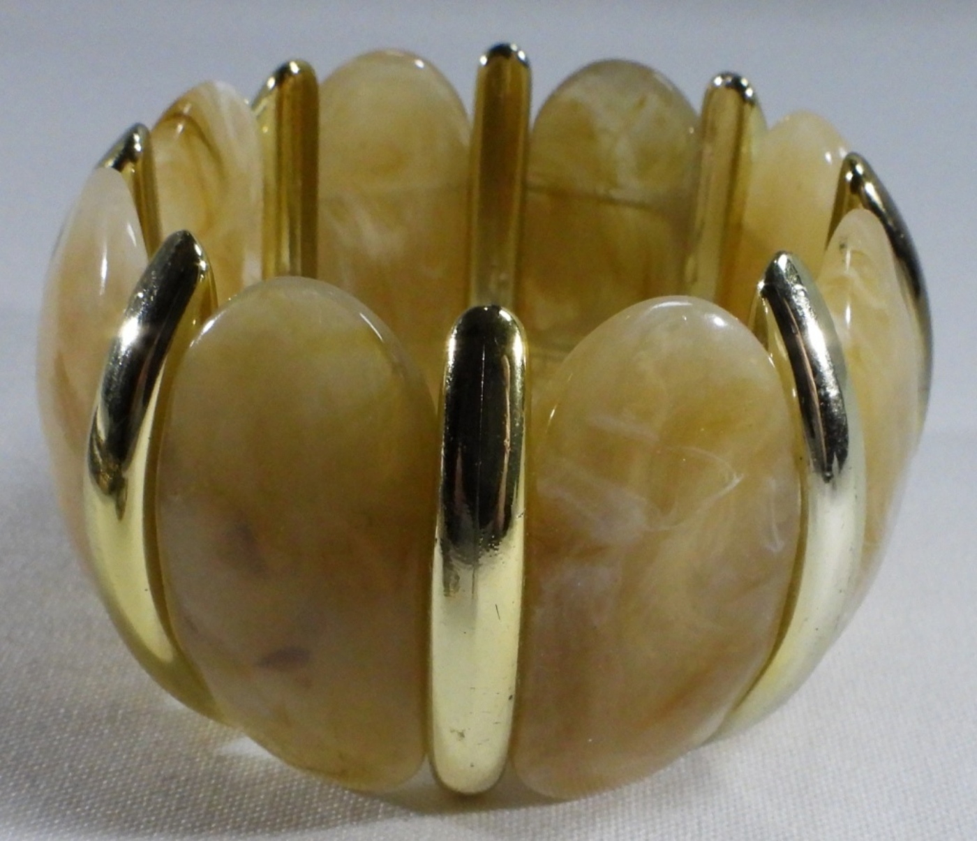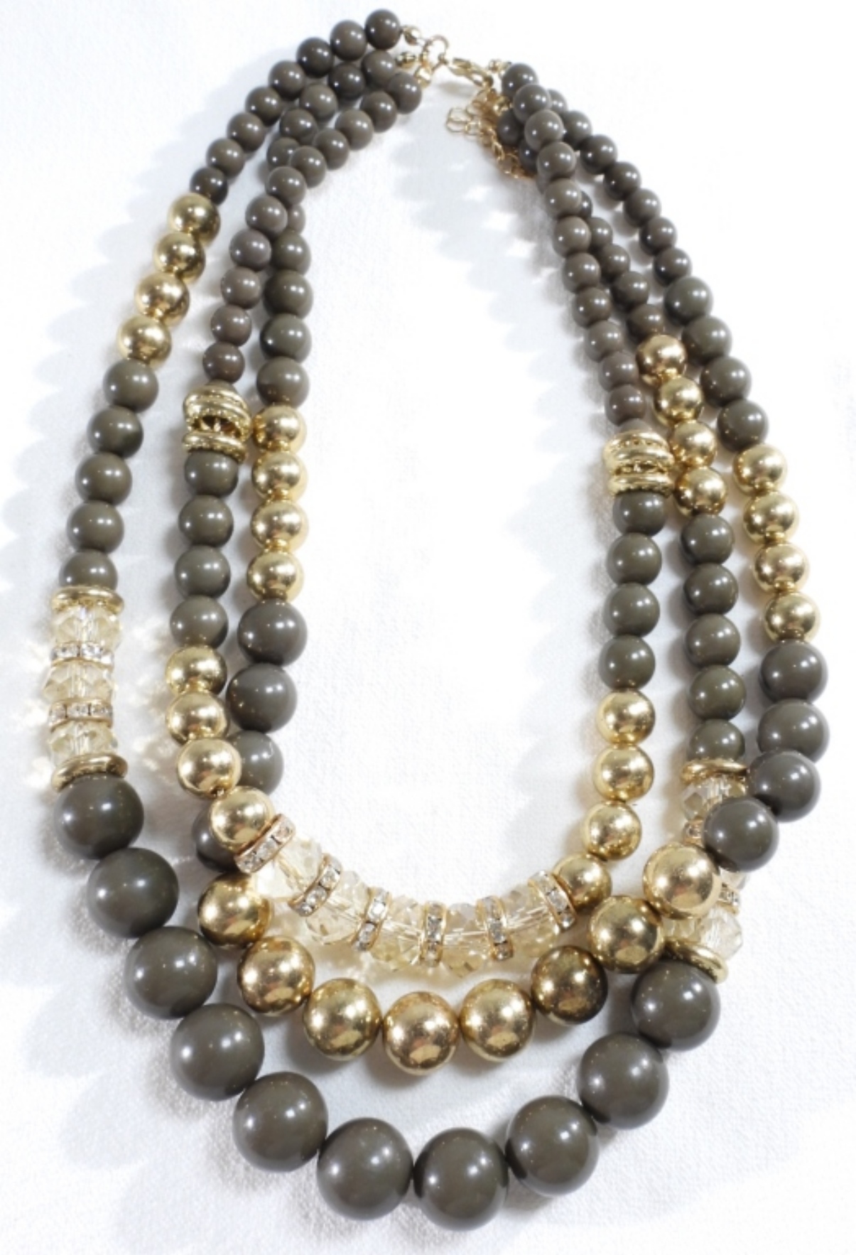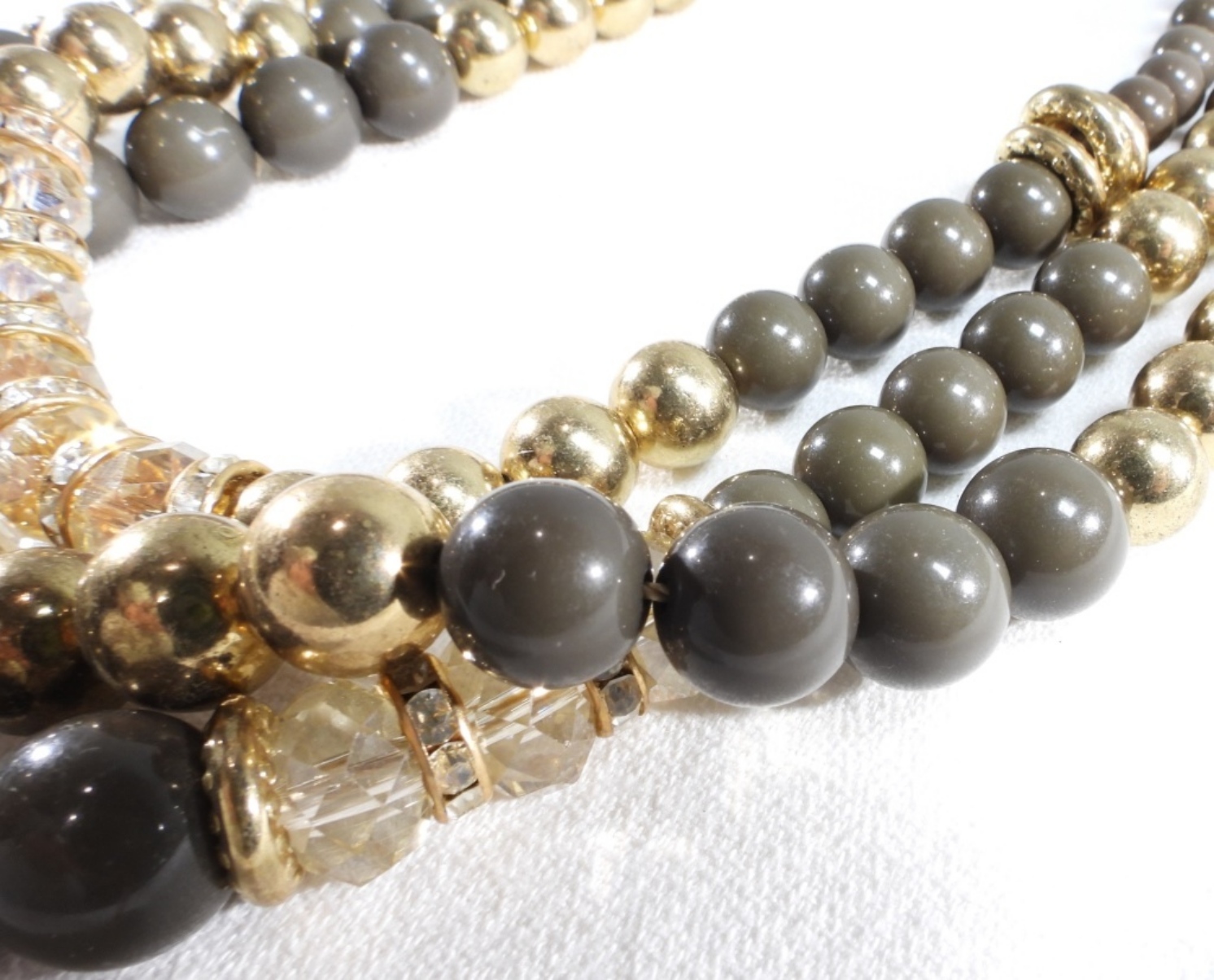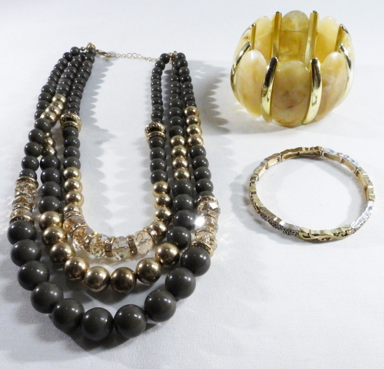 Gray and gold-tone beads. 1) Light tan and gold-tone beaded bracelet. 3) silver tone beads
